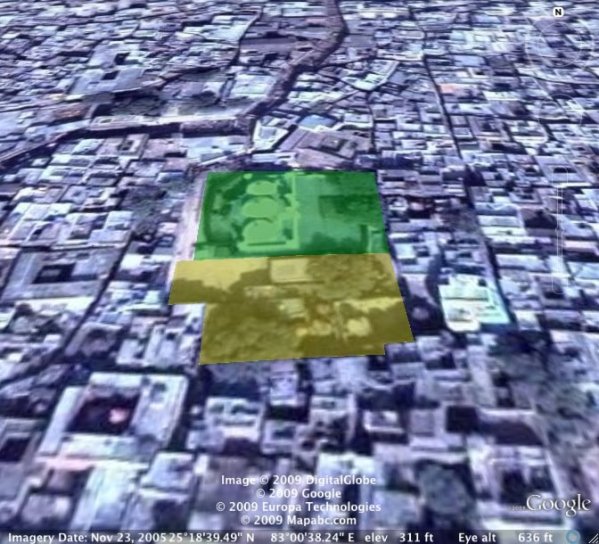 The adjacent Gyanvapi (with the three large domes) and Kashi Vishvanath complexes marked out