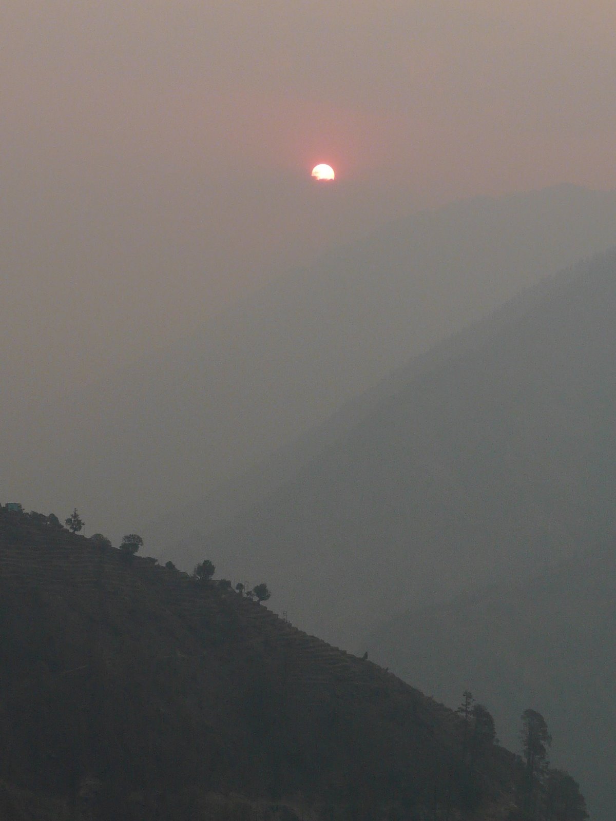 The biggest problem with hiking during this season (the beginning of summer), and especially this particular season, was the smoke due to forest fires. Some people contended that these were uncontrolled forest fires raging all over Garhwal, others that villagers had set these fires to burn slopes for their livestock to forage on. It was probably a combination of both, but the result was that the whole of the Garhwal region was smoked up to an extent I had never seen before in my life, and neither had many of the people I spoke with on the way. The smoke in the air became apparent as soon as I entered the foothills at Rishikesh, and continued all the way up, everywhere I went! It was quite crazy – one could barely see the next hill clearly.