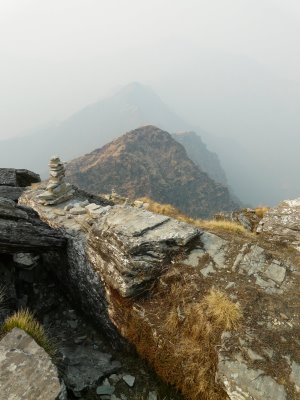 … and a little clearer the next morning, but not by much. The snow-covered Chaukhamba peak is just about visible a little above and to the left of the cairn closest to the camera.