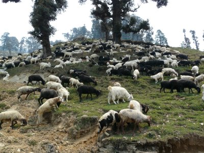 Sheep on the slopes of Chandrashila hill, which Tungnath temple is on. You can see the trees in the background are hazy because of the smoke