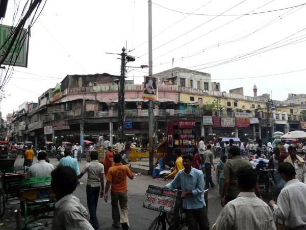 Fatehpuri Chowk where Khari Baoli road begins, looking towards Fatehpuri Mosque (which is directly behind the set of shops visible at the center of the image). One minaret of the mosque is sticking out to the right
