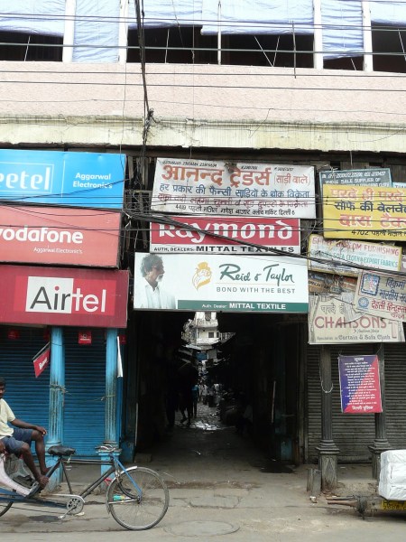 Entrance to a commercial space in the Khari Baoli area hidden behind the high facade of a Church Mission road-facing building