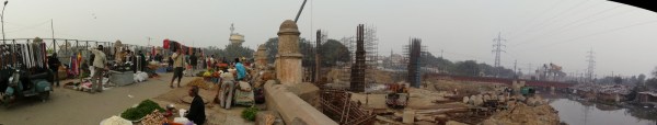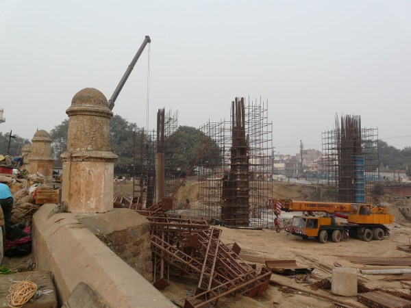 Here are a couple of images of construction on the other side … looking westwards, taken from the parallel bridge. The dome of Khan Khana’s Tomb is visible in the background.