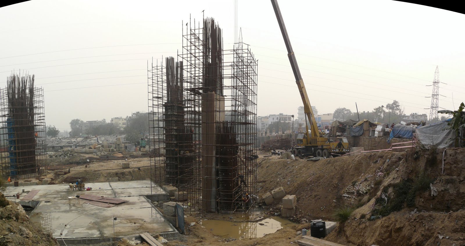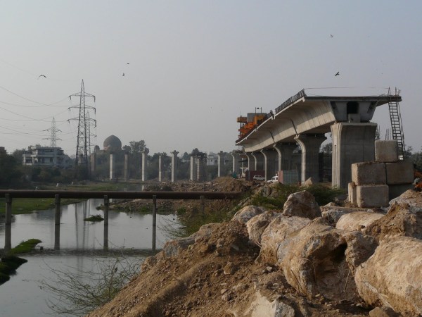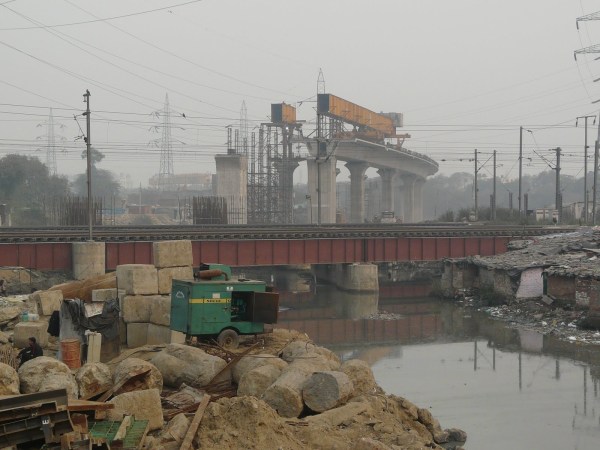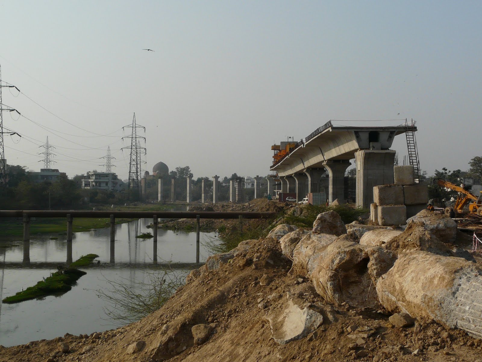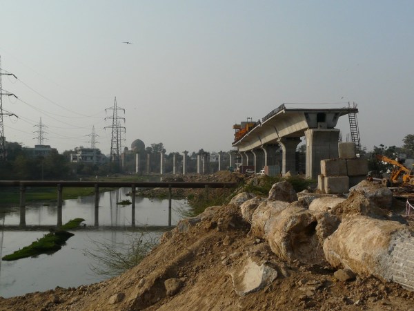 The elevated road construction approaching Barapullah. The main north-south line of the Indian railways lies in front of it. This view is looking eastwards towards the Yamuna from Barapullah
