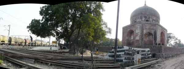 As can be seen from the panoramic shot, a dirt path leads from in front (north) of the monument, which leads to a spot that is used as an informal crossing across the railway lines to the other side, i.e. towards Serai Kale Khan. I saw quite a few people using this path to cross the railway lines (there is no designated crossing on this side of the railways station). There is of course the issue of security vis-a-vis the railway station, since anyone can easily walk from here onto the platform.