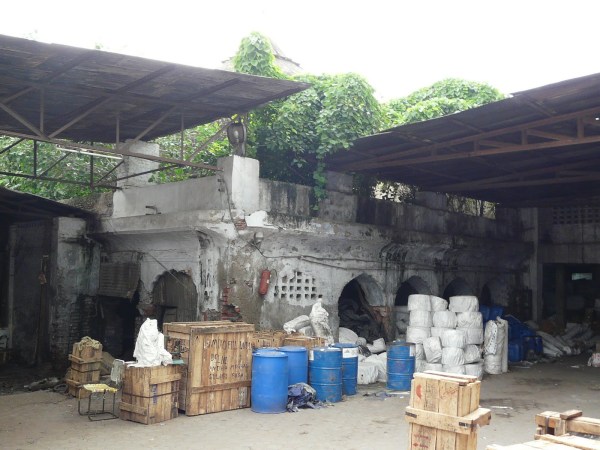 I turned around, and of course the gumbad was encroached on all sides, and people had put up property walls all around the structure, but luckily on three sides you could at least see the original walls of the structure. I asked people at a goods godown (which was one of the surrounding encroaches) if I could take a couple of shots of the place. They allowed me to, but unfortunately the photos I took were overexposed. Here is the best of the lot – you can see the top of the dome of the (probably) late Mughal structure peeping out from behind the tin roofs and foliage.