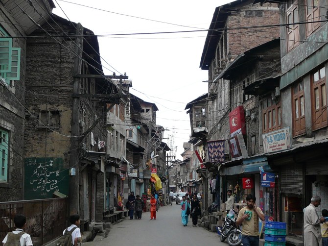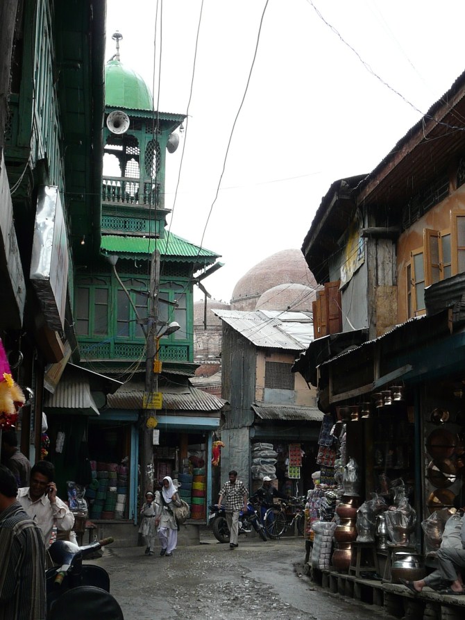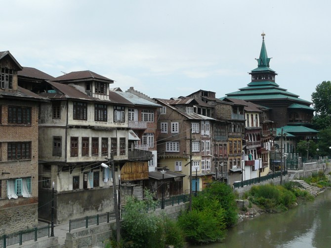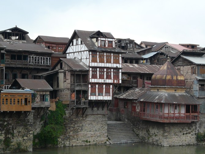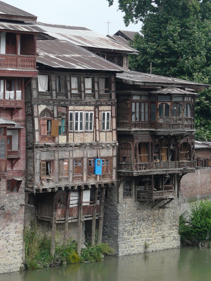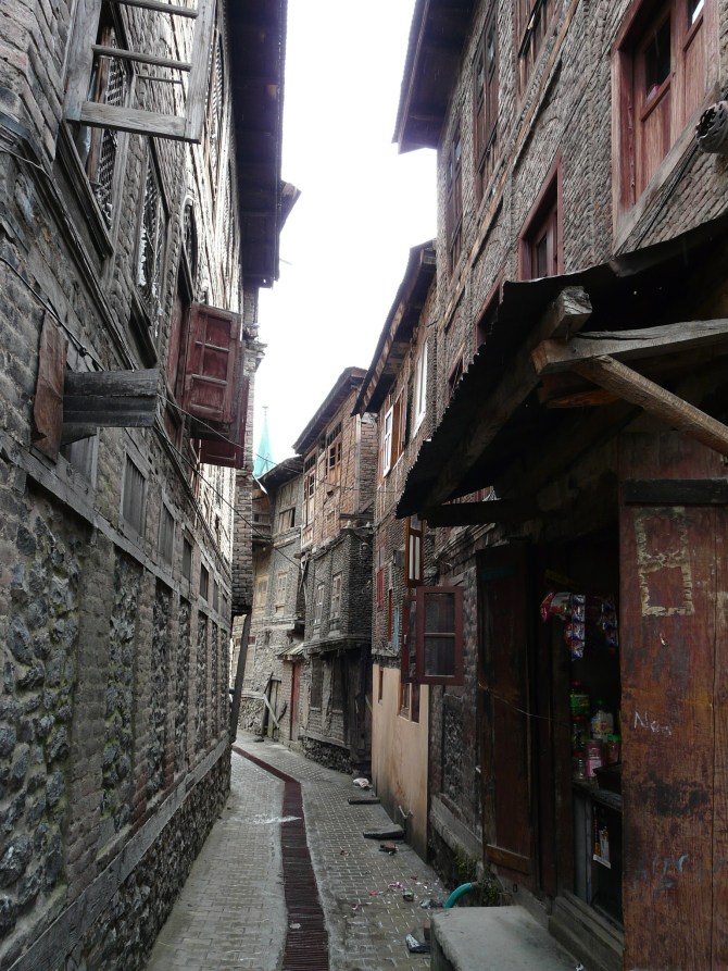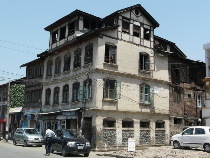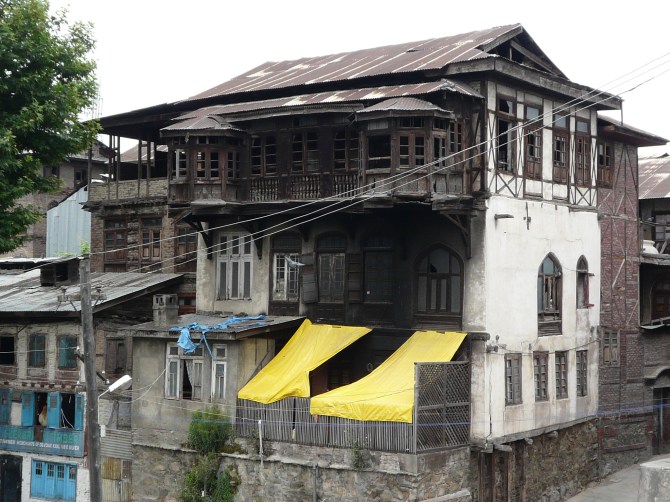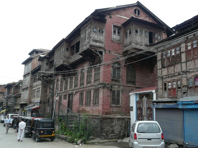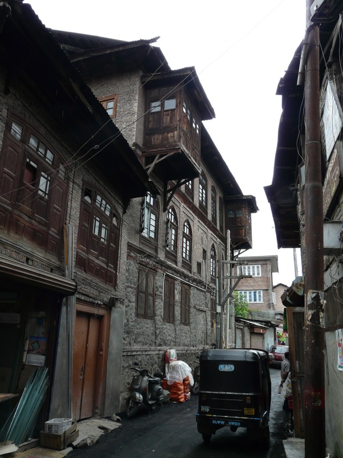 At the level of urban structure the old city is much like other “old parts of town” in the subcontinent – a maze of narrow and winding streets flanked by two to three story high buildings. Like many other such cities, the existing building stock here seems to be mostly of a late-19th c to early-20th c vintage. From the point of view of architectural style though, Srinagar’s old city is quite unique. There is an obvious European influence, but unlike say Old Delhi, where the predominant architectural style of that period is a mix of late-Mughal inspired forms and colonial influences, including western classicism and neo-gothic touches (to which, in the early-20th c, are added flourishes of diluted avant garde styles).