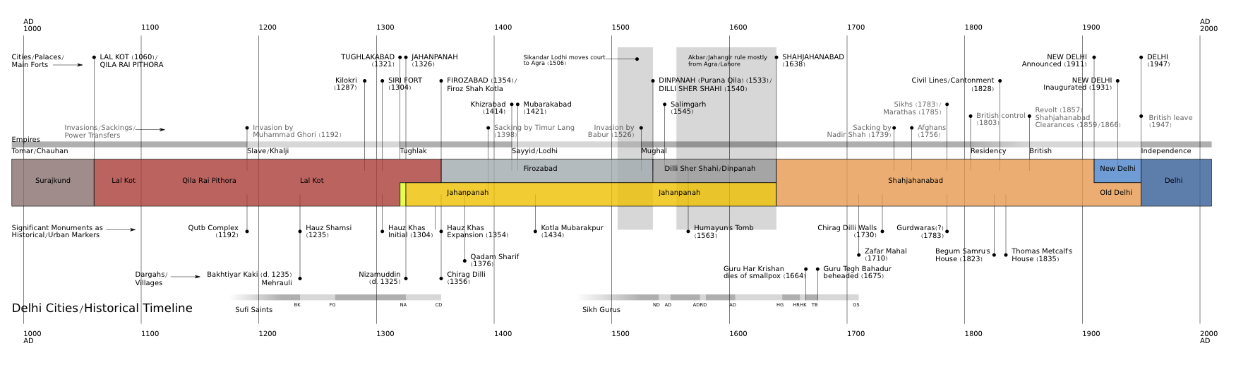 (Note: Slightly technical info in this paragraph) In the svg version, different categories of information are placed in different layers, and so can be hidden/seen together. For example, the “Sufi saints” and “Sikh gurus” layers (visible as the bottom-most pieces of information) are not necessarily vital for an overall understanding of the city’s timeline, and can be hidden for those who wish to. And so on and so forth.