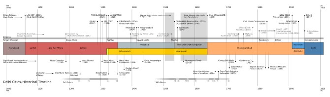 I recently created a timeline for Delhi and it’s various “cities”, to help me place historical figures and events and buildings in time and place (by “place” here I mean which city in the sequence of cities that make up Delhi). Hopefully it’ll be easy enough to decipher, and at least some people should find it useful, so I thought I’d put it out in public. It’s available over at wikimedia commons as an svg file, which you can download and alter as you like. The pdf version can be downloaded here (automatic download).