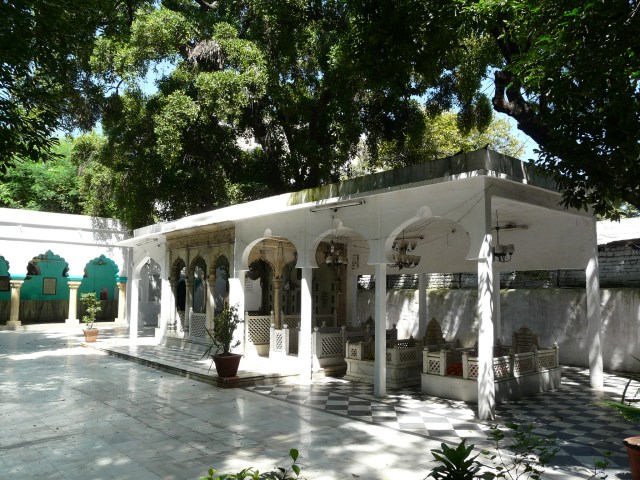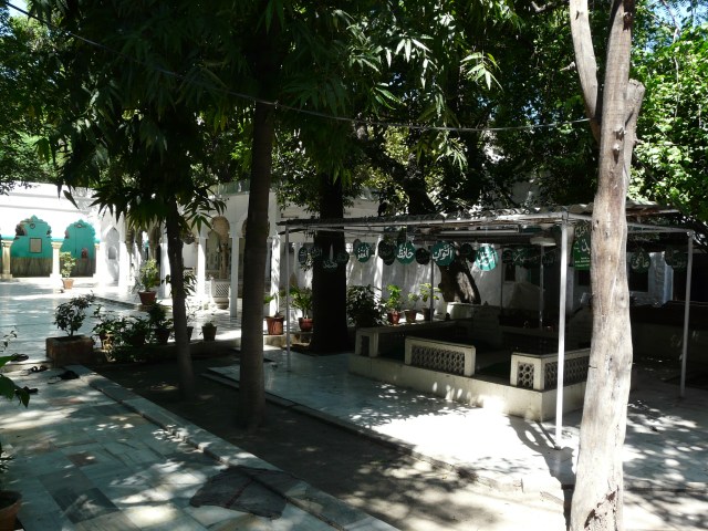 At the scooped-out mosque I also learnt of a nearby dargah, located at the edge of the grounds of Lady Hardinge Medical College, opposite Marina Hotel on the outer circle. The caretaker of the dargah told me that the lands belonging to the dargah used to be much more vast than they are today, but were appropriated to make the hospital. The courtyard of the present dargah is a quiet, green and shady retreat from the bustle of neighboring CP!