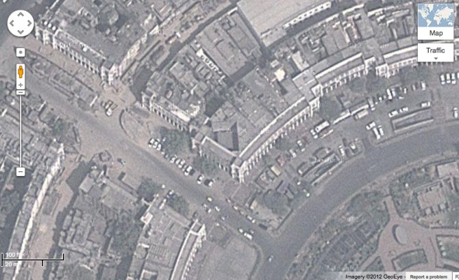 Entrance to the mosque from an otherwise usual Connaught Place corridor The doorway to the mosque, through which we can see the differently-oriented “negative space” and mosque The mosque within the space scooped-out of the surrounding building In the image below we get an idea of the shape of the scooped-out space Mosque interior The mosque and scooped-out space are visible at the center of this satellite image of CP.