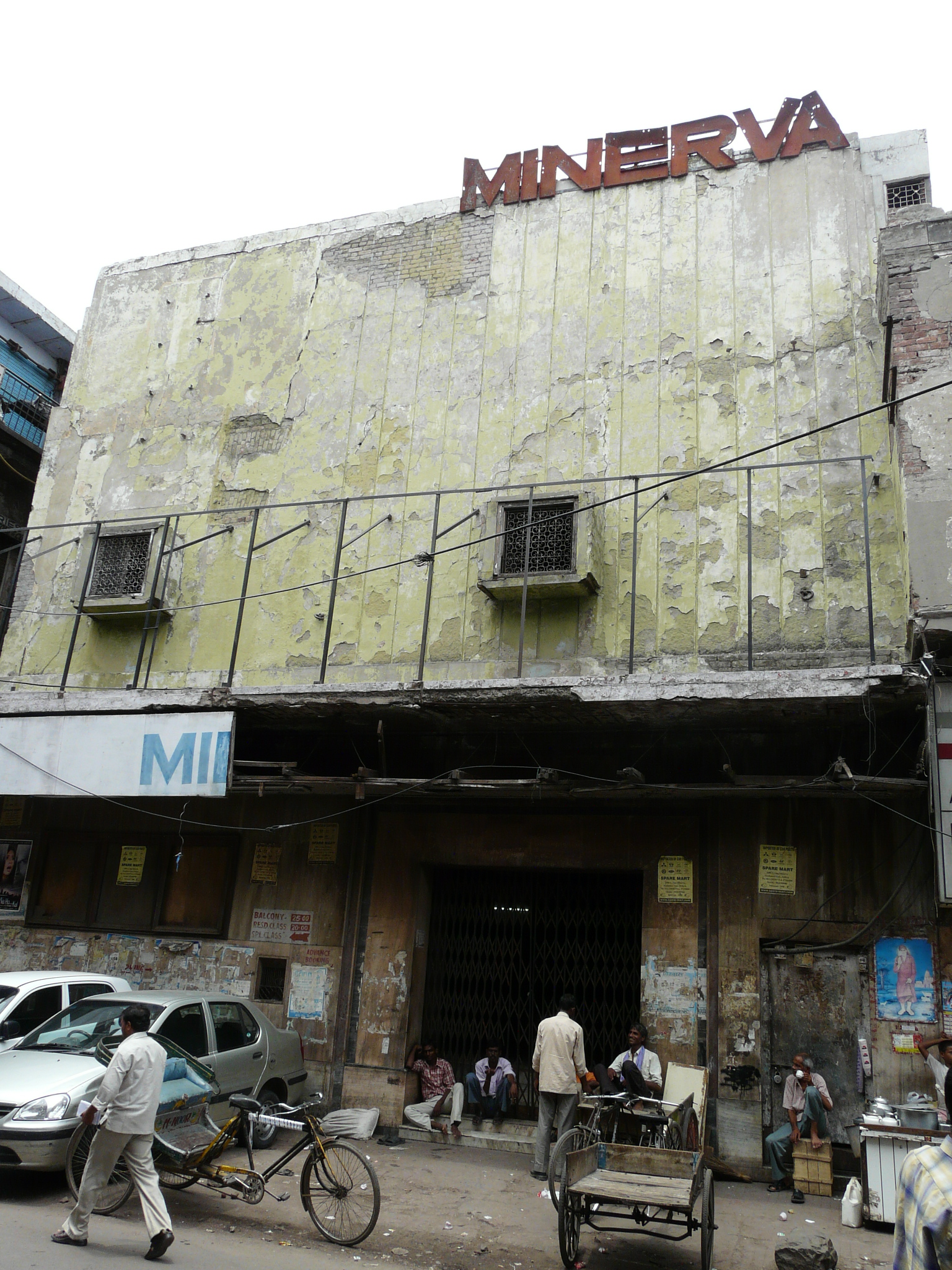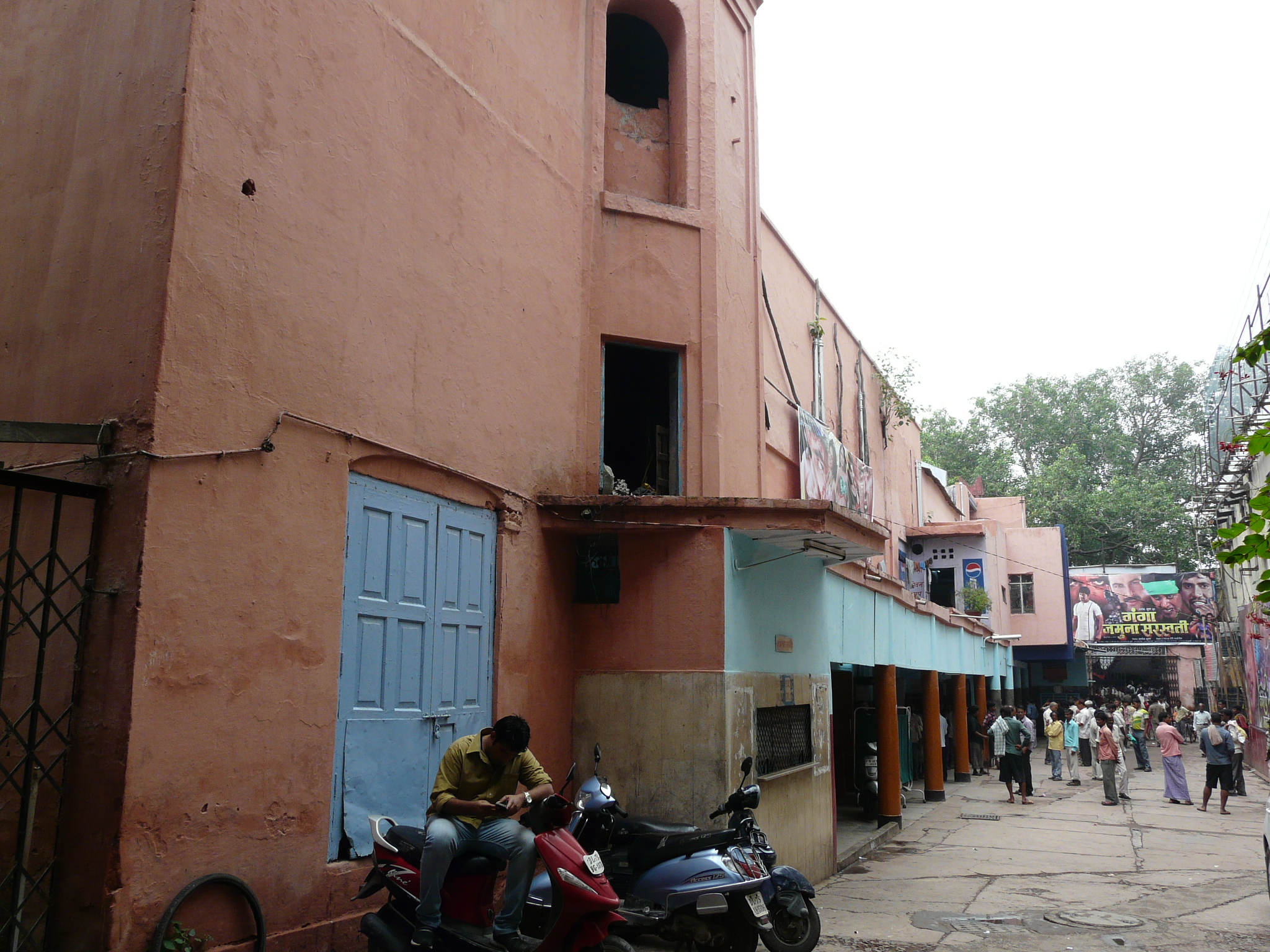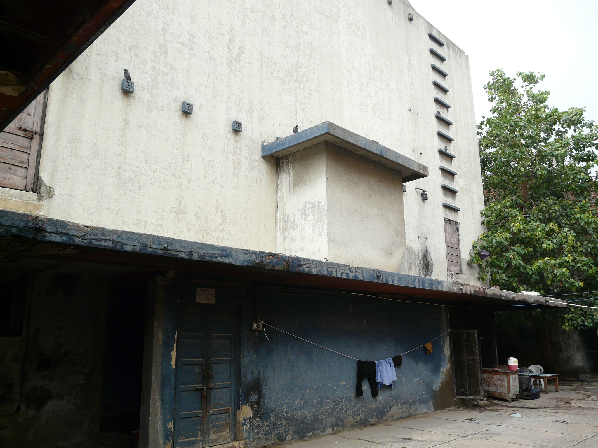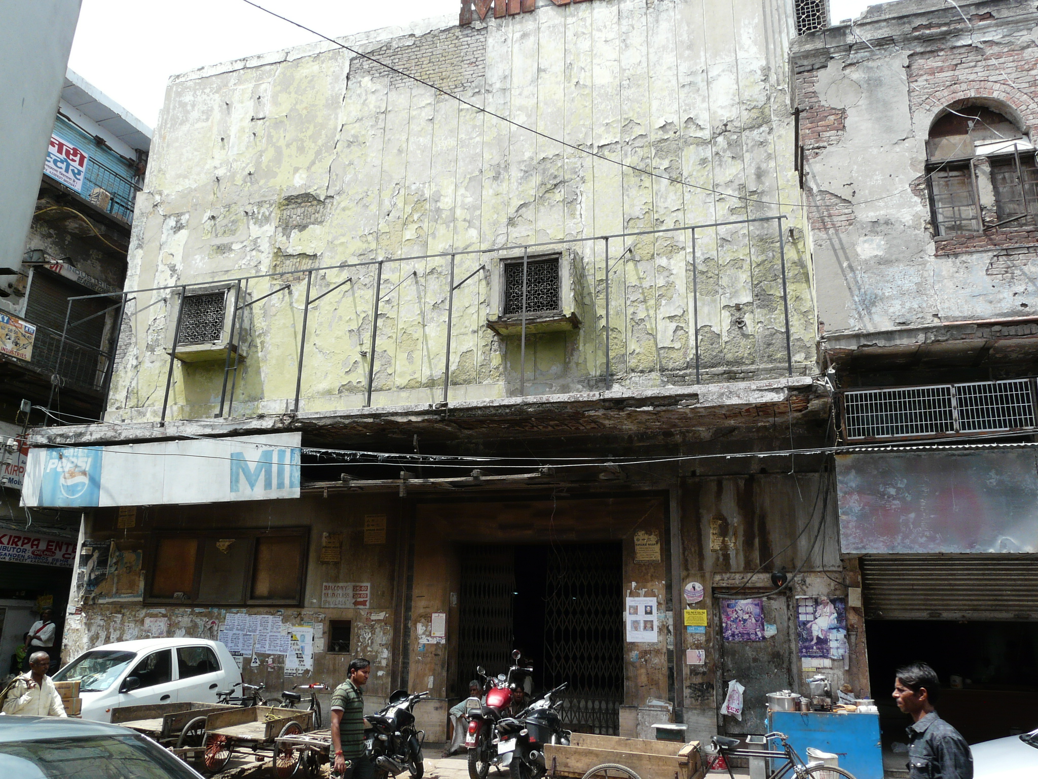 An older facade possibly peeking out from behind the newer plain facade Side-alley with theater exits Commercial activity in front of the erstwhile movie theater Jami Masjid visible in the background.