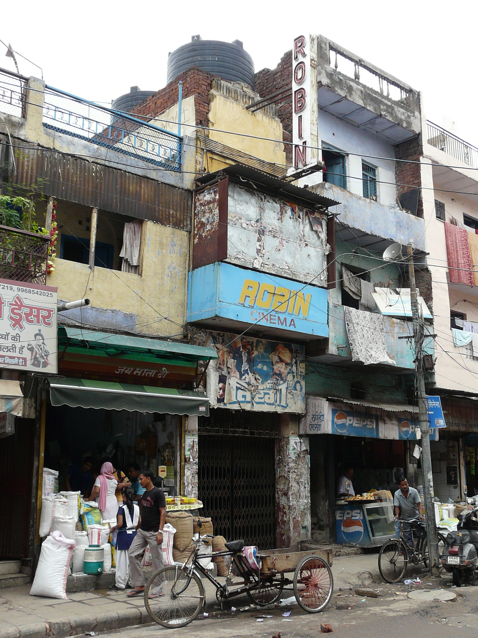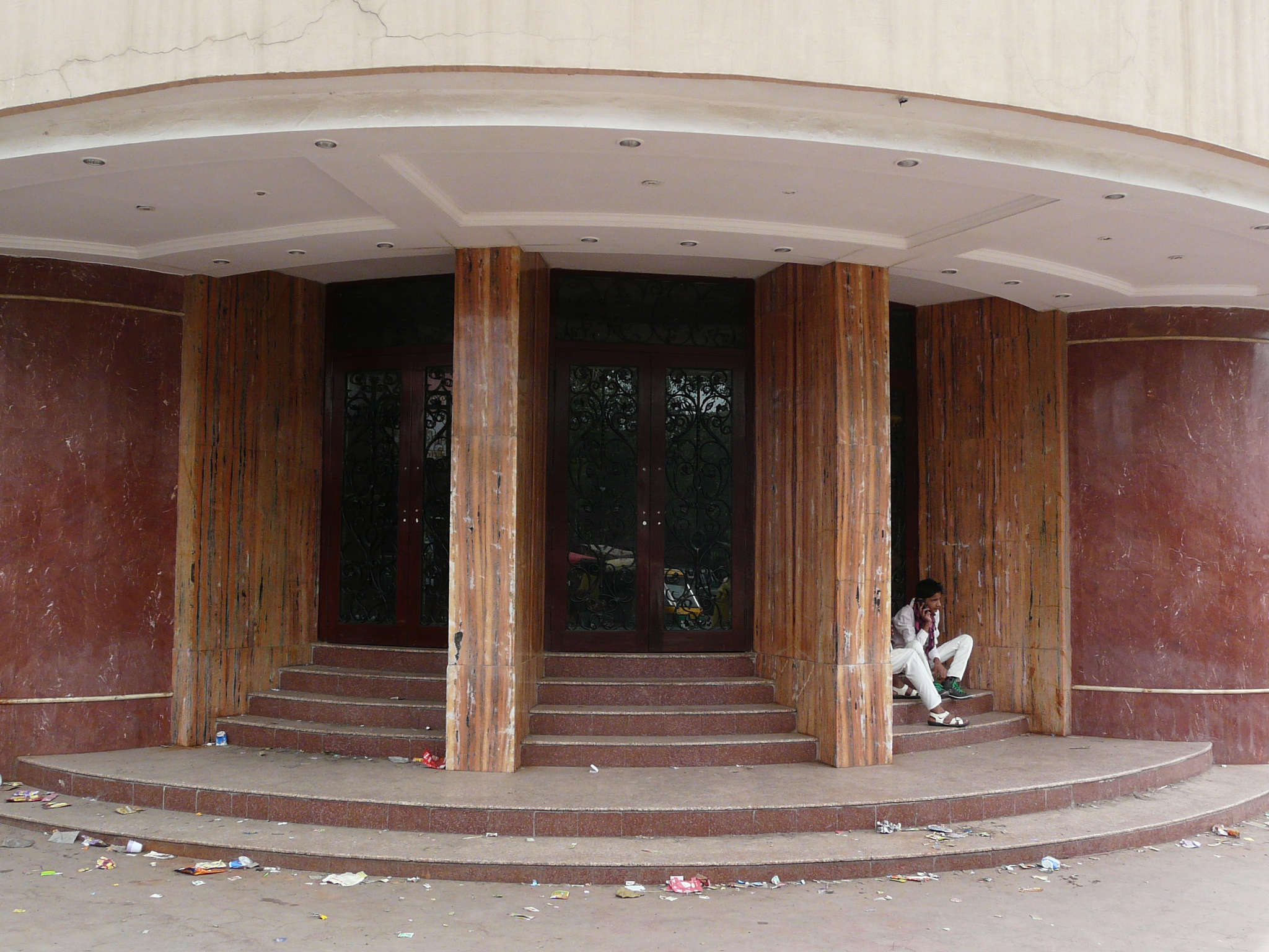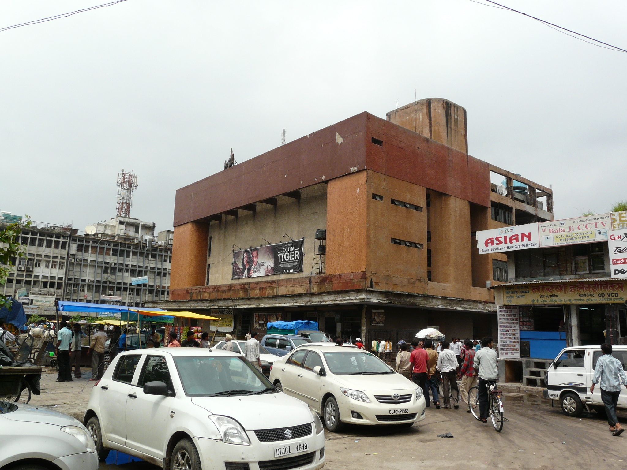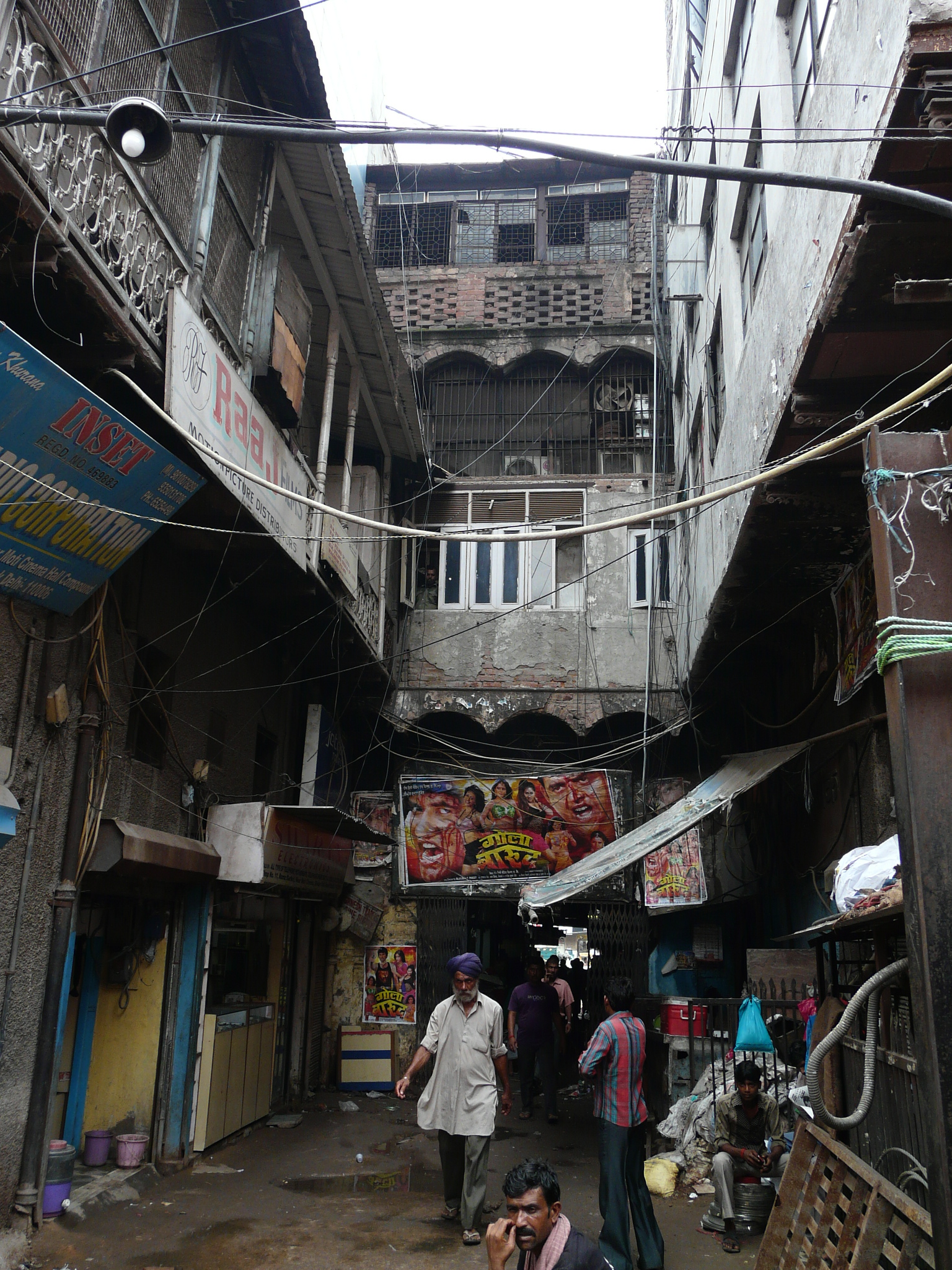 An older facade possibly peeking out from behind the newer plain facade Side-alley with theater exits Commercial activity in front of the erstwhile movie theater Jami Masjid visible in the background.