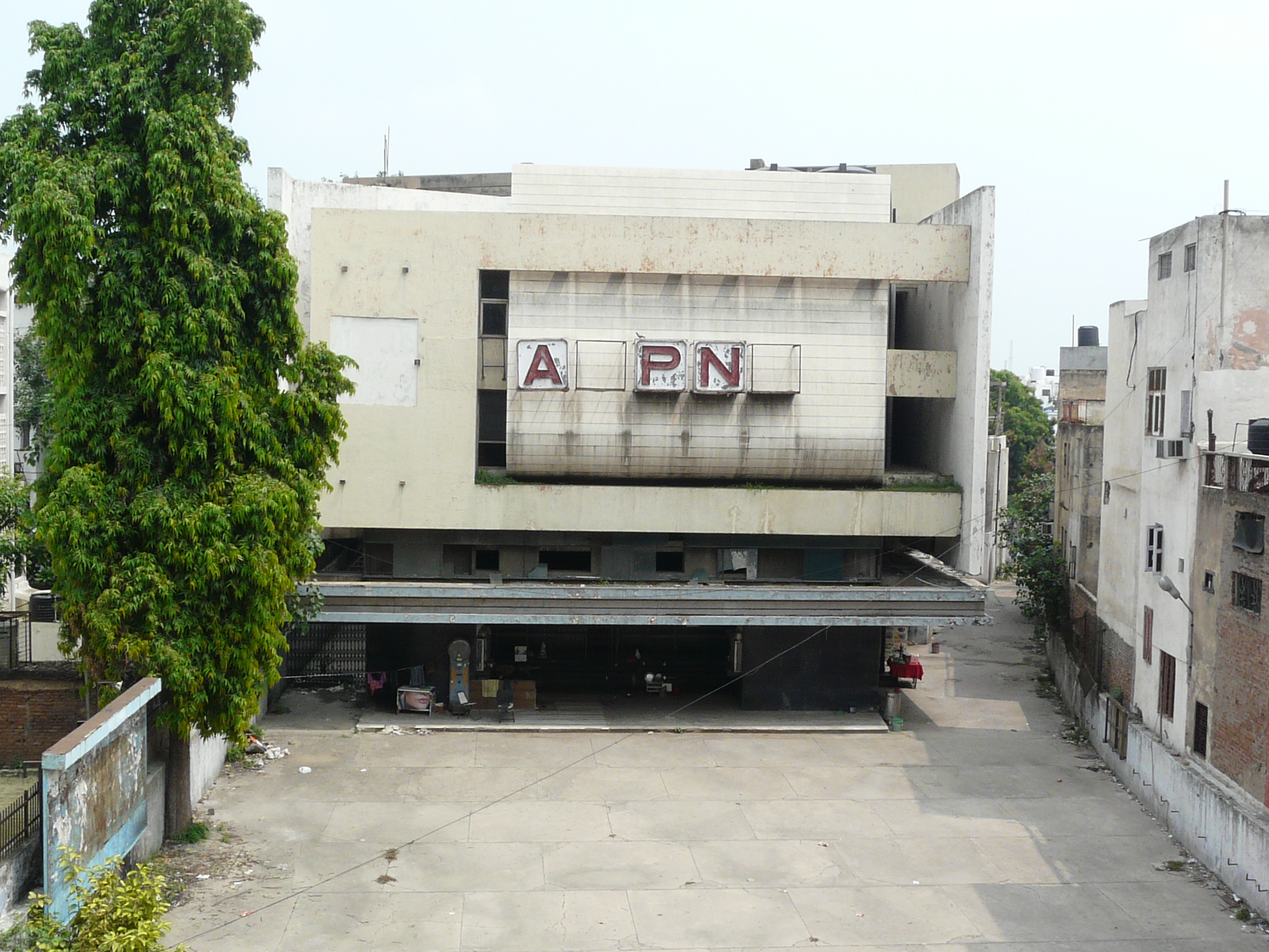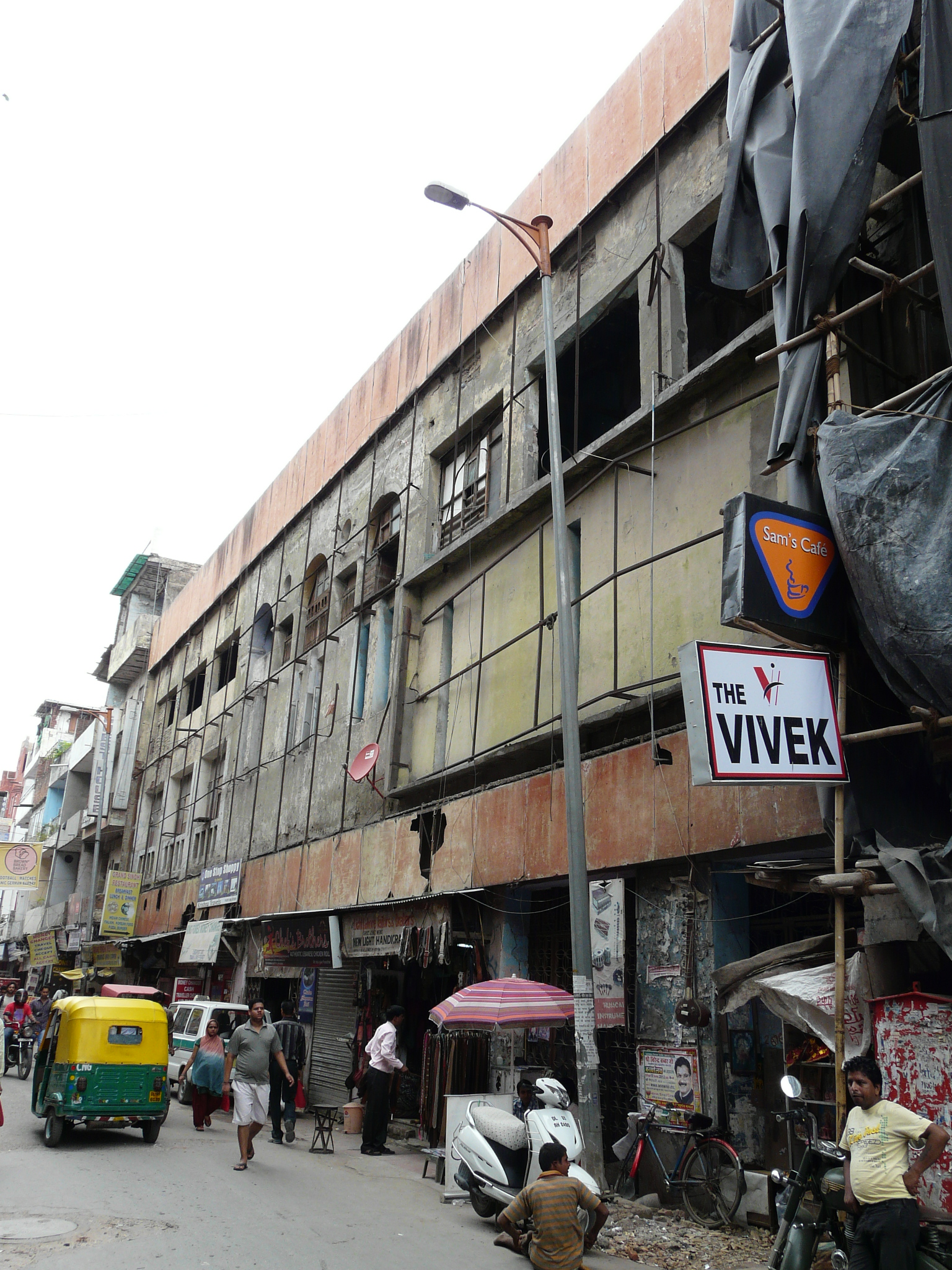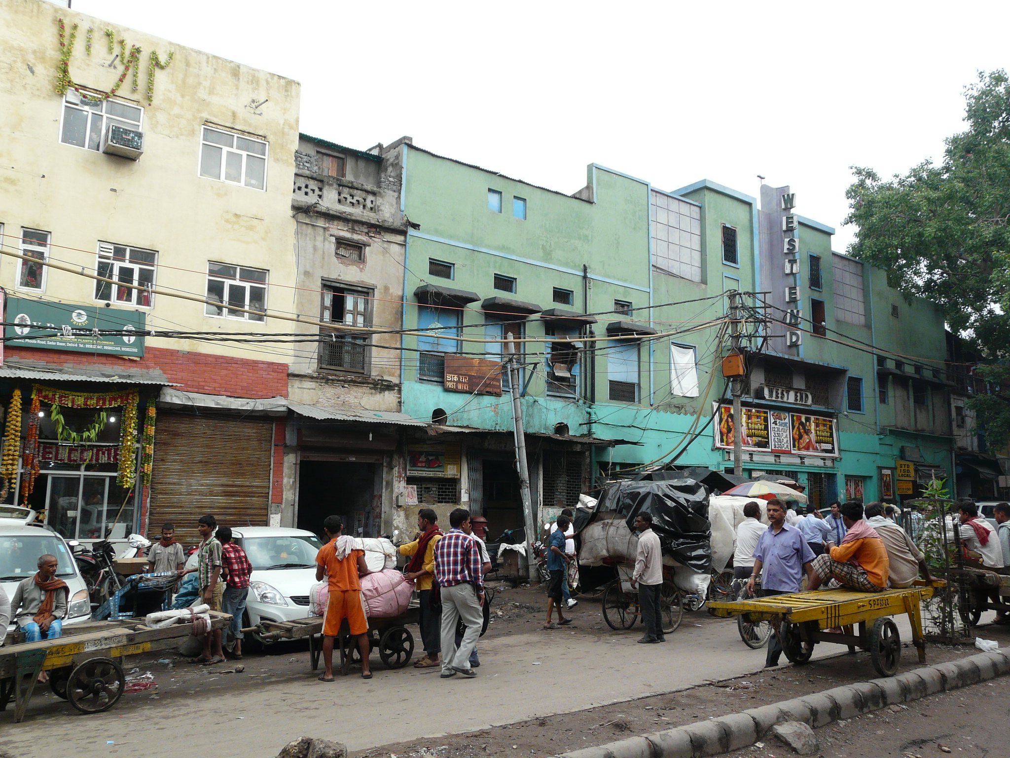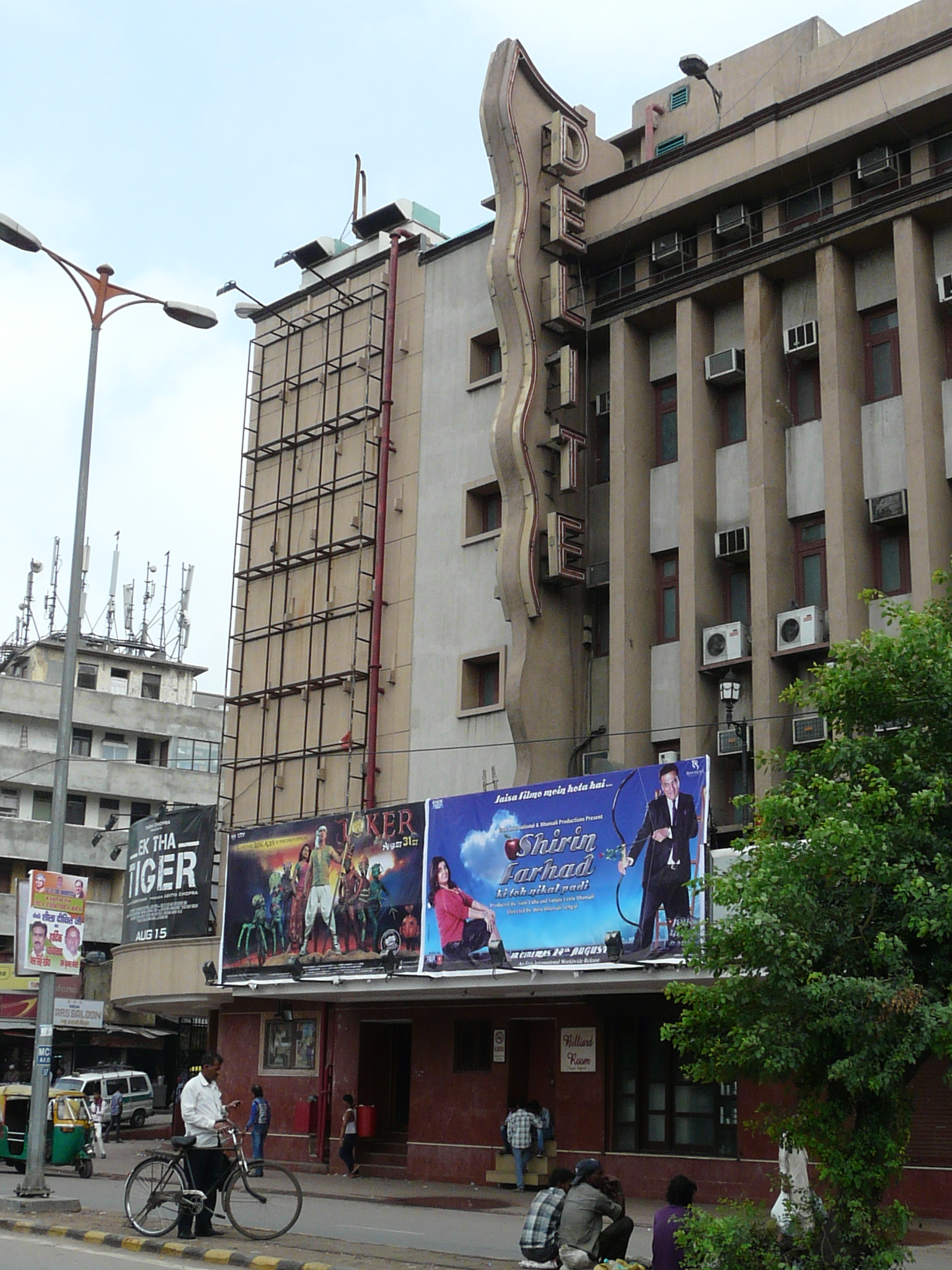 An older facade possibly peeking out from behind the newer plain facade Side-alley with theater exits Commercial activity in front of the erstwhile movie theater Jami Masjid visible in the background.