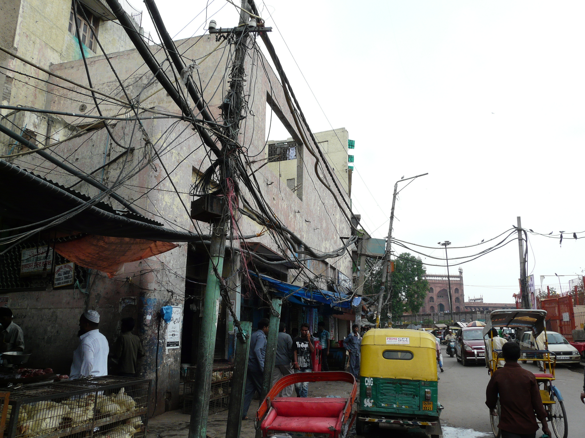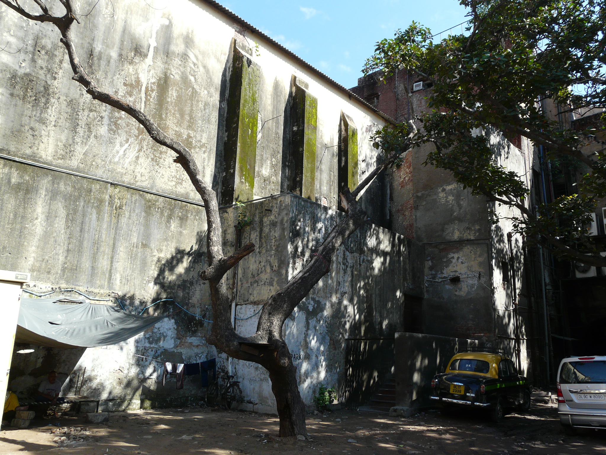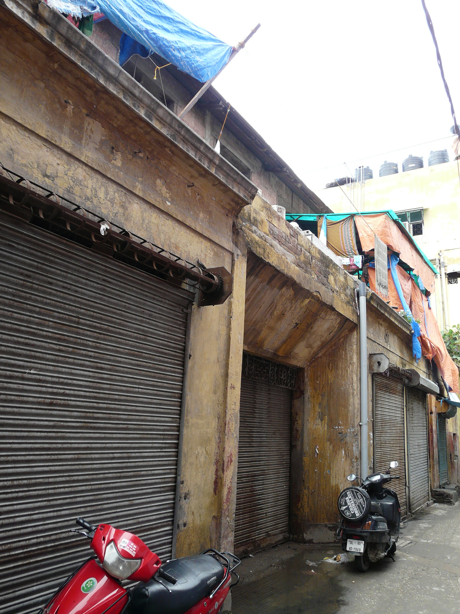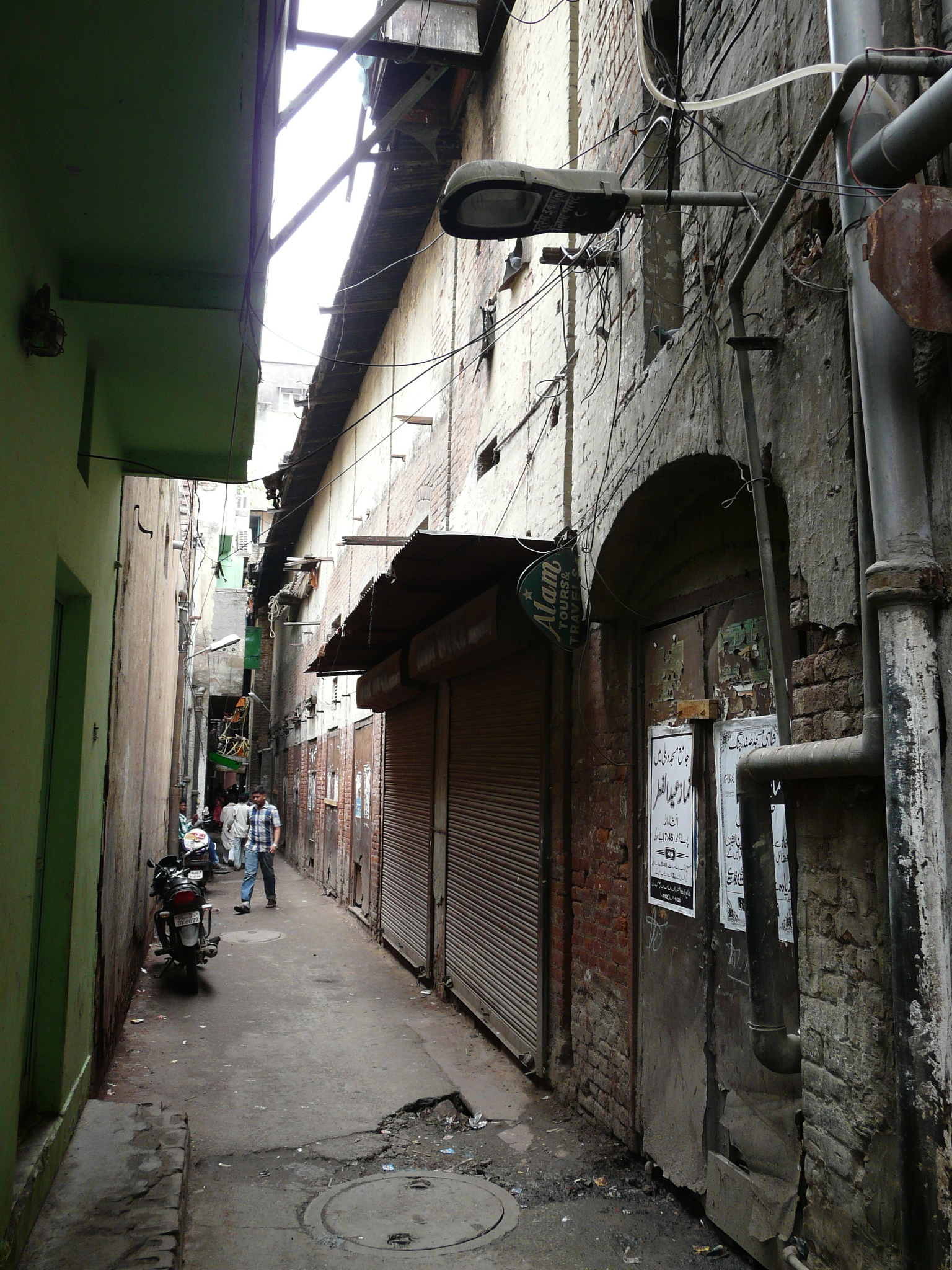 An older facade possibly peeking out from behind the newer plain facade Side-alley with theater exits Commercial activity in front of the erstwhile movie theater Jami Masjid visible in the background.