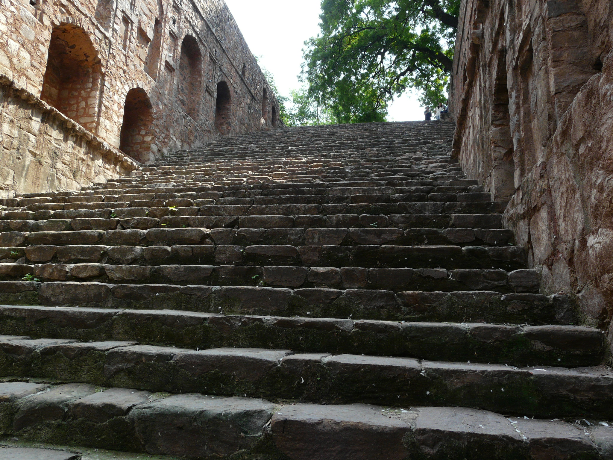 Agrasen ki Baoli Buildings along Bara Khamba Road tower in the background Steps leading down to the baoli A mosque at the top of the baoli The narrow lane leading to Agrasen’s baoli.