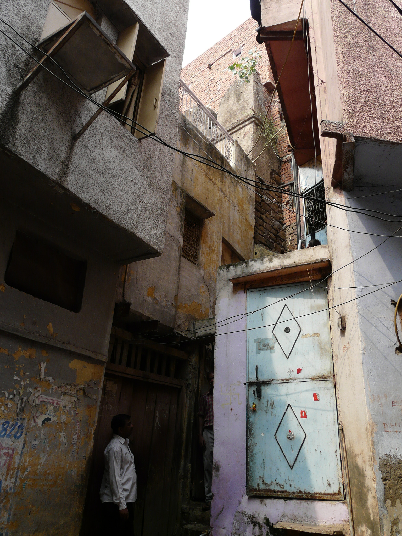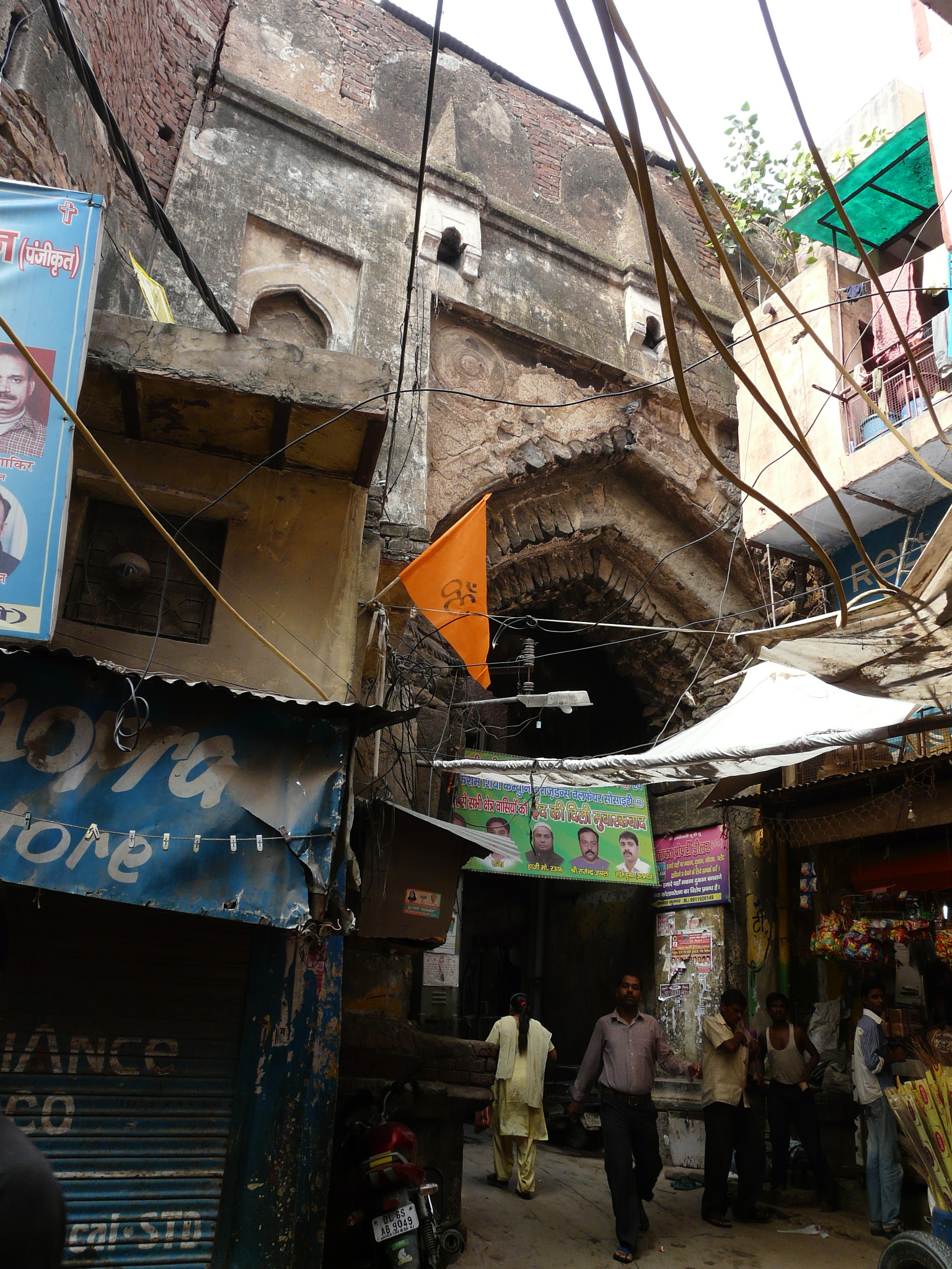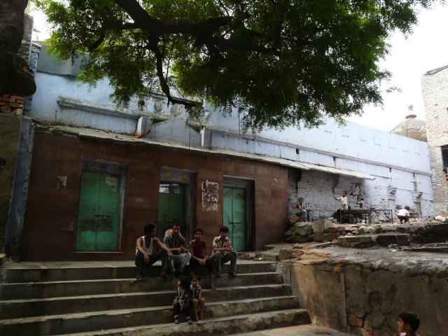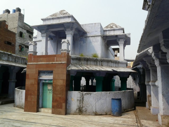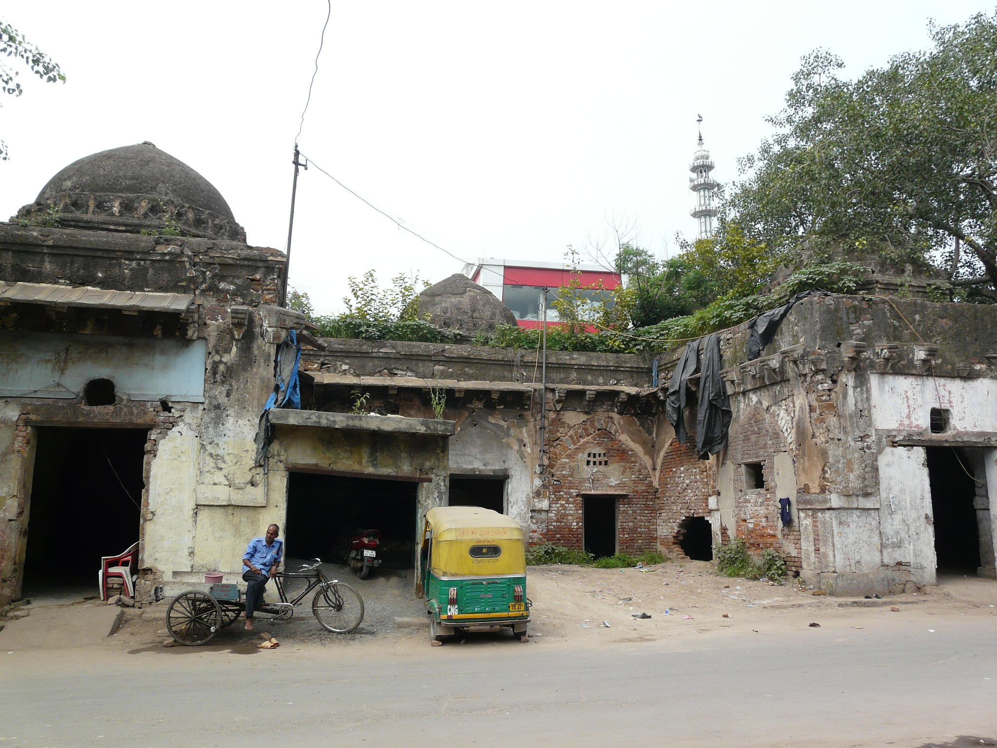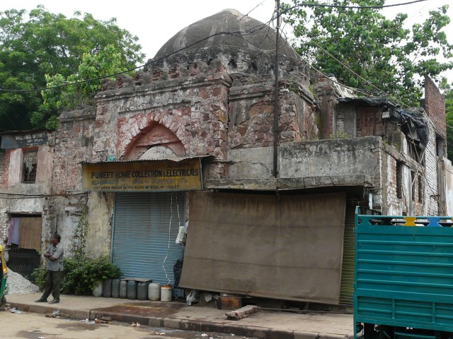 Just east of Qadam Sharif on Qutb Road (on the eastern edge of the Pahar Ganj area, nowhere near Qutb Minar) lies a mosque and tomb (14th/15th c.) that could once have been enclosed together by walls and formed a single unit, just like the small but evocative tomb complexes of Shah Alam and Makhdum Sahib. Unlike those two well-preserved examples, a road now separates the mosque from its tomb (or possibly the gateway to the enclosure) in this case, the enclosing walls have disappeared, and the structures (both tomb and mosque) are being used for commercial purposes.