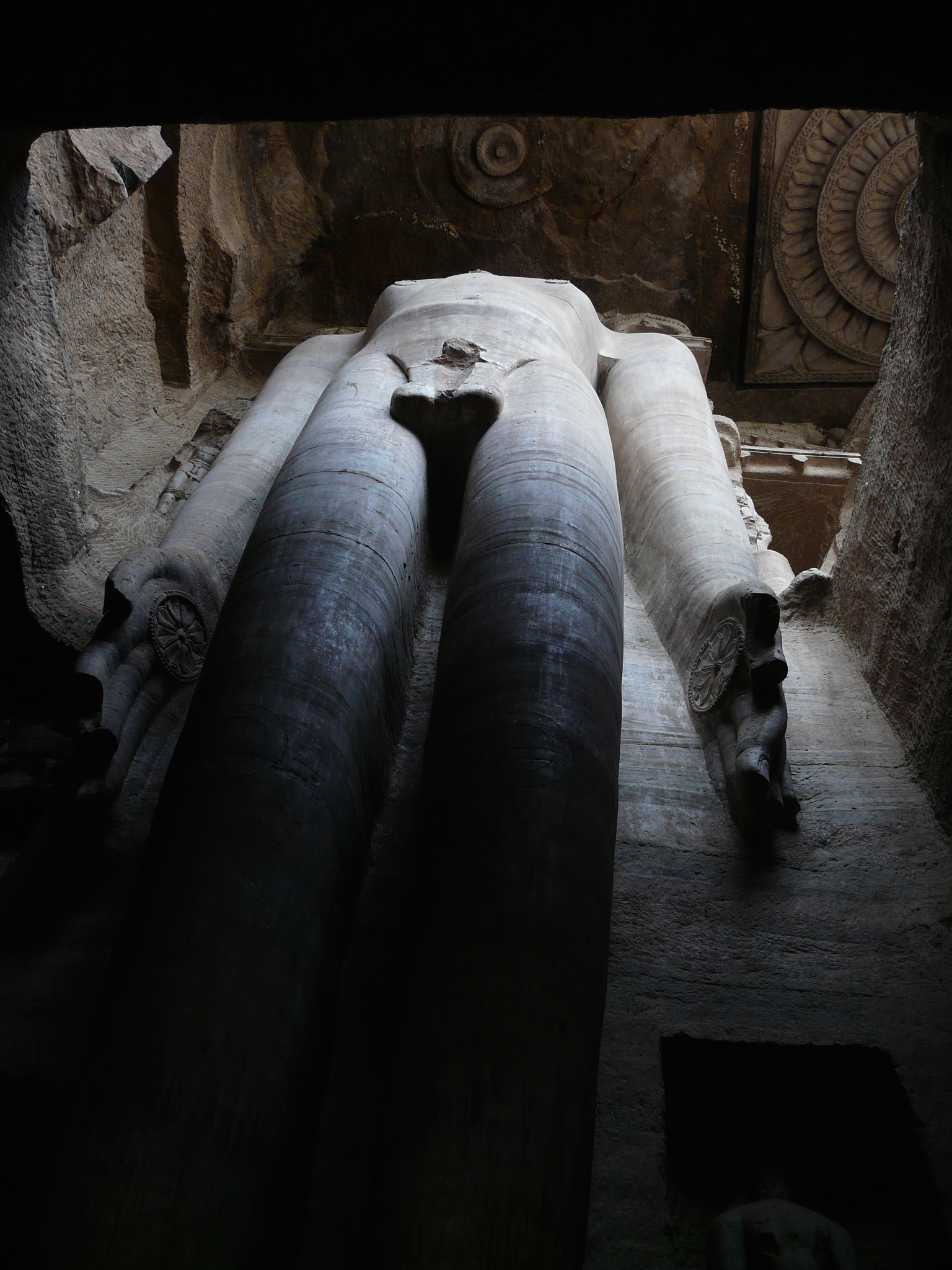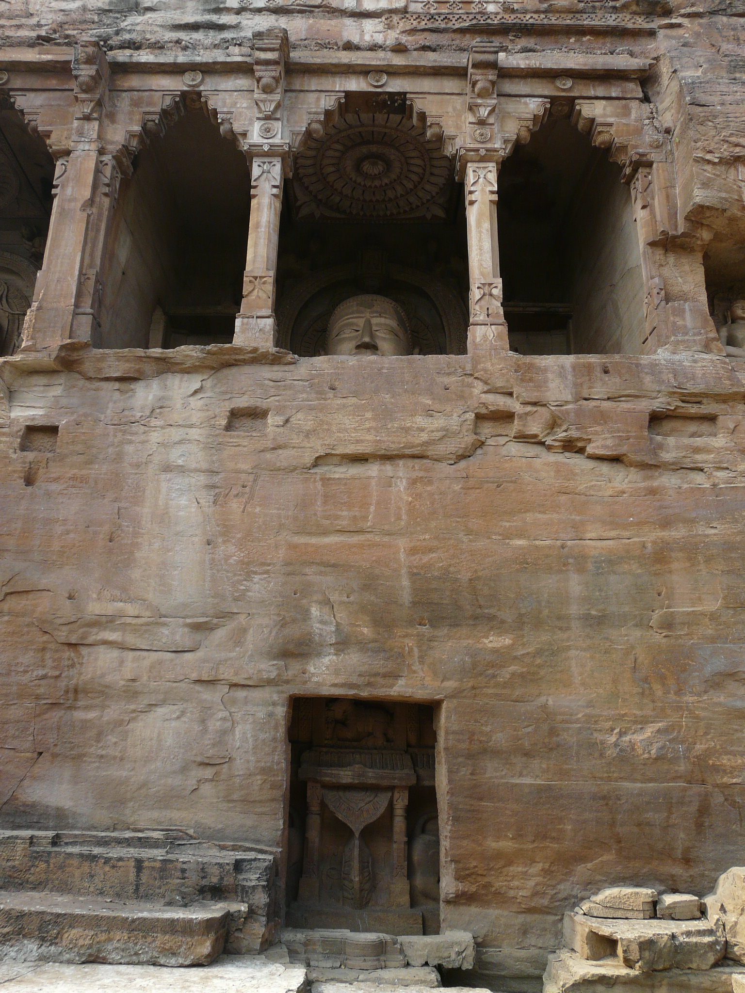 At various places along the high escarpment of Gwalior Fort’s hill are rock-cut statues of the Jain pantheon of Tirthankar saints. The best known among these are two major statue groups along the western approach route up the hill through Urwahi valley. There are also a few such caves accessible via a flight of steps along the north-eastern approach route to the hill. However, not mentioned in any of the guidebooks that I referred to is a large group of Tirthankar statues (probably the best of the lot) along the south-eastern escarpment, which I have shown here. These statues are not on any of the routes going up to the table-top, and have to be accessed separately from the other architectural sites on the hill. There is another set of such statues along the north-western escarpment, which I did not visit.