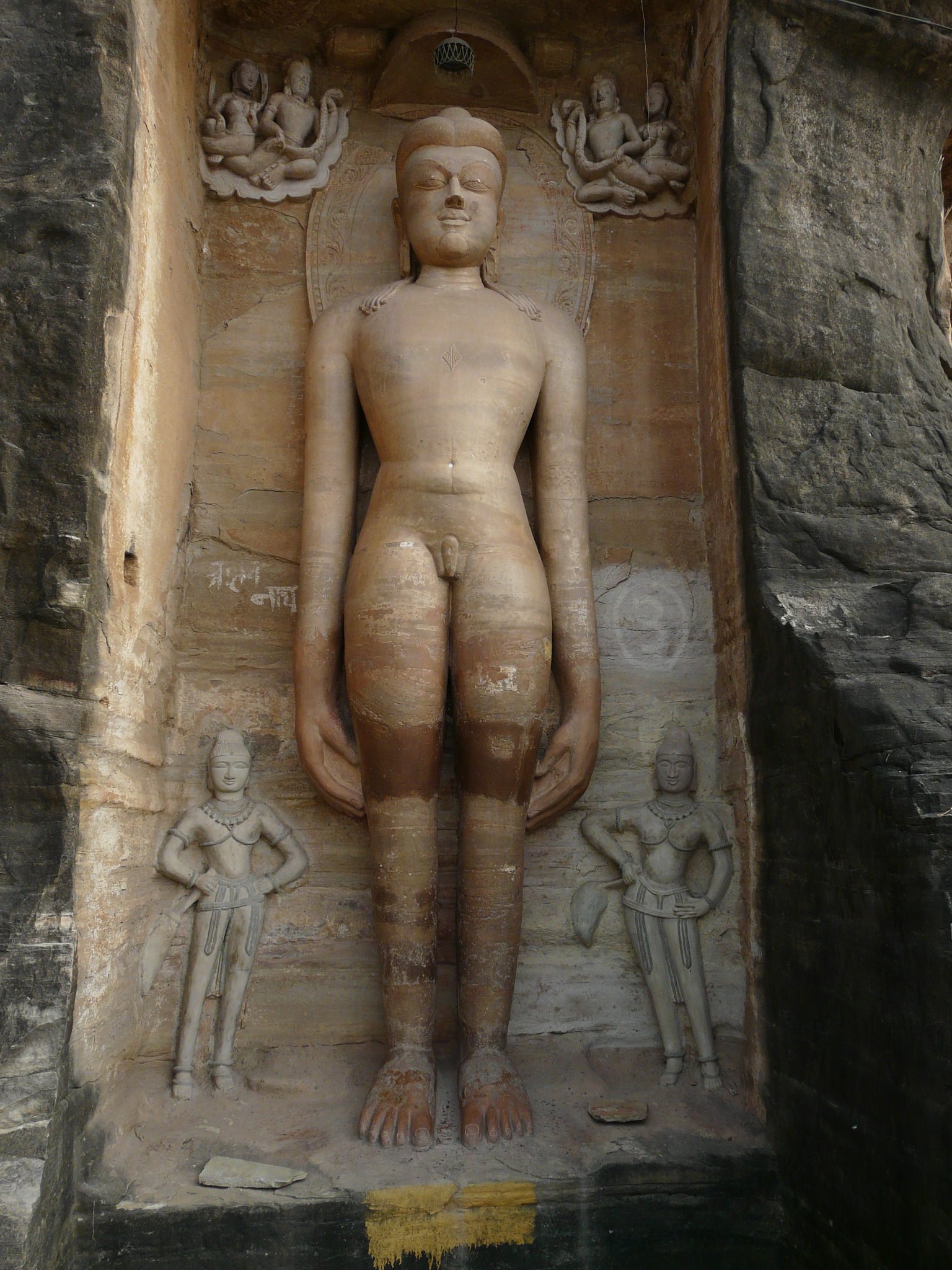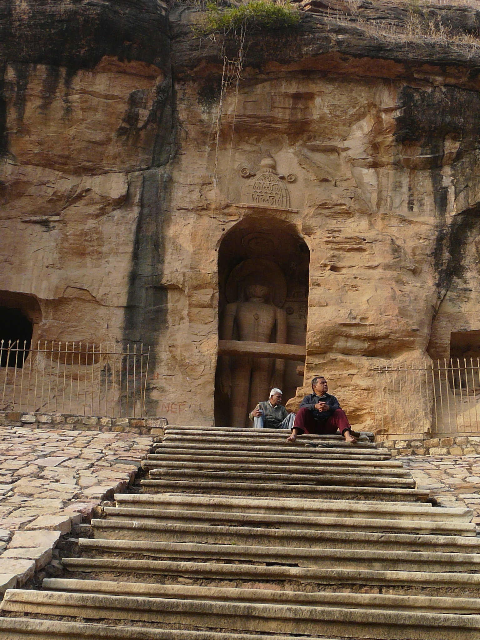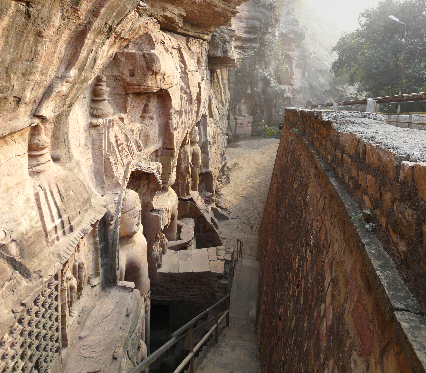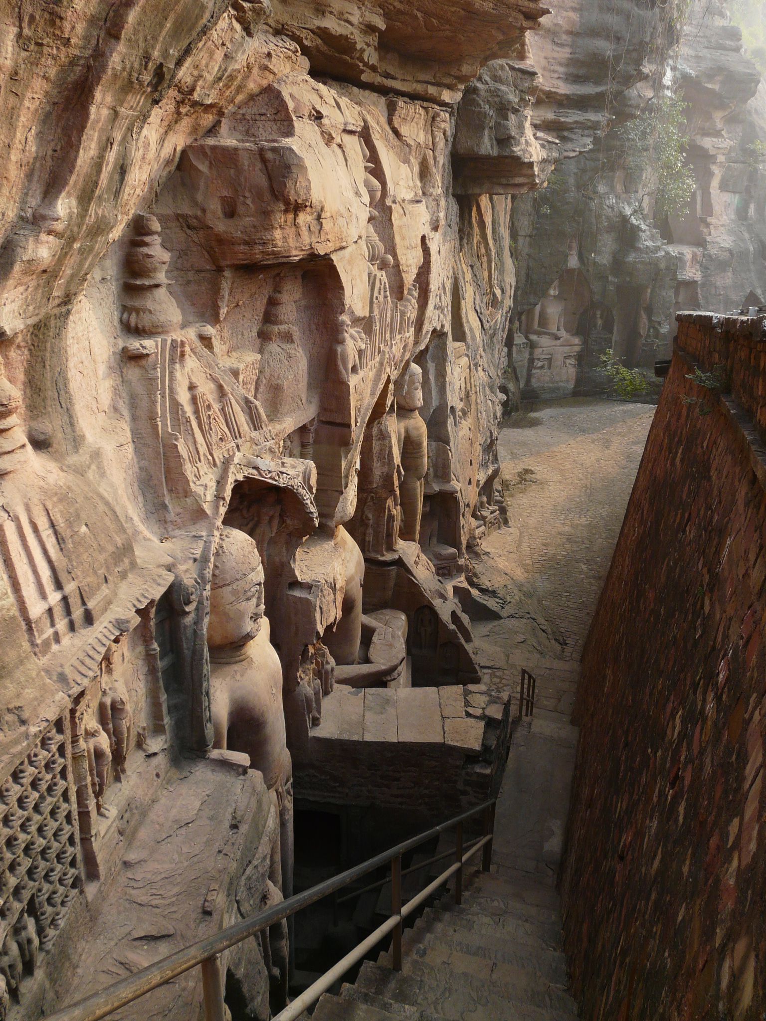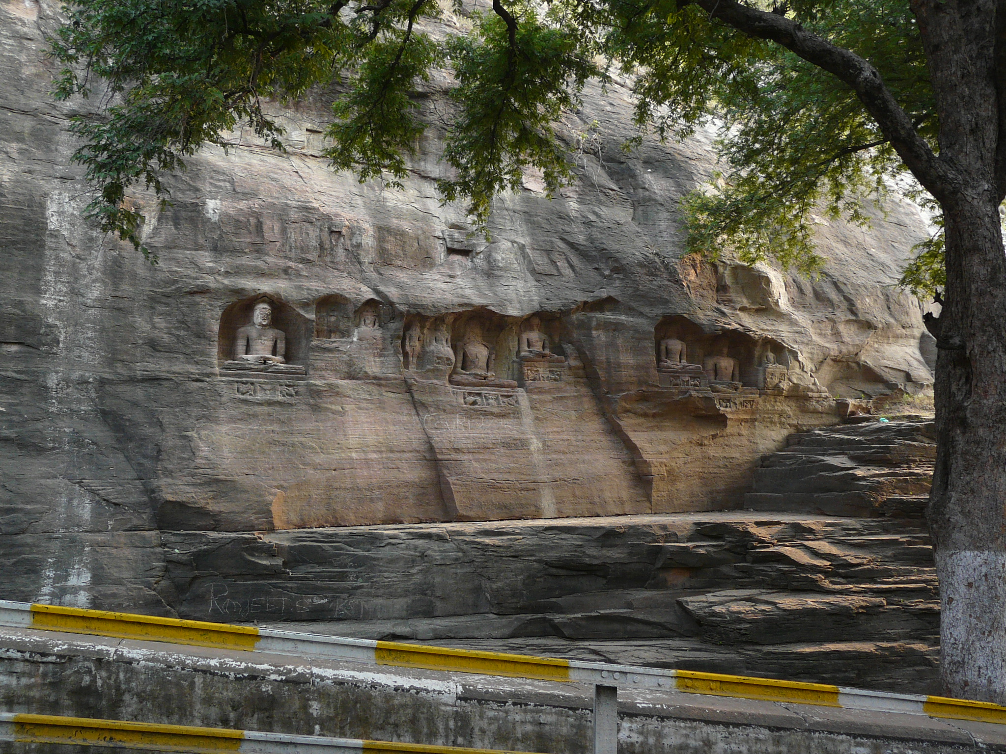 The best known group of Jain Tirthankar statues on the Gwalior Fort hill are along the western approach route to the hill, in what is known as the Urwahi Valley. While all other sides of the hill are faced with a steep escarpment (on which other statue groups have been cut, the middle of the western face has a relatively more gradual forested valley that leads part-ways up the hill. The approach route has been made in this valley. Along the sides of the valley, also scarped, are two major groups of Jain sculptures.