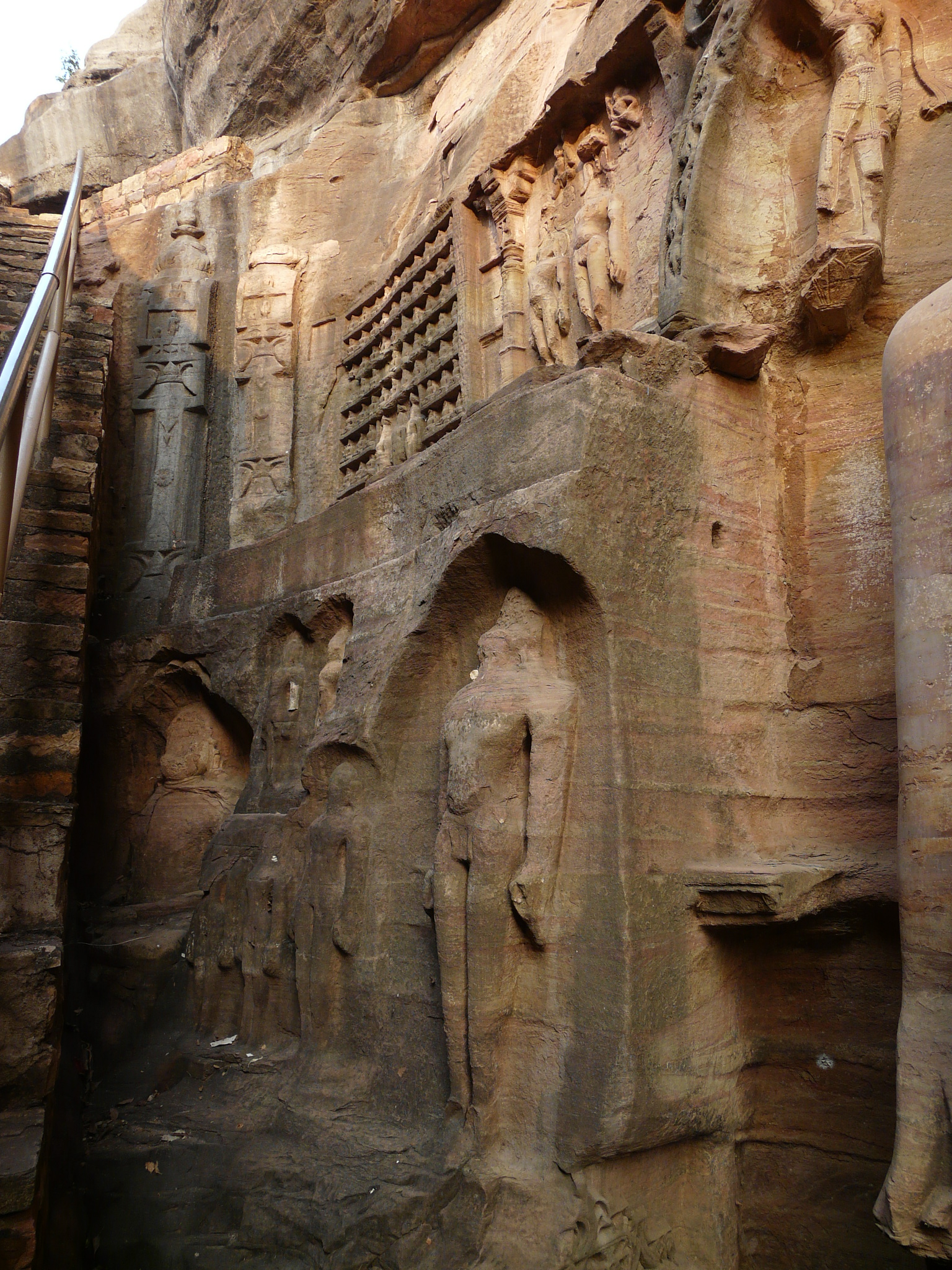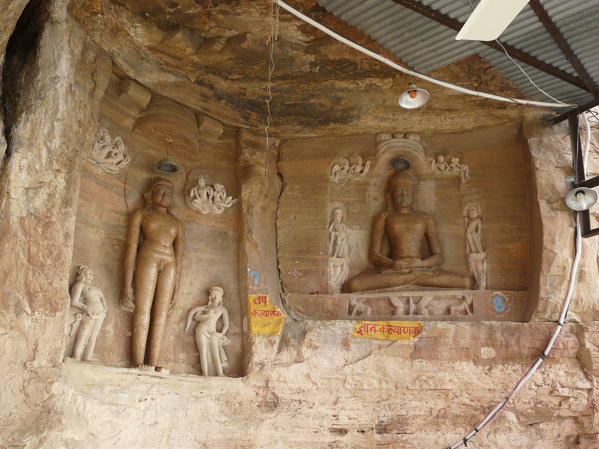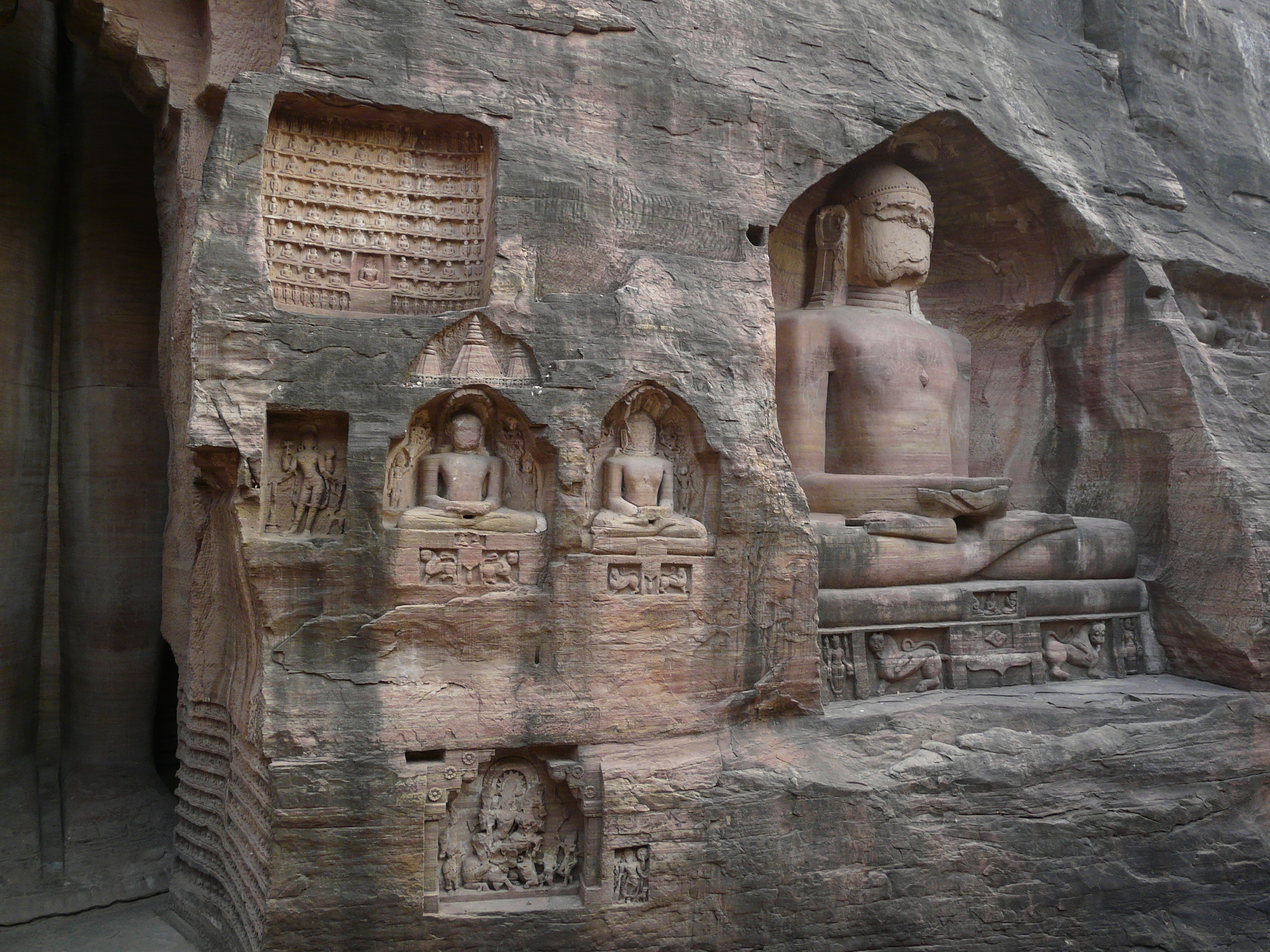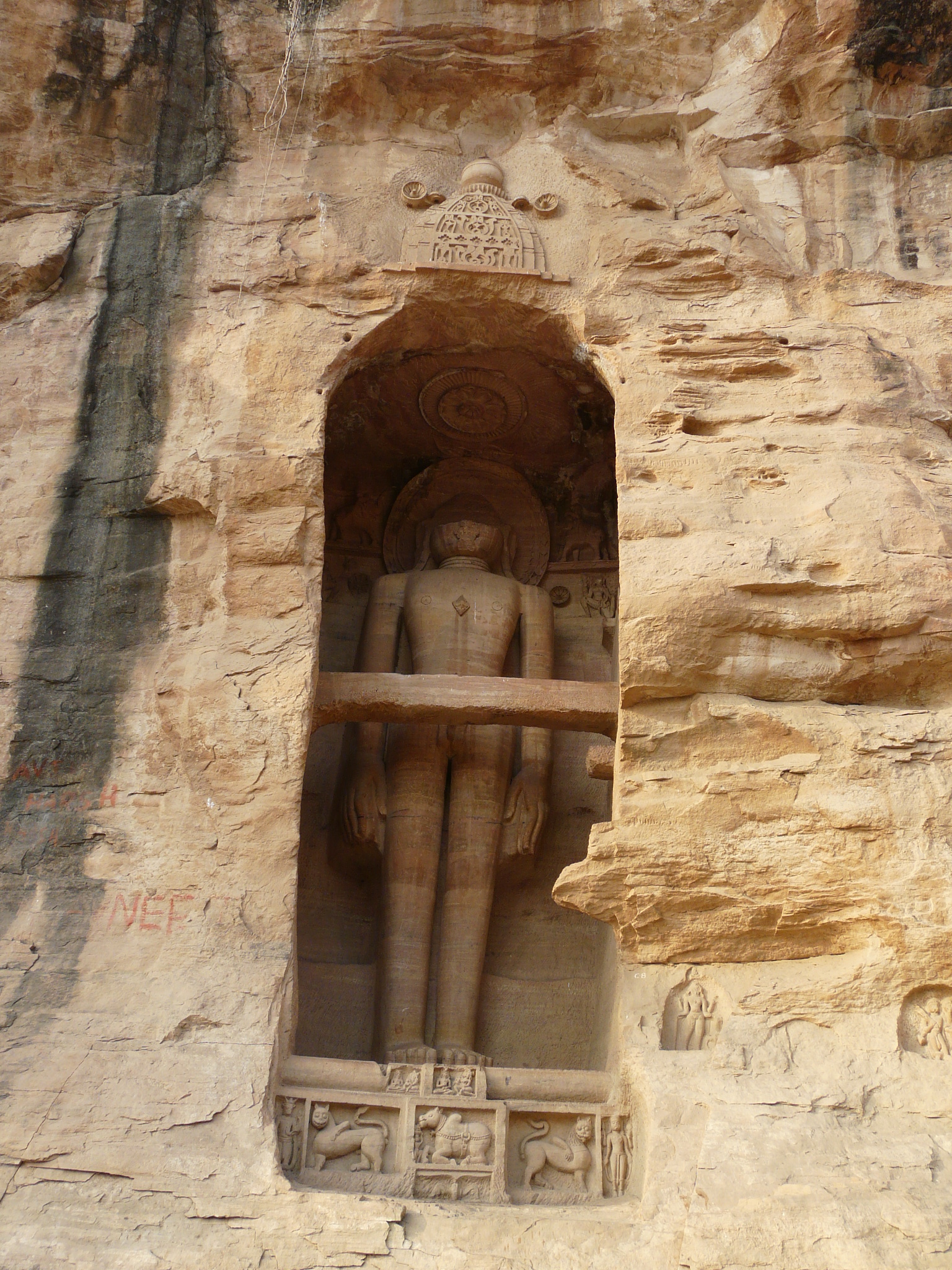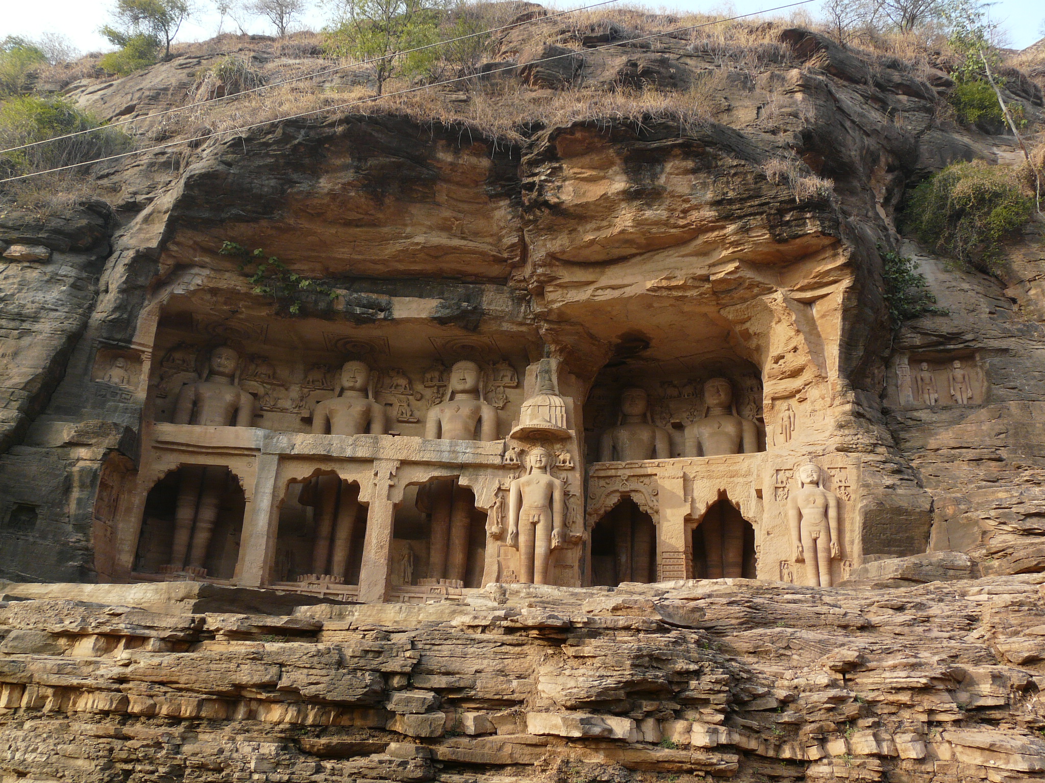 The best known group of Jain Tirthankar statues on the Gwalior Fort hill are along the western approach route to the hill, in what is known as the Urwahi Valley. While all other sides of the hill are faced with a steep escarpment (on which other statue groups have been cut, the middle of the western face has a relatively more gradual forested valley that leads part-ways up the hill. The approach route has been made in this valley. Along the sides of the valley, also scarped, are two major groups of Jain sculptures.