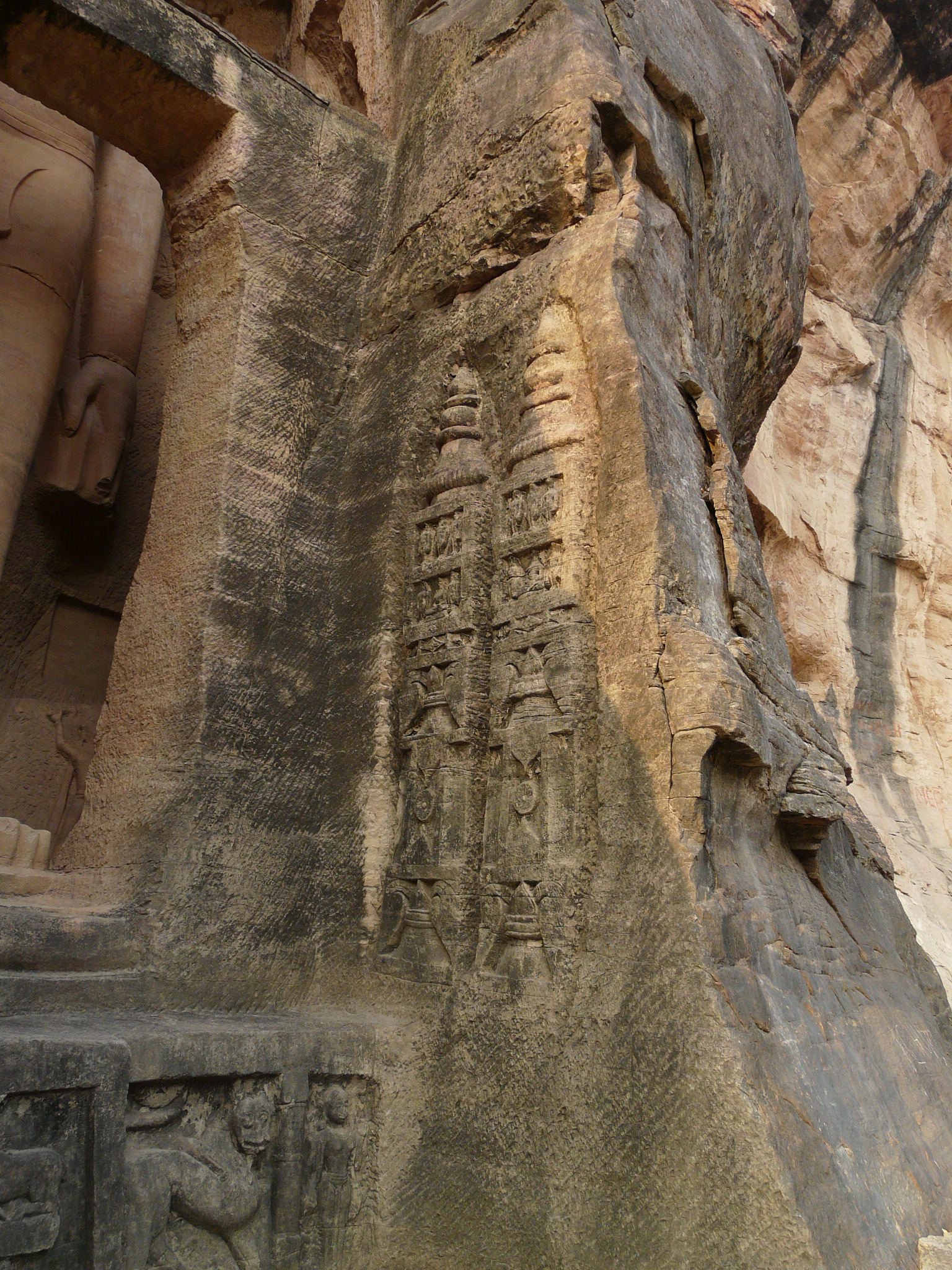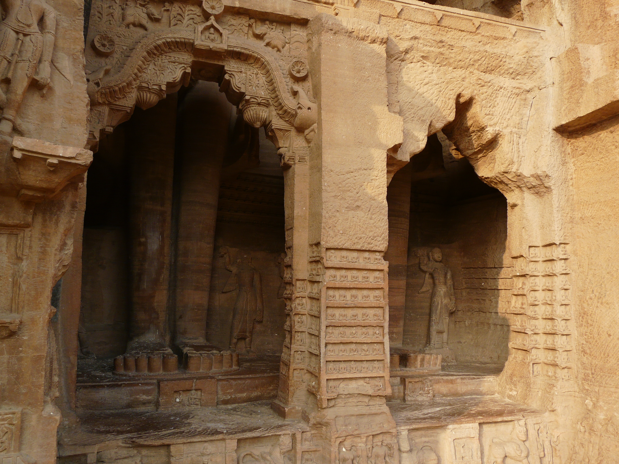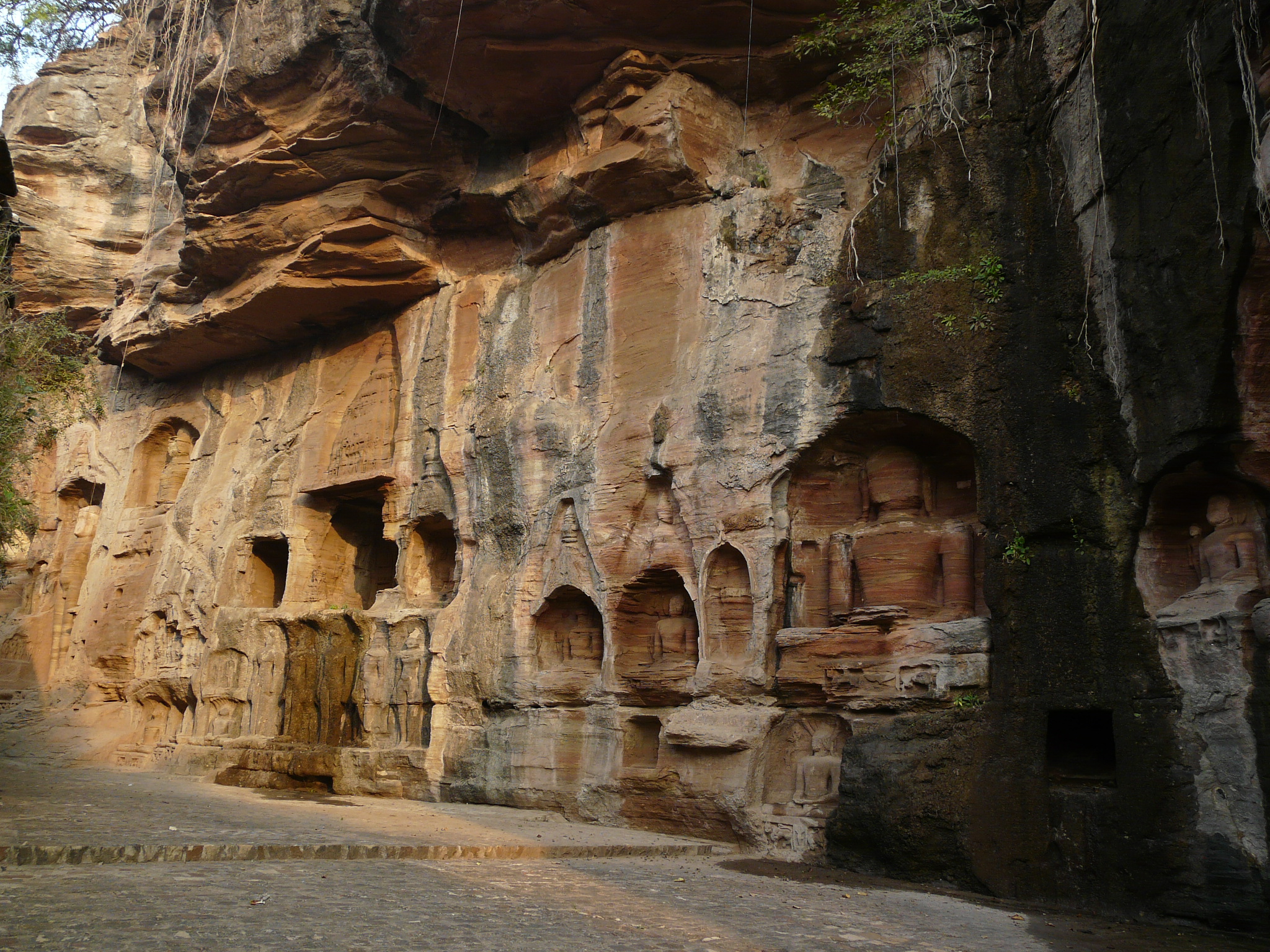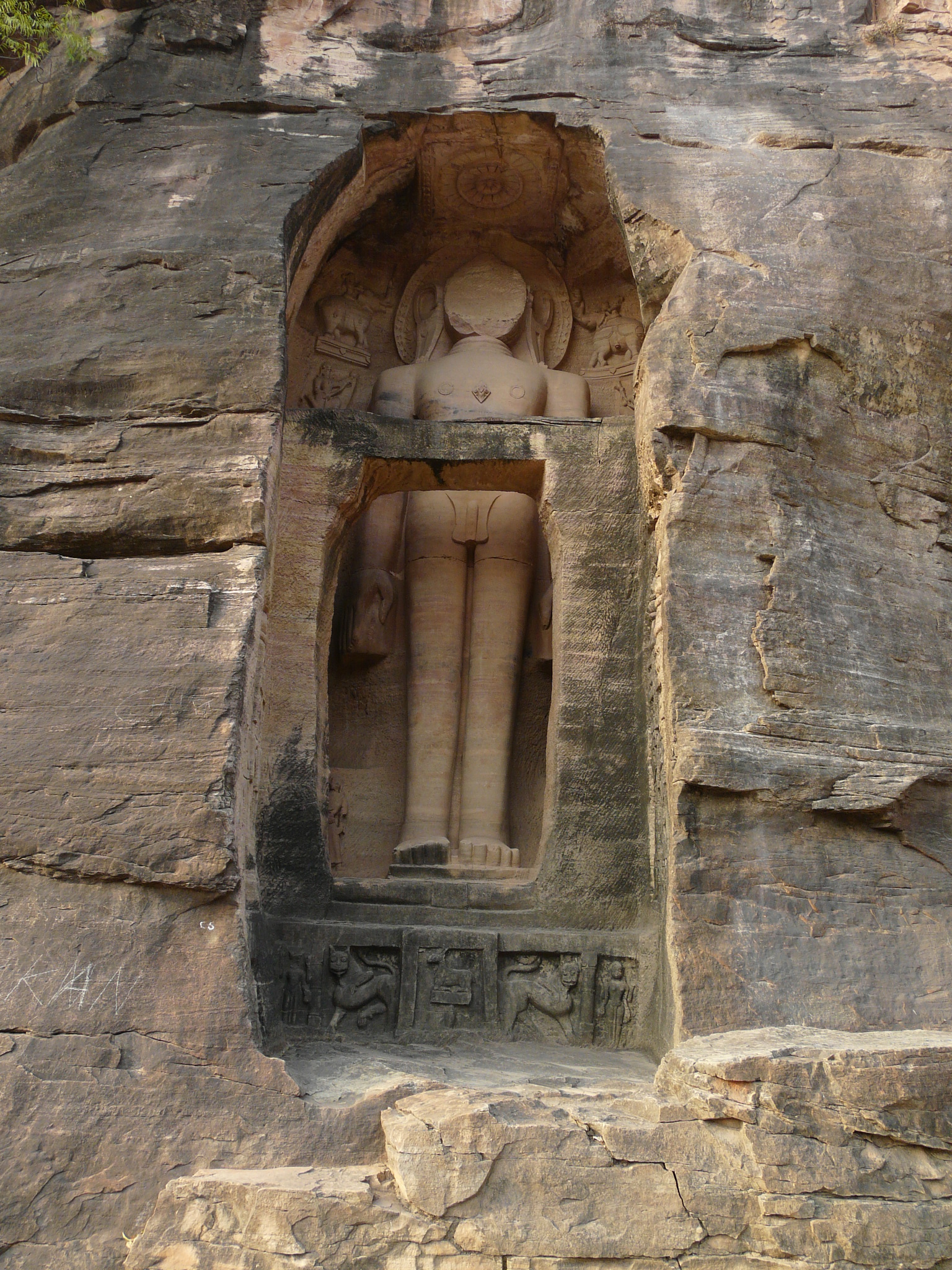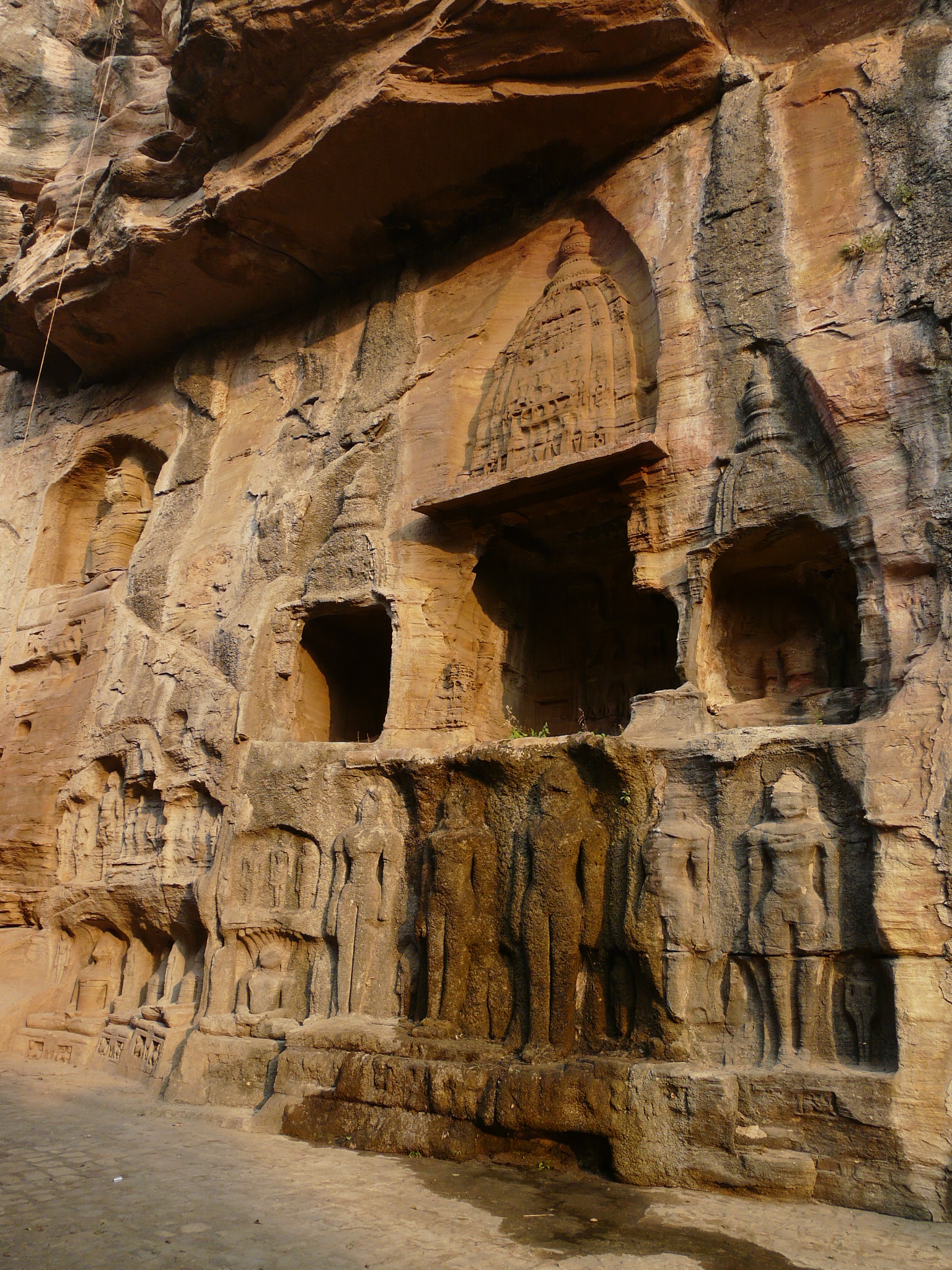 The best known group of Jain Tirthankar statues on the Gwalior Fort hill are along the western approach route to the hill, in what is known as the Urwahi Valley. While all other sides of the hill are faced with a steep escarpment (on which other statue groups have been cut, the middle of the western face has a relatively more gradual forested valley that leads part-ways up the hill. The approach route has been made in this valley. Along the sides of the valley, also scarped, are two major groups of Jain sculptures.