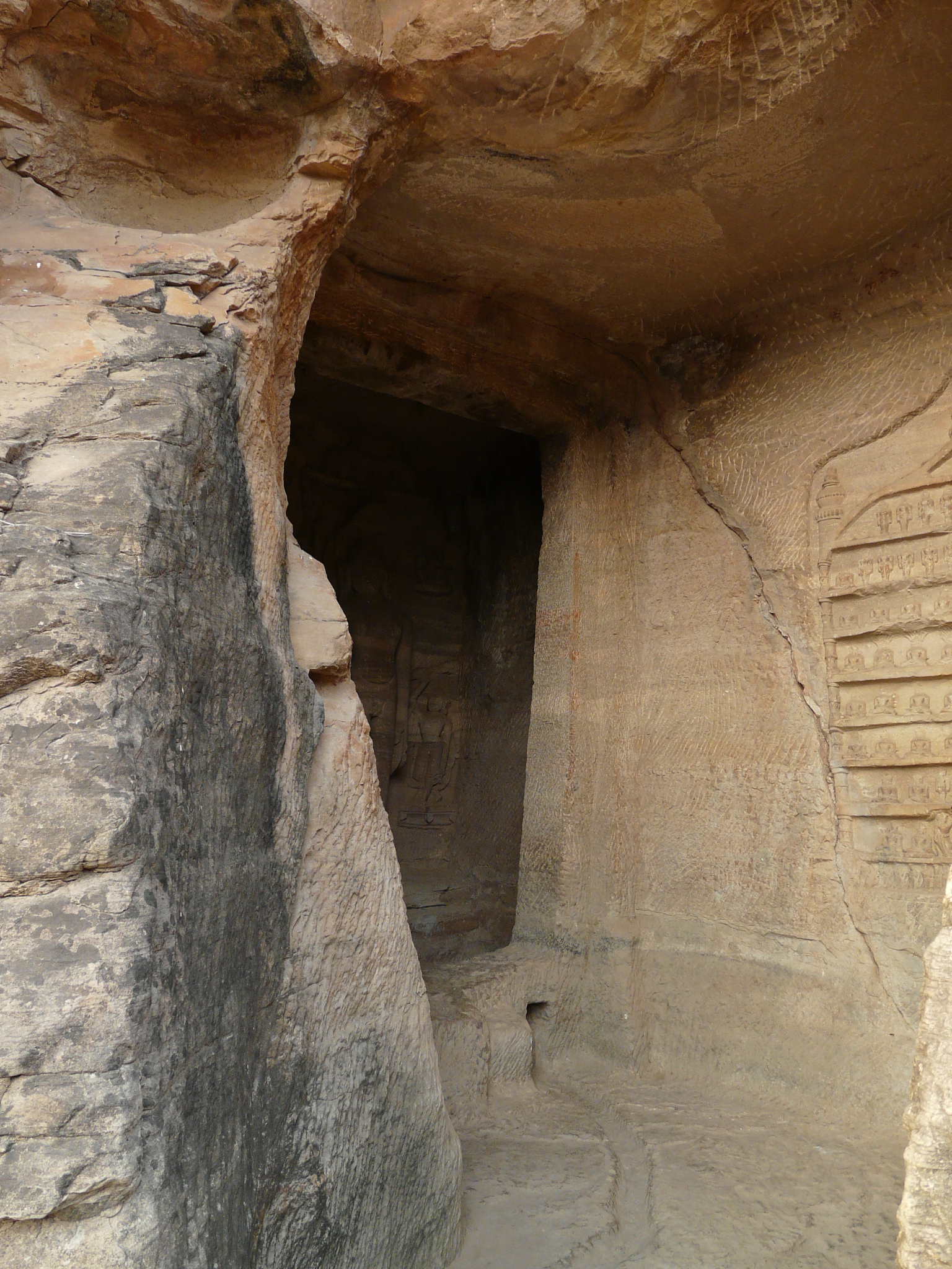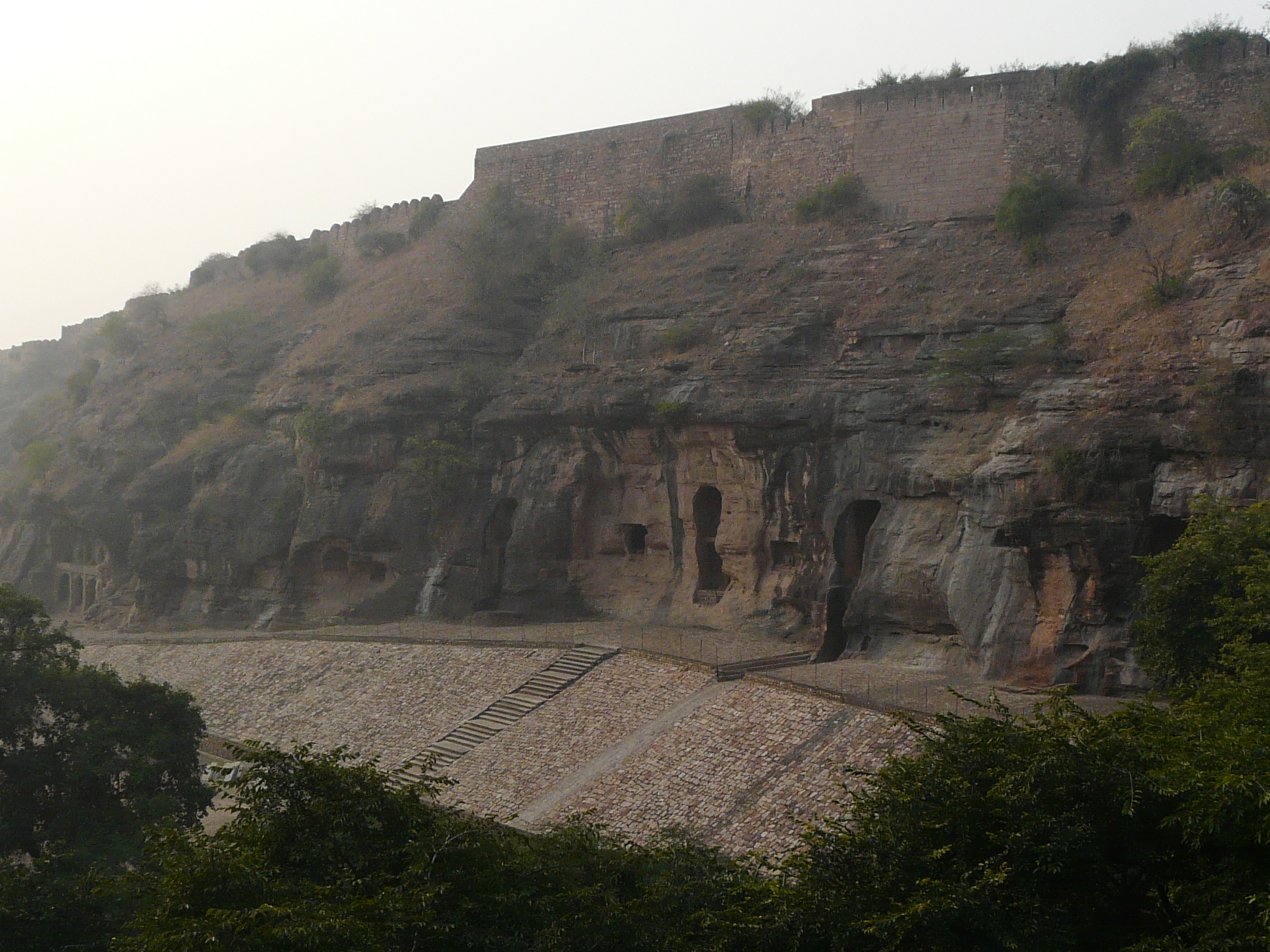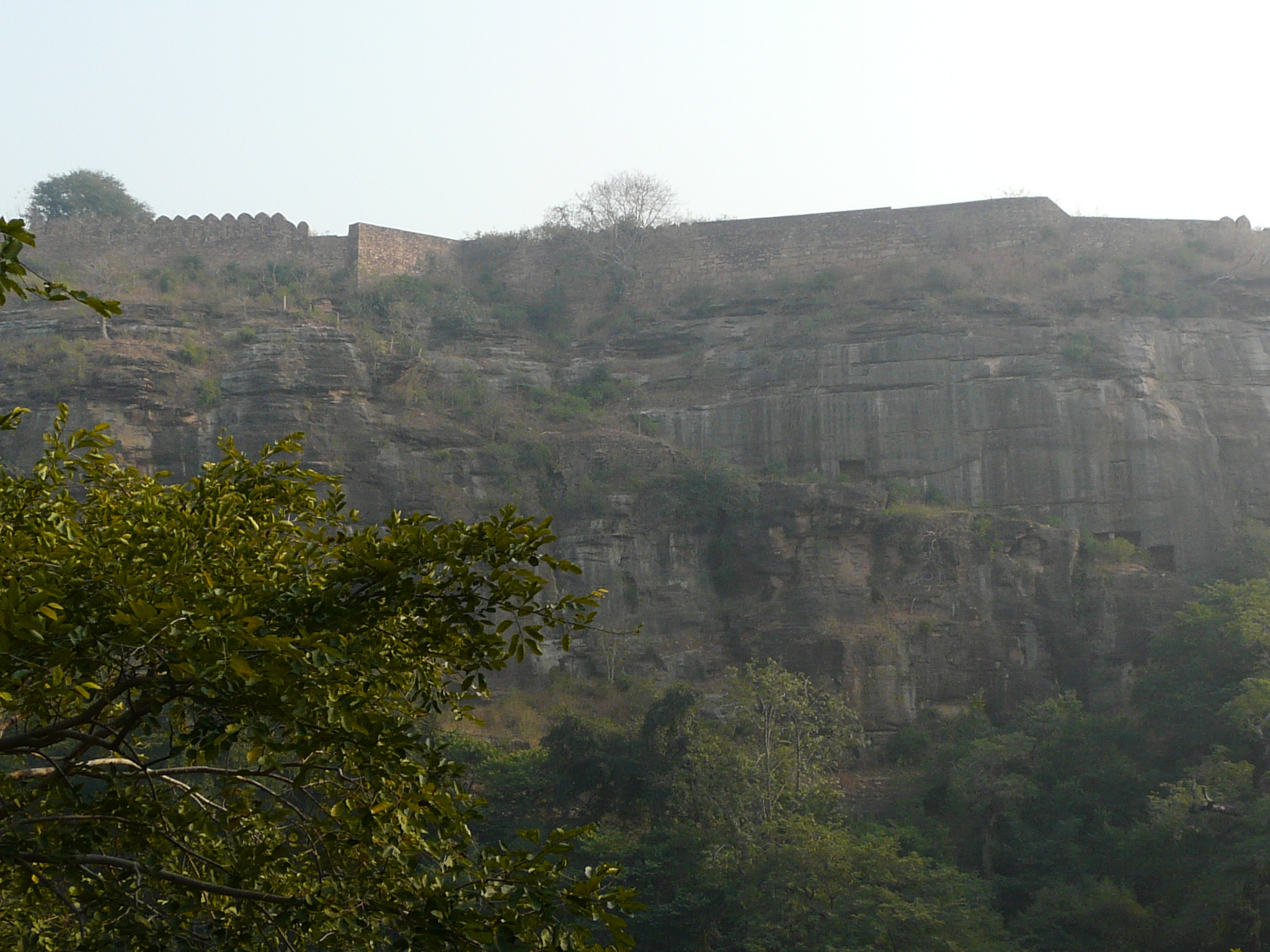 Rock-cut caves can be seen along a path leading down the escarpment in Urwahi Valley from the fort above: