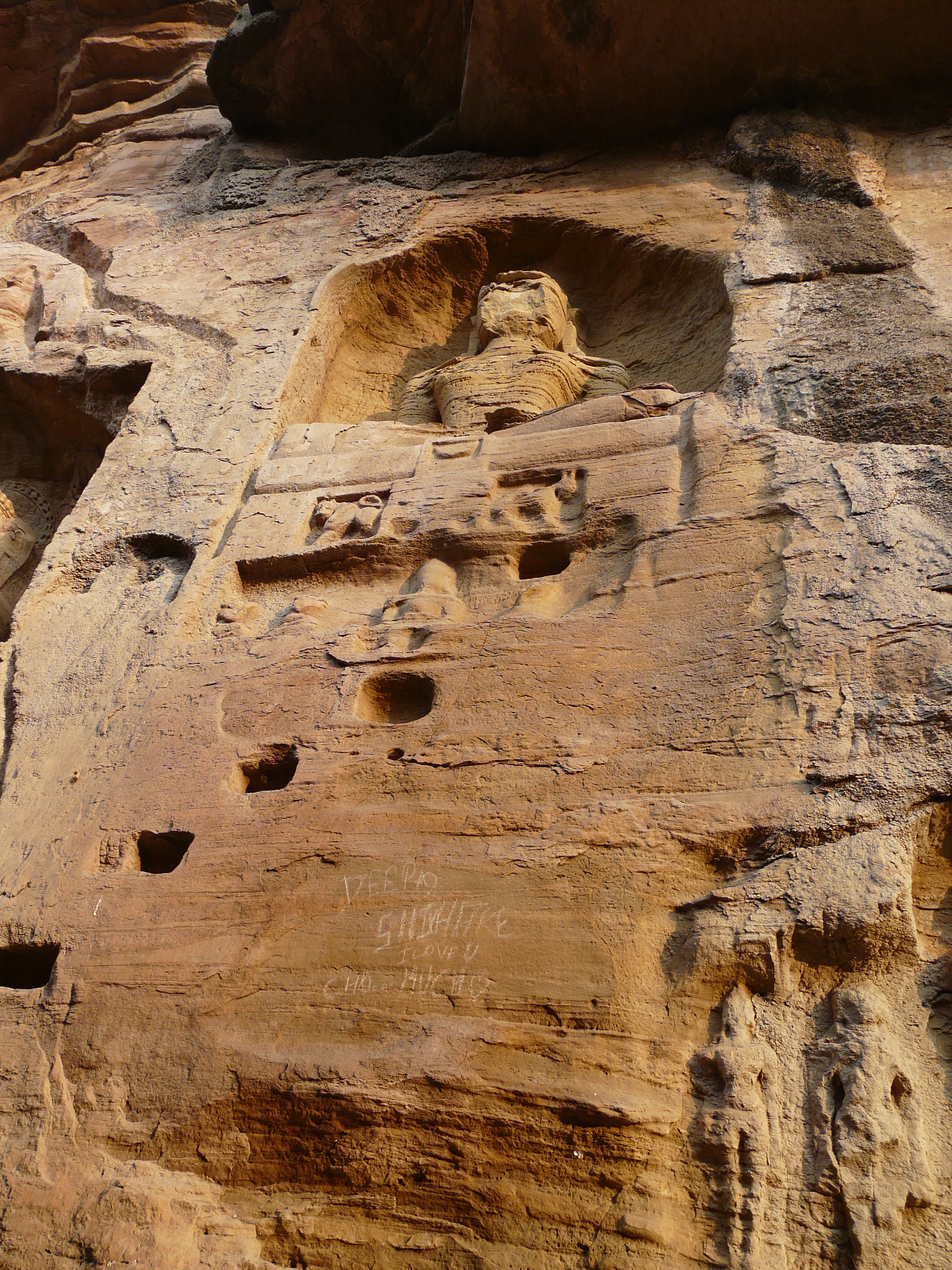Before we come to the first of these two major groups, even before we enter the lower fortifications of Urwahi Valley, there is a smaller group with smaller sculptures, which are now controlled/maintained by a new Jain temple at the site. I’m not sure how old these statues are: