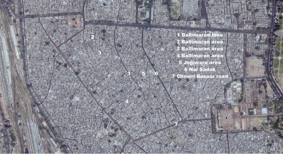 This post covers a portion of the area of Old Delhi just south of Chandni Chowk road, enclosed by Chandni Chowk and Katra Bariyan roads to the north, Nai Sadak to the east, Chawri Bazaar road to the south and Lal Kuan road to the west, with Ballimaran lane running through it. Ballimaran lane is one of several streets running north-south from Chandni Chowk road to Chawri Bazaar road.