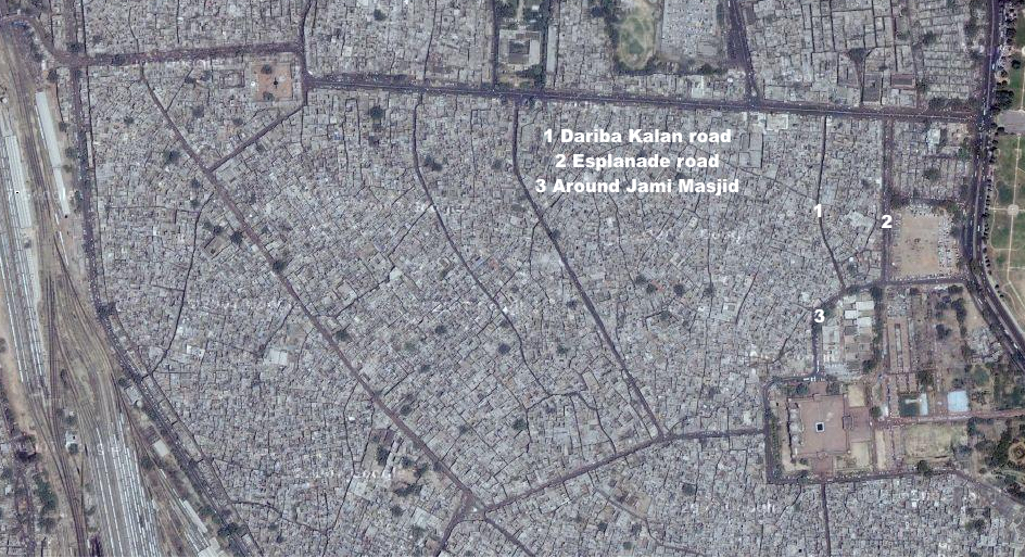 Portions of the city around Jami Masjid were also torn down, including just north of the mosque, which is why the southern ends of both Dariba and Esplanade lead to a more open area, demarcating the edge of the dense section of the old city.
