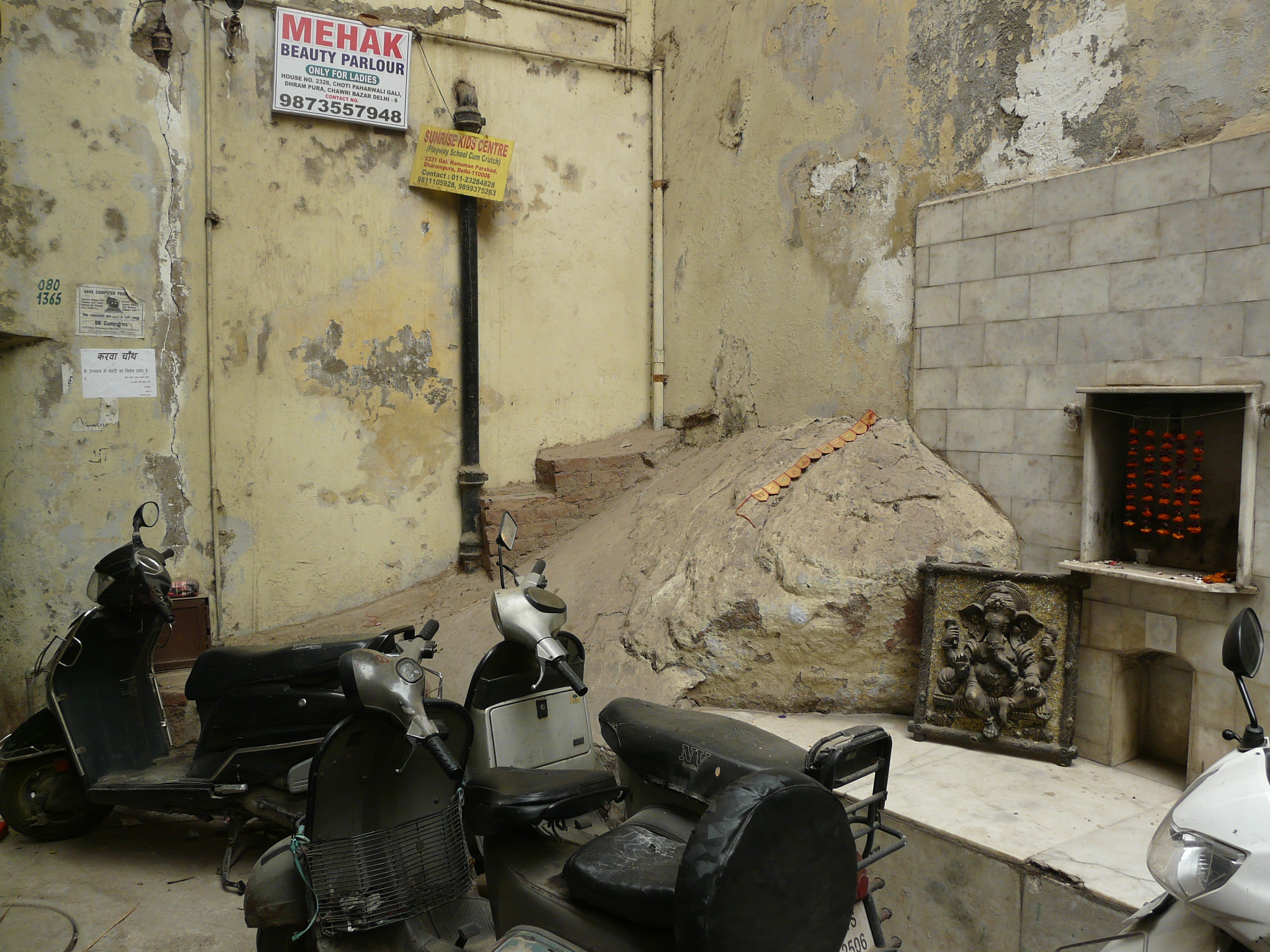 In any case, I returned to the first boulder in Roshanpura to take a photo, and noticed that the lane that the boulder was on was called Gali Bari Paharwali (“Lane of the Large Hill”). This I found absolutely intriguing, and a local shopkeeper said that there used to be a bit of a hill here, and the lane went past the hill and so got its name. He also told me that the next lane south of there was called Gali Choti Paharwali (“Lane of the Small Hill”) and there was a smaller boulder on that lane too, and sure enough it was there. This took my boulder count in Old Delhi to three!