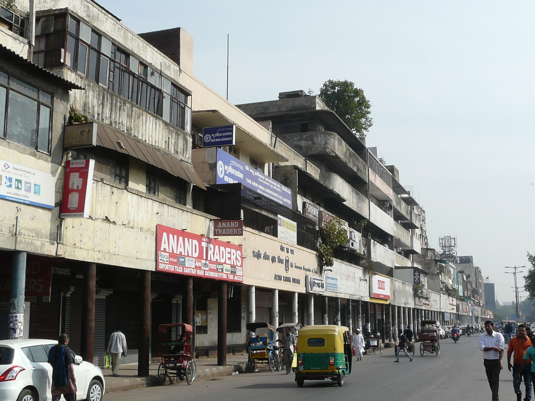 The first iteration of this line of buildings was probably the two or three story high structures from around the 1940s, with colonnaded commercial space on the ground floor and either residences or office spaces above, a few examples of which still exist. After these came larger commercial buildings in later decades. The photos were taken in an east to west order, from Delhi Gate to Ajmeri Gate.