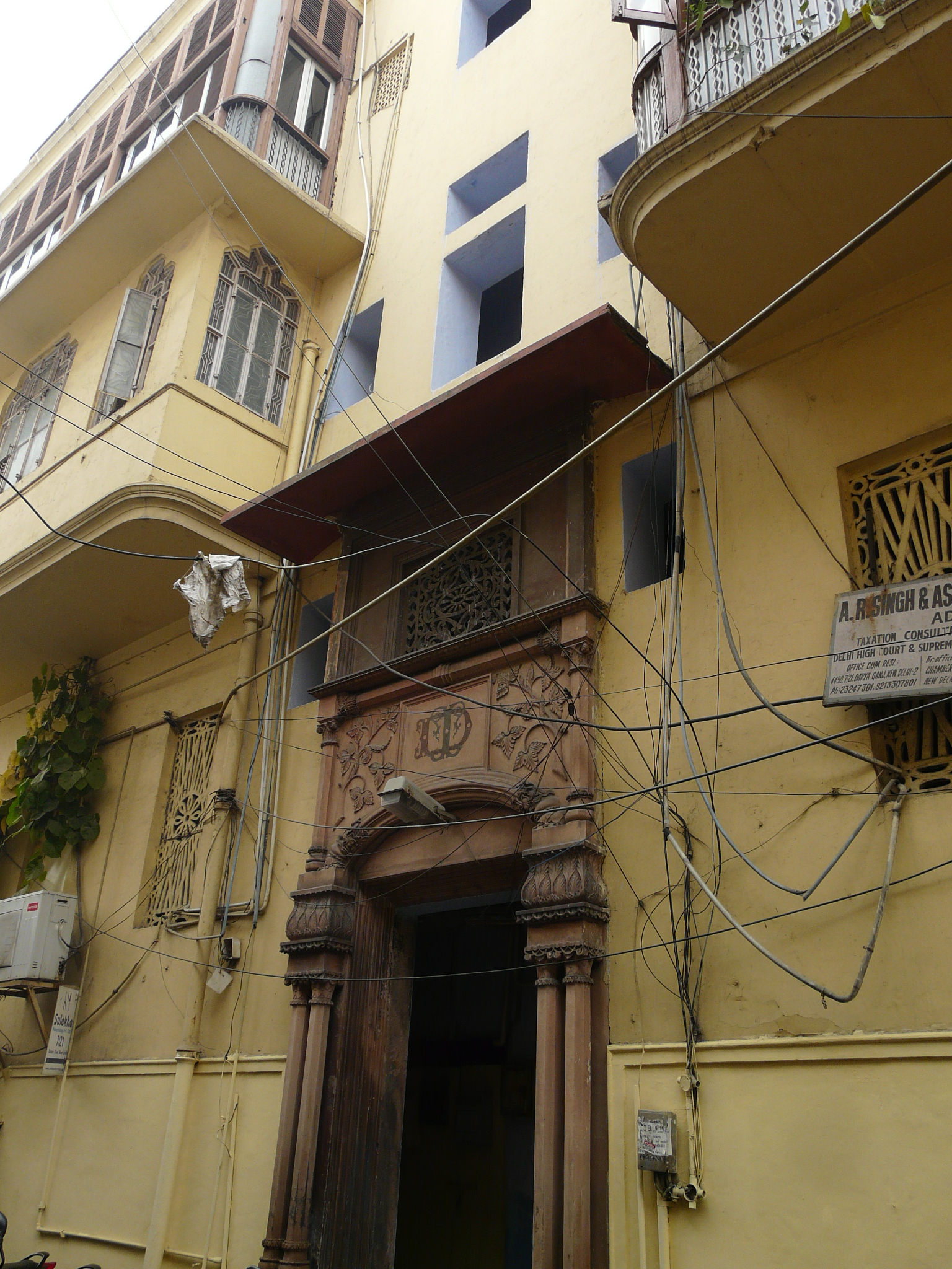 A building in a simple neoclassical colonial style, with a “haveli” type stone-clad doorway that was popular in Shahjahanabad in earlier decades