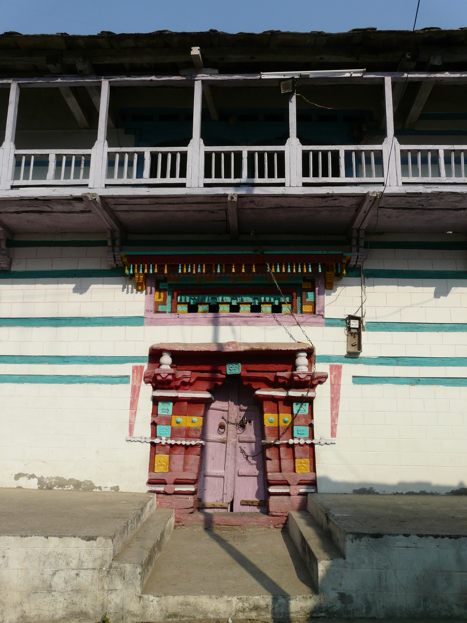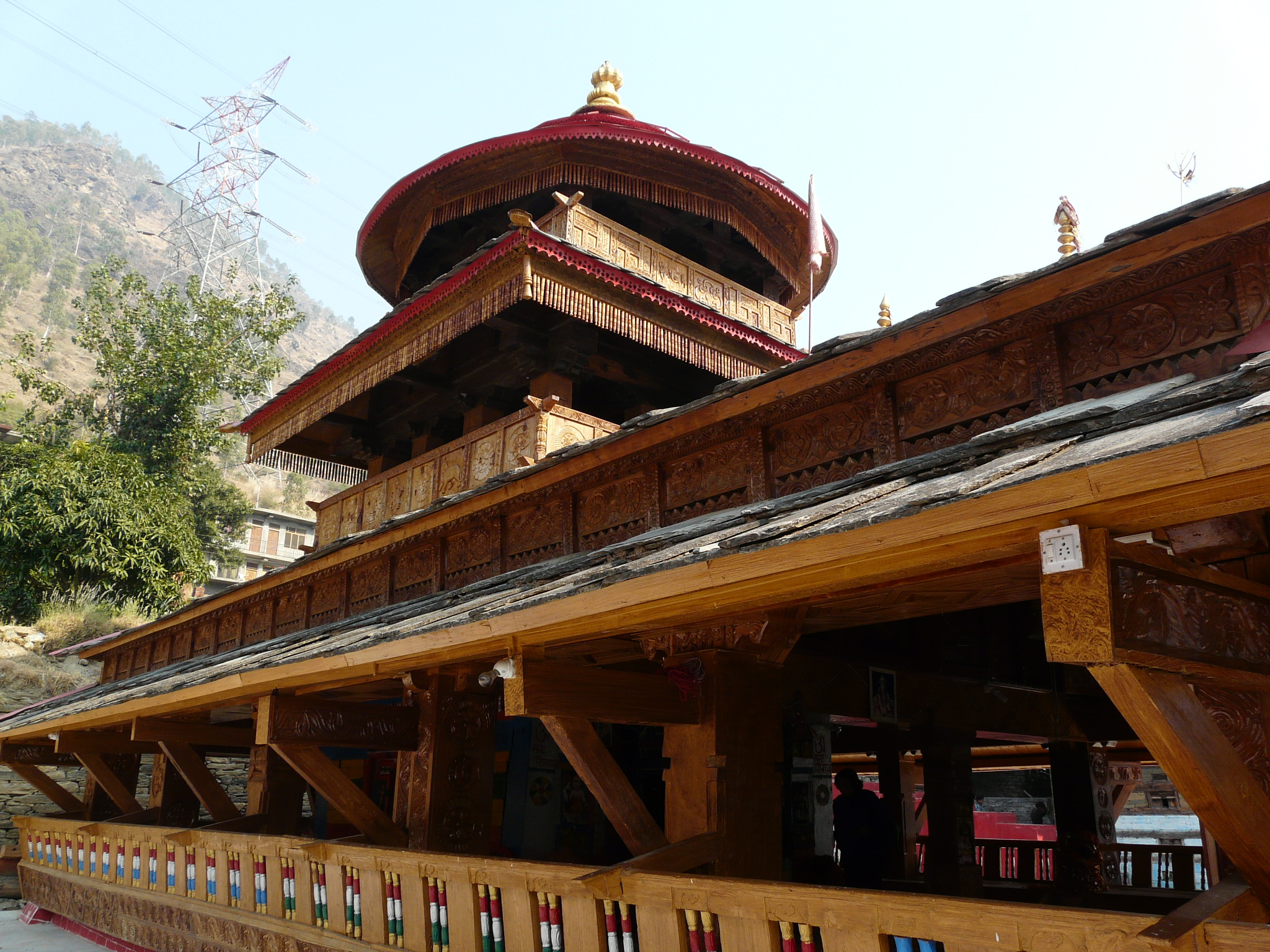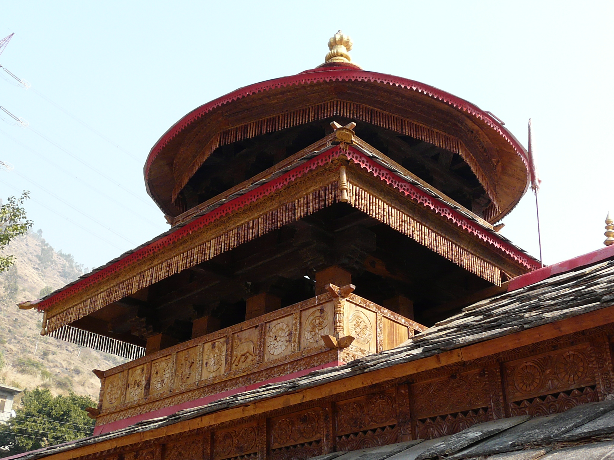 Behna is a village located on a high shelf a few dozen meters above the Satluj River, on the road from Rampur to Jalori Pass and the Kullu Valley beyond. Like the Durga Temple at Manan, this is a Satluj Valley Style wooden temple, with a compound gabled roof and multi-storied “pagoda roof” above the sanctum. The temple hall is open on three sides with seating around the perimeter. George Michell’s “Monuments of India” puts this temple as being from the 16th-17th c. However all the woodwork of the temple was recently replaced with new wood. It still looks good, even with the simulated brickwork paint job on the outside.
