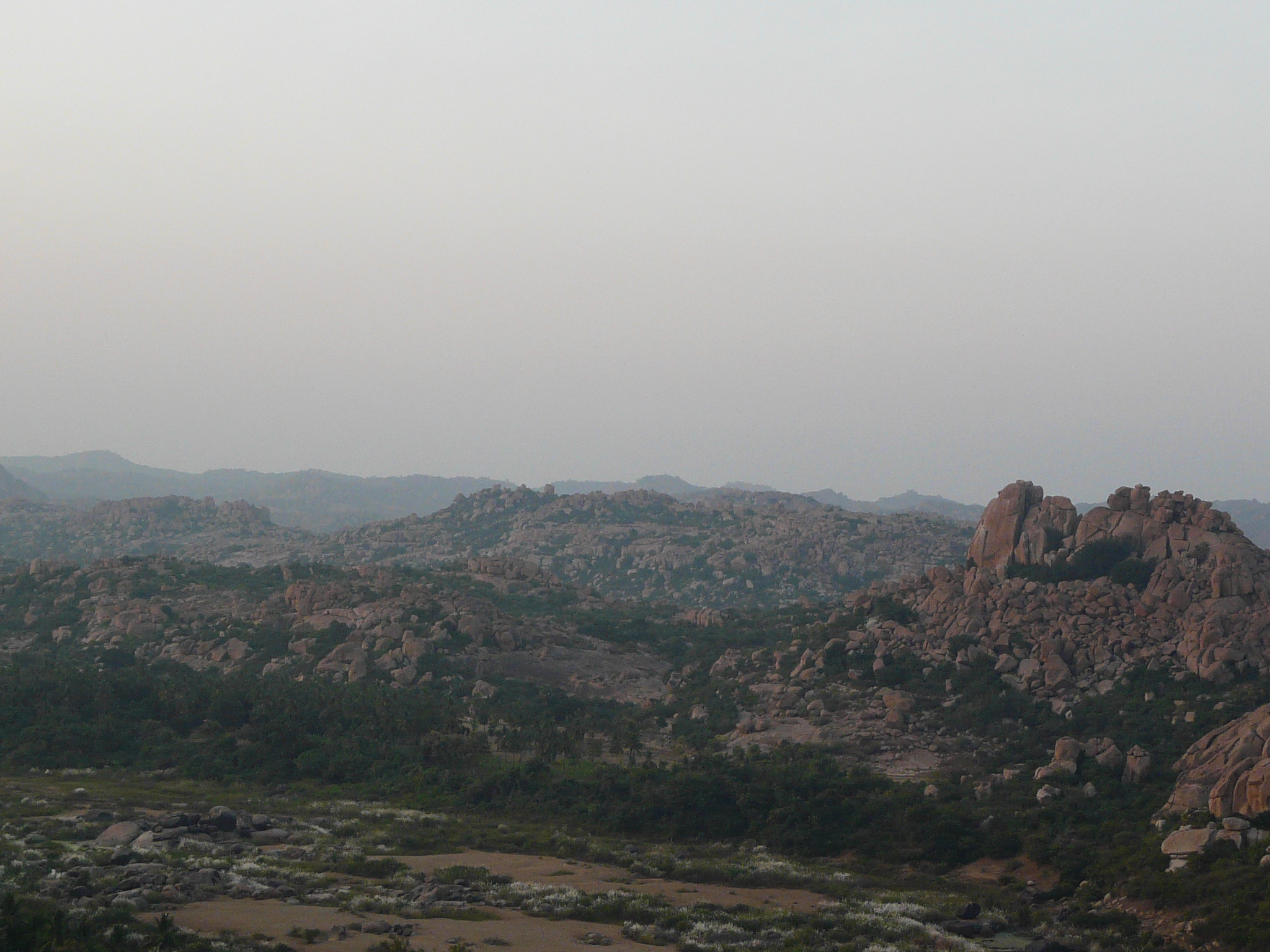 The two images below look southwards from Matanga Hill in the Sacred Center towards the irrigated and cultivated valley that lies between the hills of the Sacred Center and Royal Center. In the first photo the Achyutaraya Temple can be seen at the bottom left.