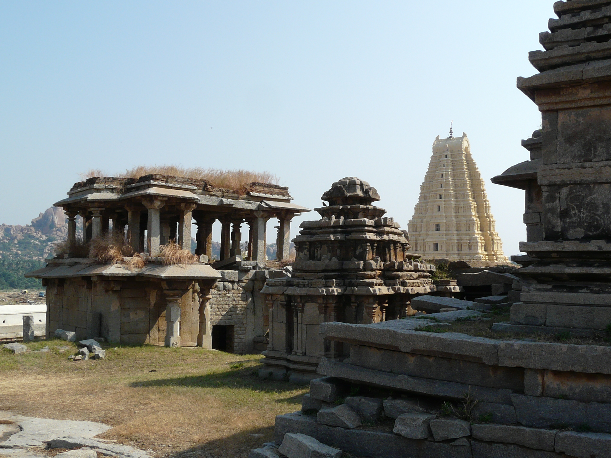 Temples and gateways on Hemakuta Hill with the gopuram of Virupaksha Temple behind them, in the Sacred Center