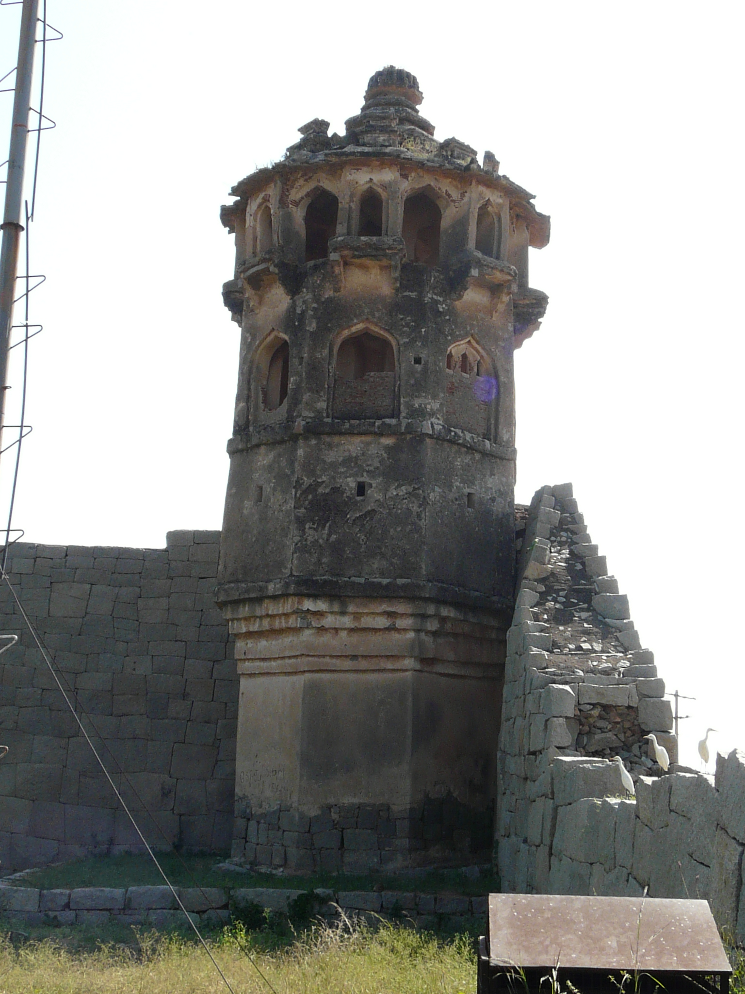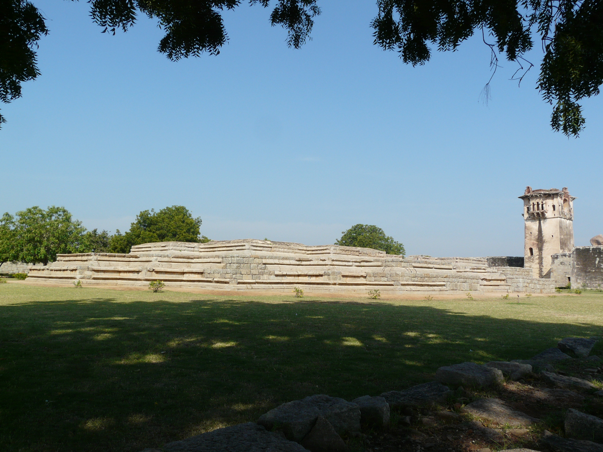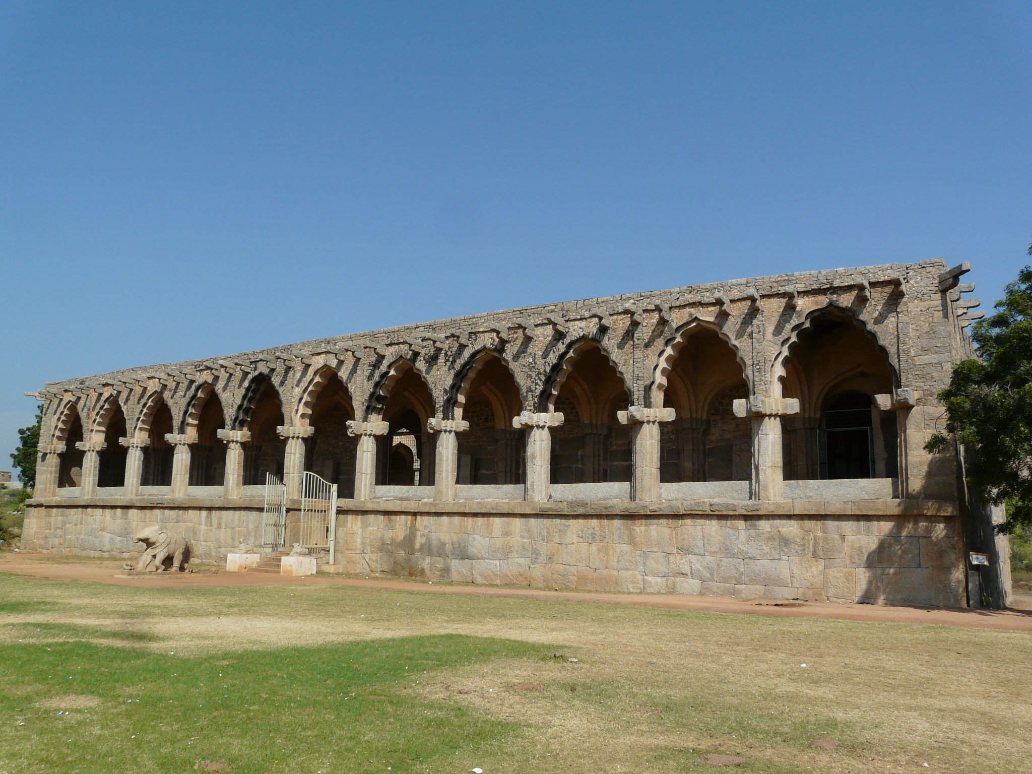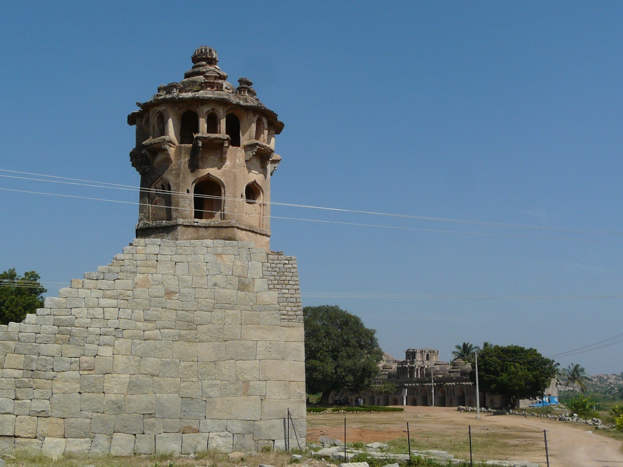 The Lotus Mahal enclosure (also named the Zenana enclosure though it probably wasn’t the zenana), is named after a relatively intact palace building within it known as Lotus Mahal. As mentioned before, many of the secular palace structures borrowed freely from Deccan Sultanate architecture, as opposed to temple buildings in Vijaynagar, which strictly followed south Indian traditions of Hindu (and Jain) temple design. Thus we have free use of arches, vaults and domes in palace buildings. However the multiple towers above the many bays of Lotus Mahal represent a unique stylistic element. These towers are a reworking of the horizontally layered tapering towers we see over temple shikhars (towers) at Hemakuta Hill (as an example). These secular structures therefore represent a hybrid style particular to Vijaynagar architecture.
