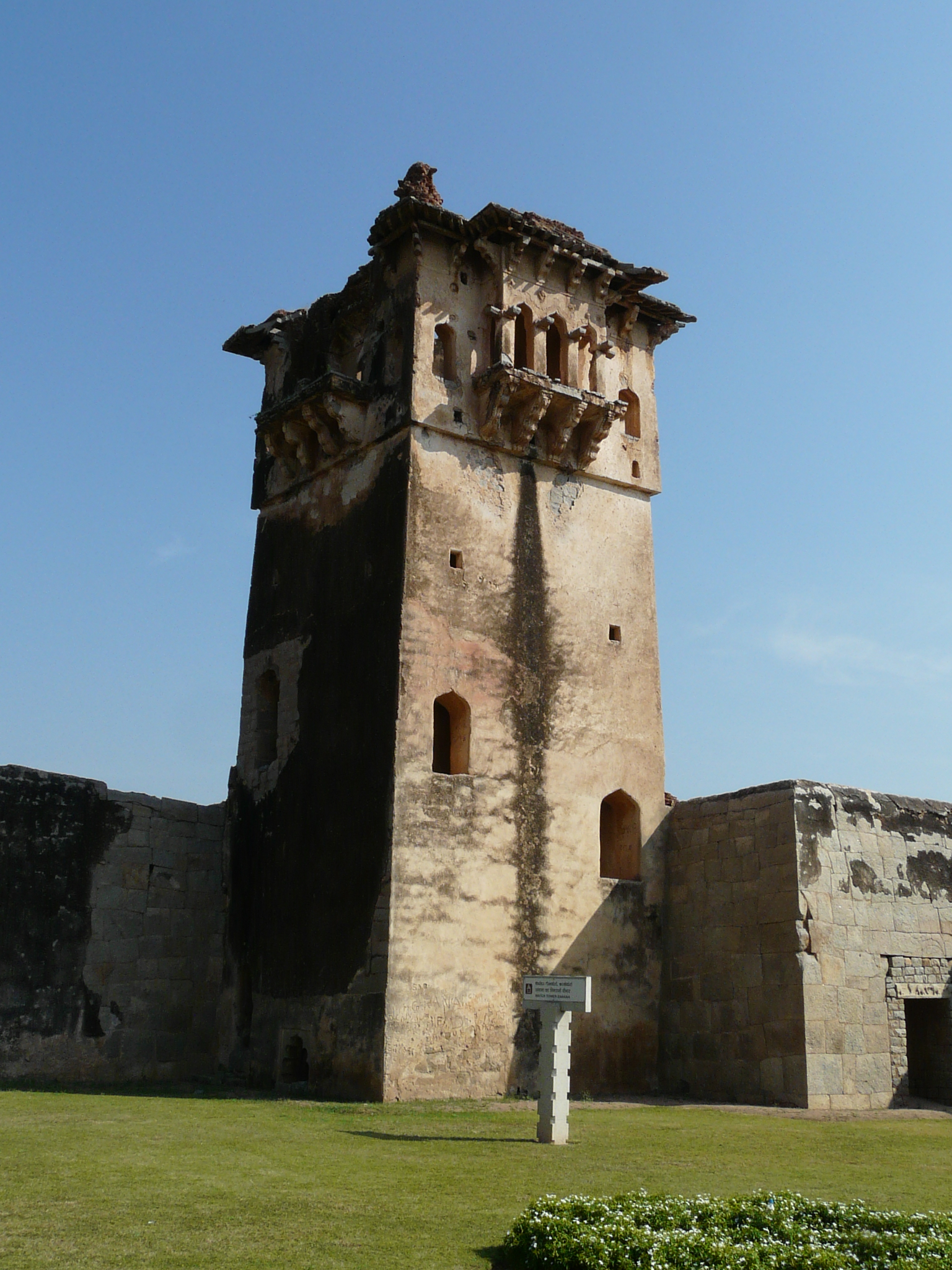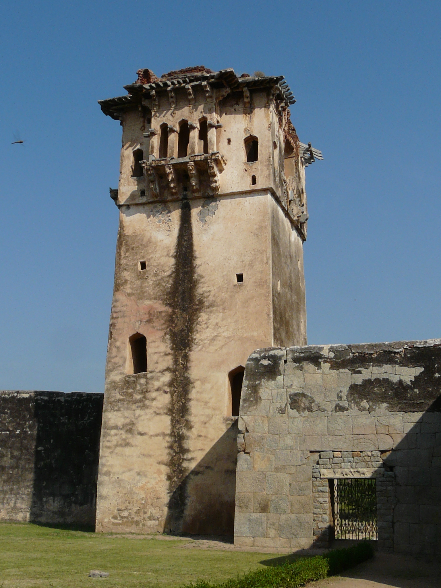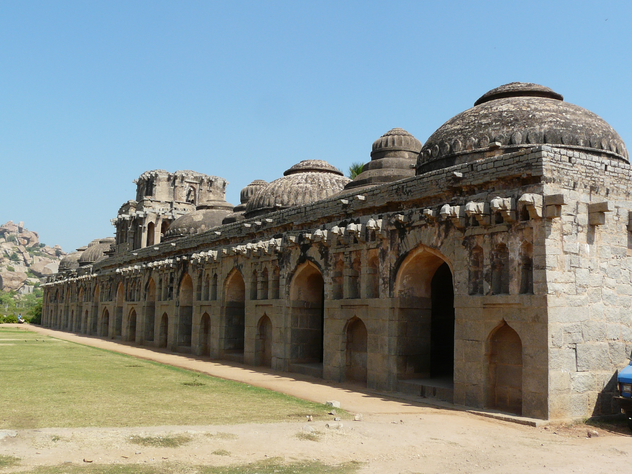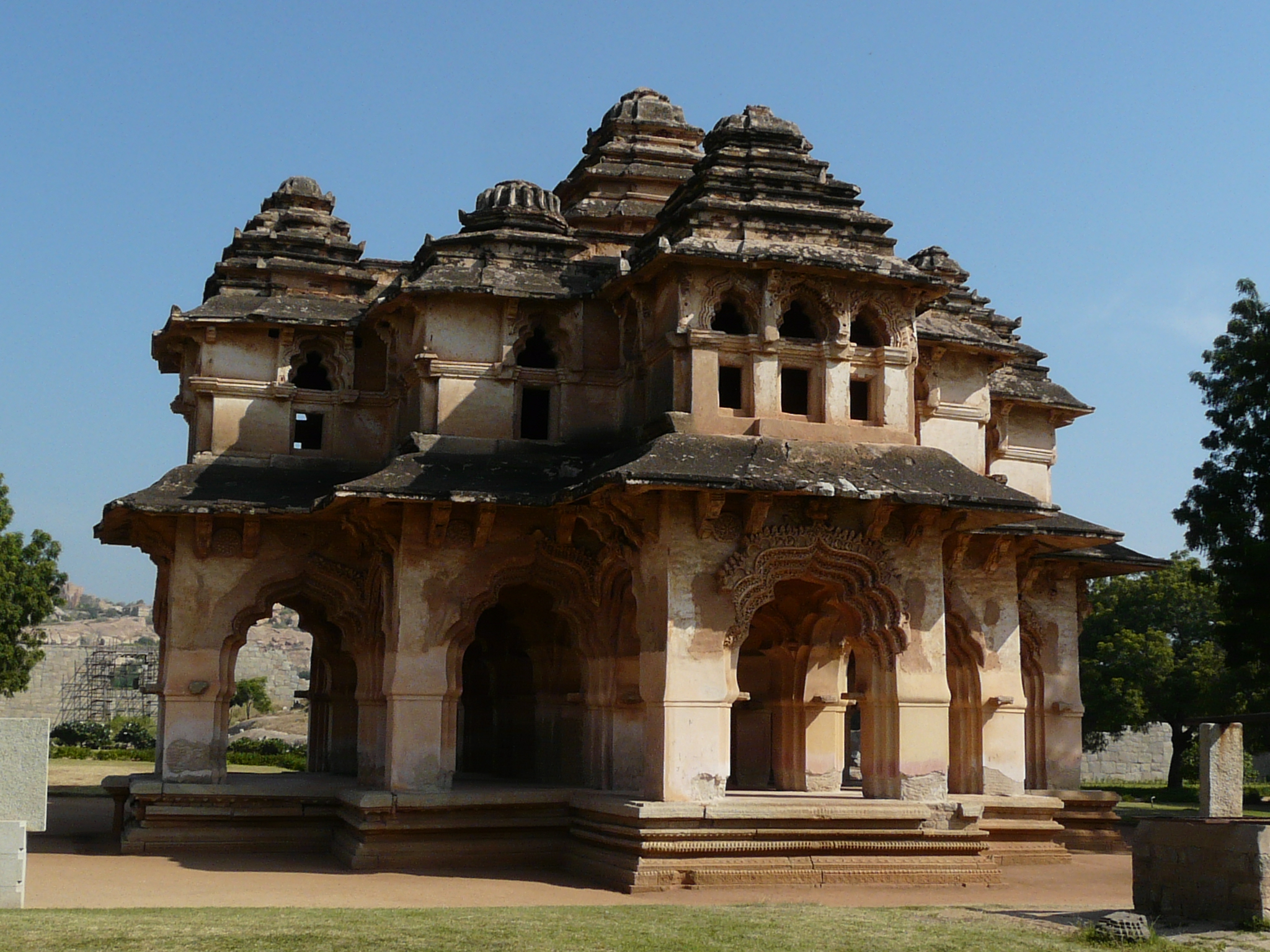 The Lotus Mahal enclosure (also named the Zenana enclosure though it probably wasn’t the zenana), is named after a relatively intact palace building within it known as Lotus Mahal. As mentioned before, many of the secular palace structures borrowed freely from Deccan Sultanate architecture, as opposed to temple buildings in Vijaynagar, which strictly followed south Indian traditions of Hindu (and Jain) temple design. Thus we have free use of arches, vaults and domes in palace buildings. However the multiple towers above the many bays of Lotus Mahal represent a unique stylistic element. These towers are a reworking of the horizontally layered tapering towers we see over temple shikhars (towers) at Hemakuta Hill (as an example). These secular structures therefore represent a hybrid style particular to Vijaynagar architecture.