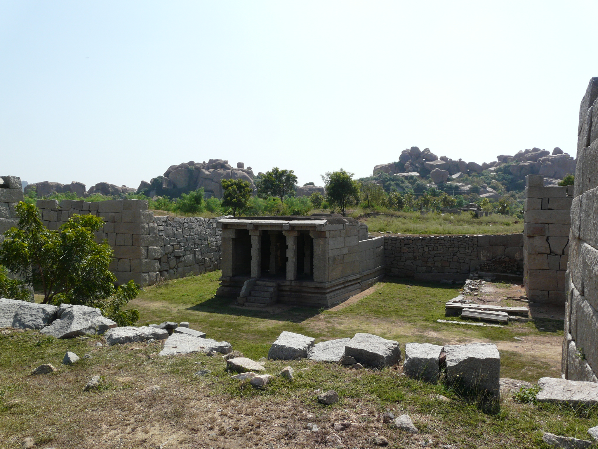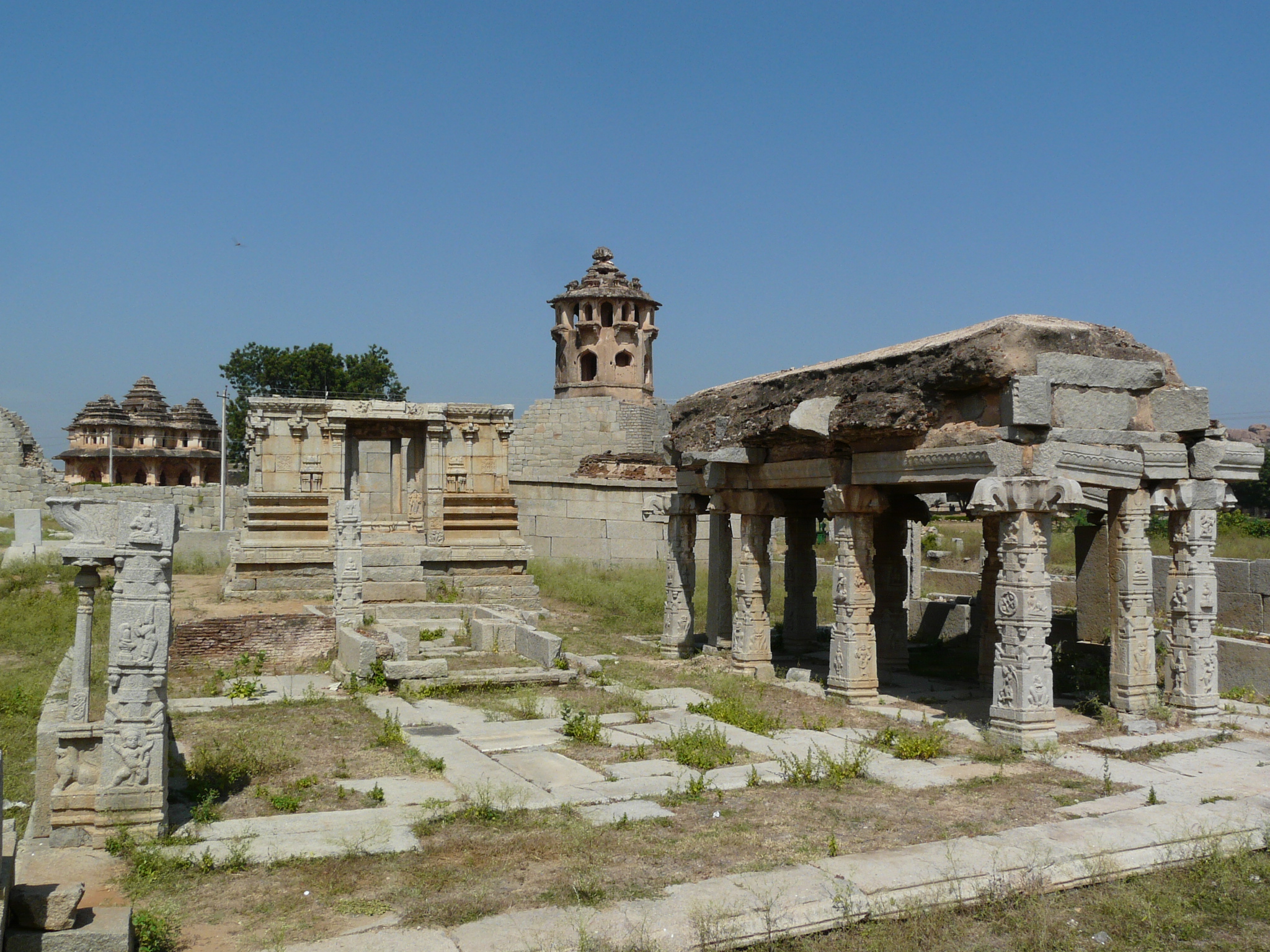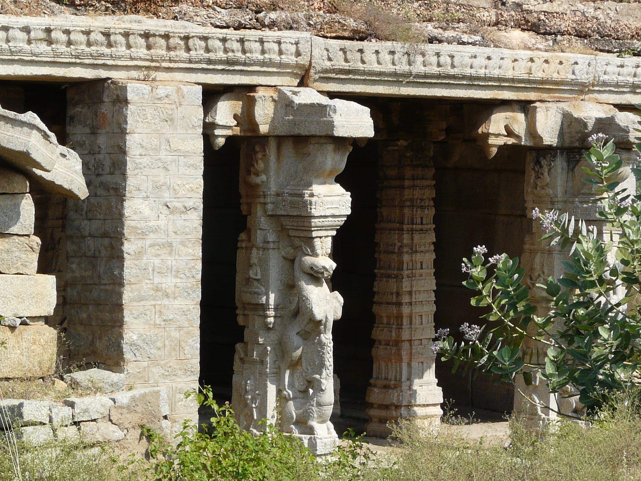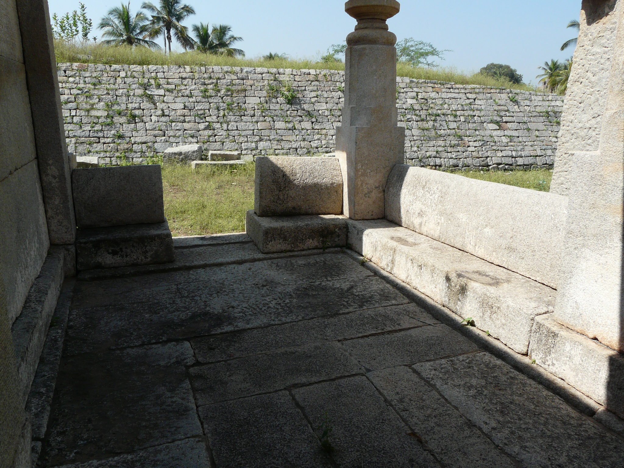 To the immediate south and east of the Lotus Mahal enclosure and elephant stables are a scattering of interesting smaller structures. These lie on a road that started from the front of Hazara Rama Temple at the center of the Royal Center and led out of the center via a gateway to the east.