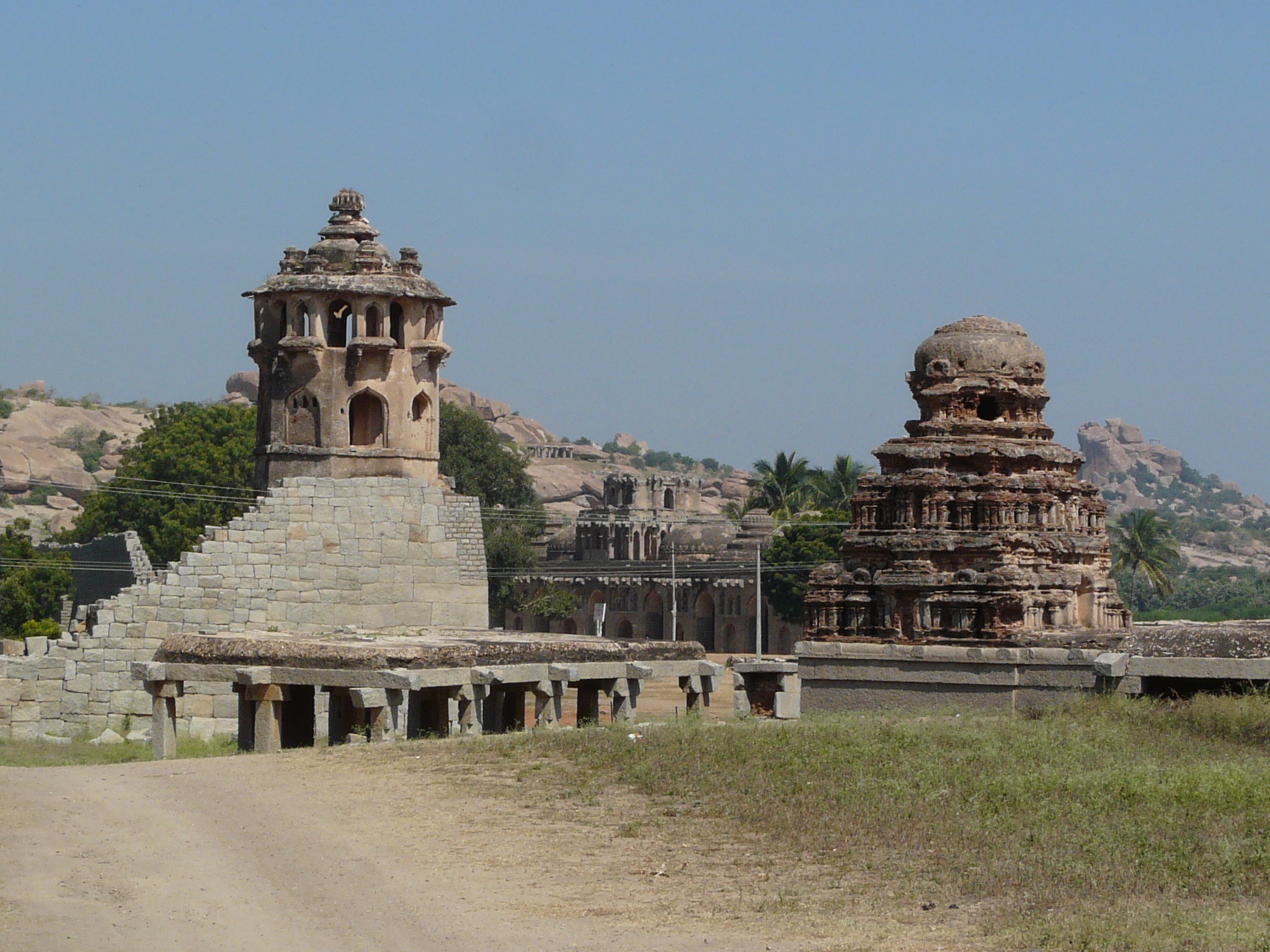 Ranga temple shikhar, Lotus Mahal enclosure watchtower with elephant stables behind, and more structures on the hillock in the background