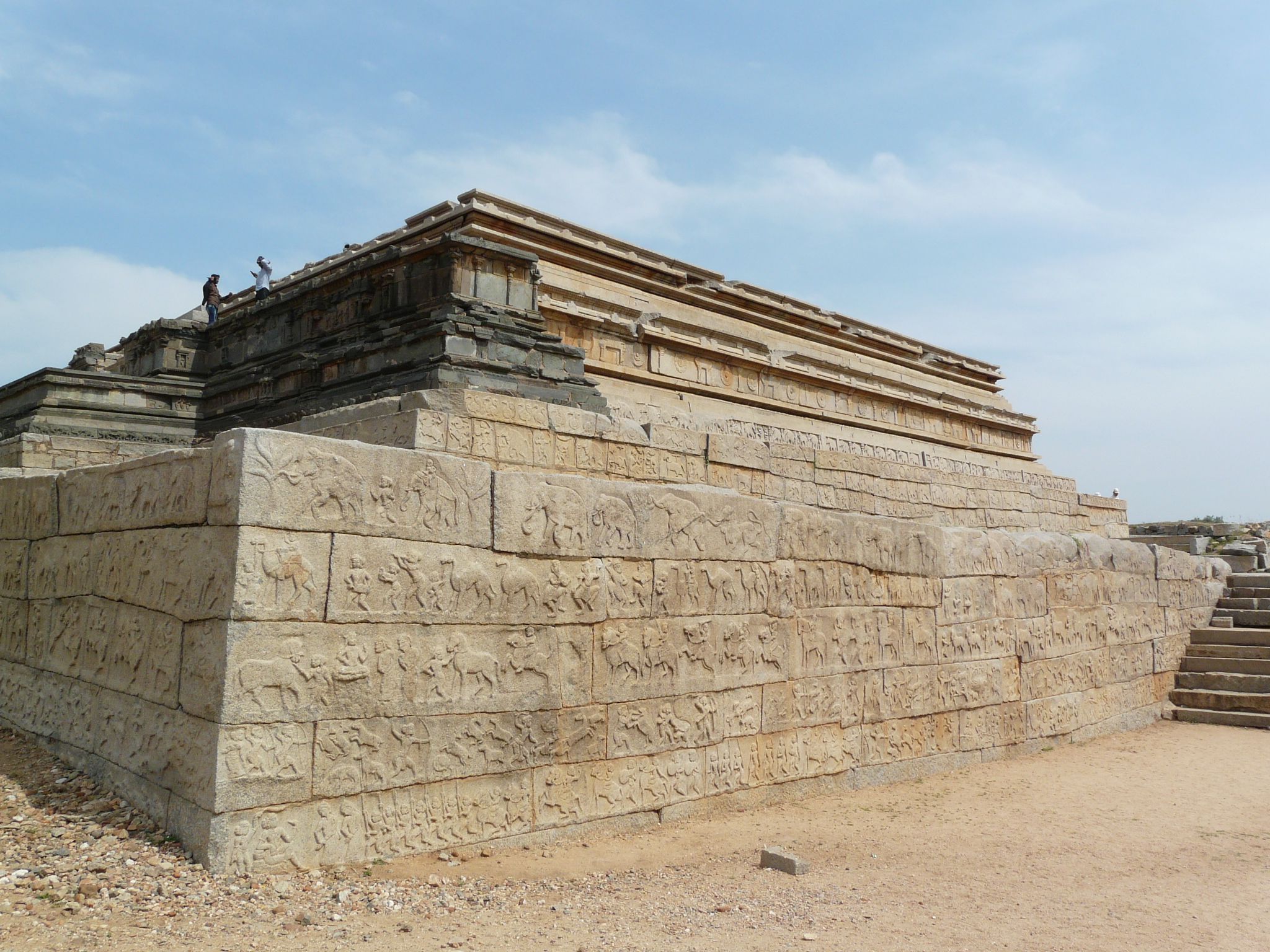 In one of the a larger enclosures of the Royal Center sits the unique Mahanavami Platform, said to be used by the Vijaynagar rulers for ceremonies related to Navratri festivities. It is a high platform that rises in multiple levels. The top level has evenly-spaced stone bases which once supported the wooden columns of a superstructure.