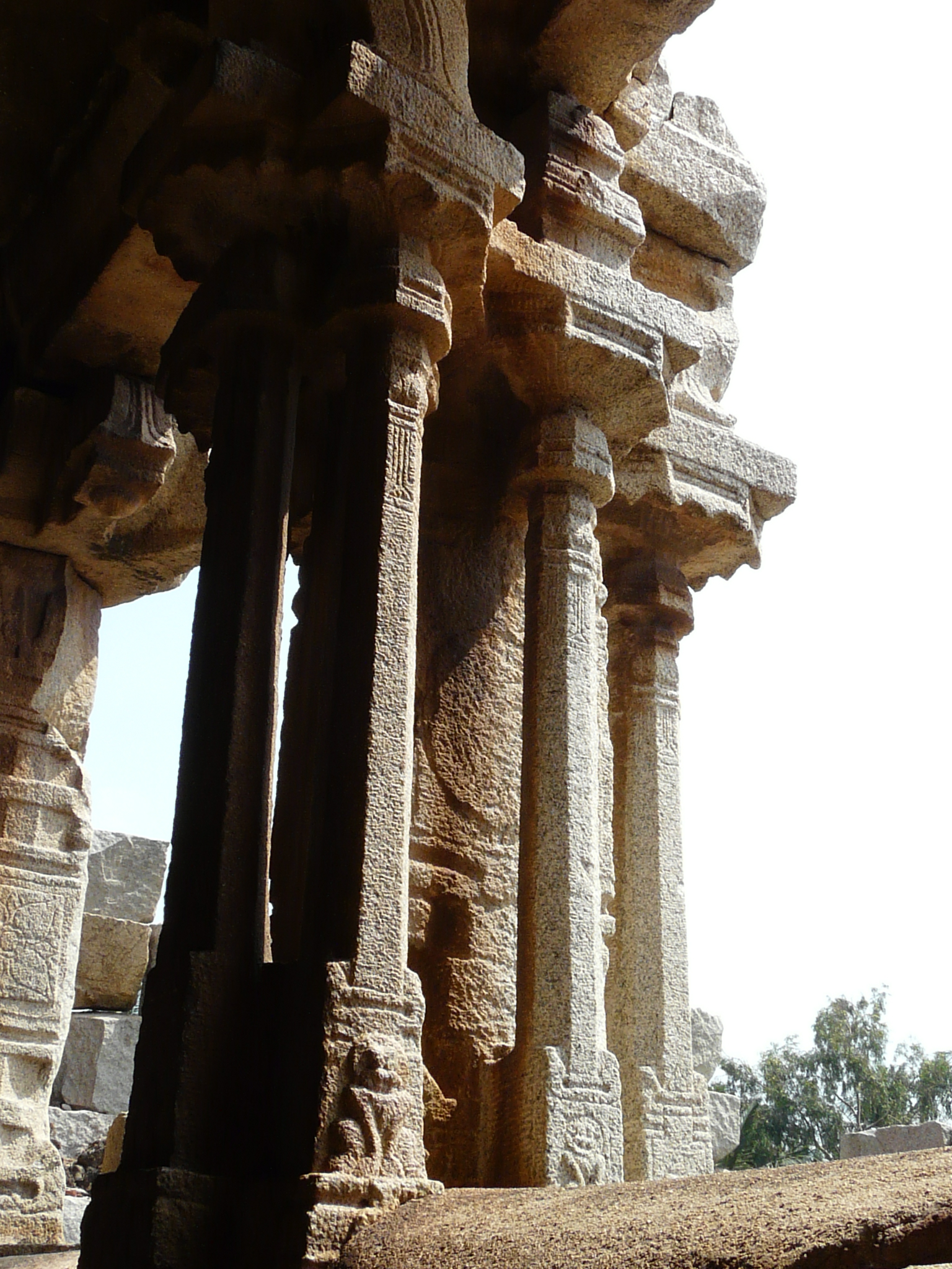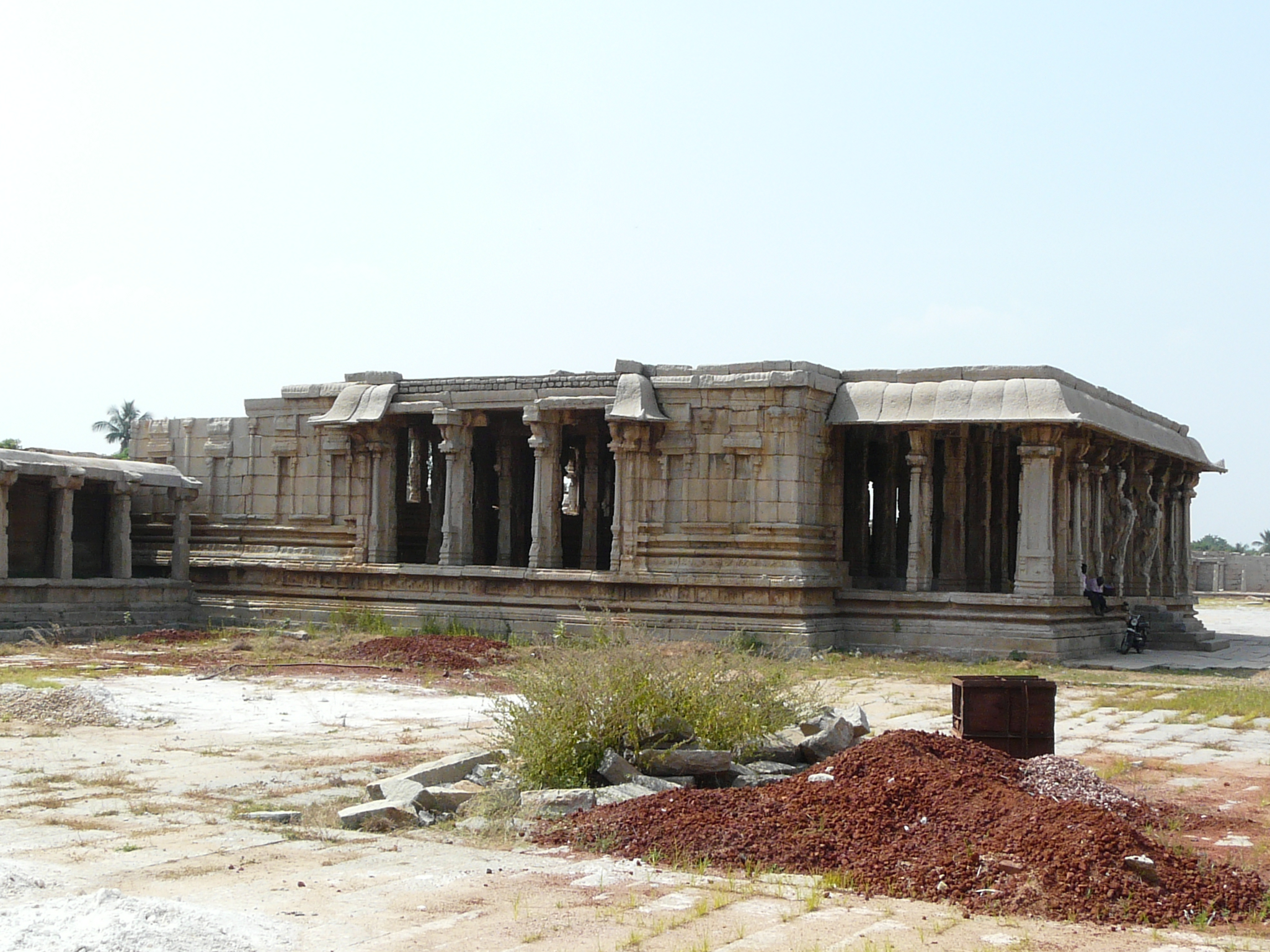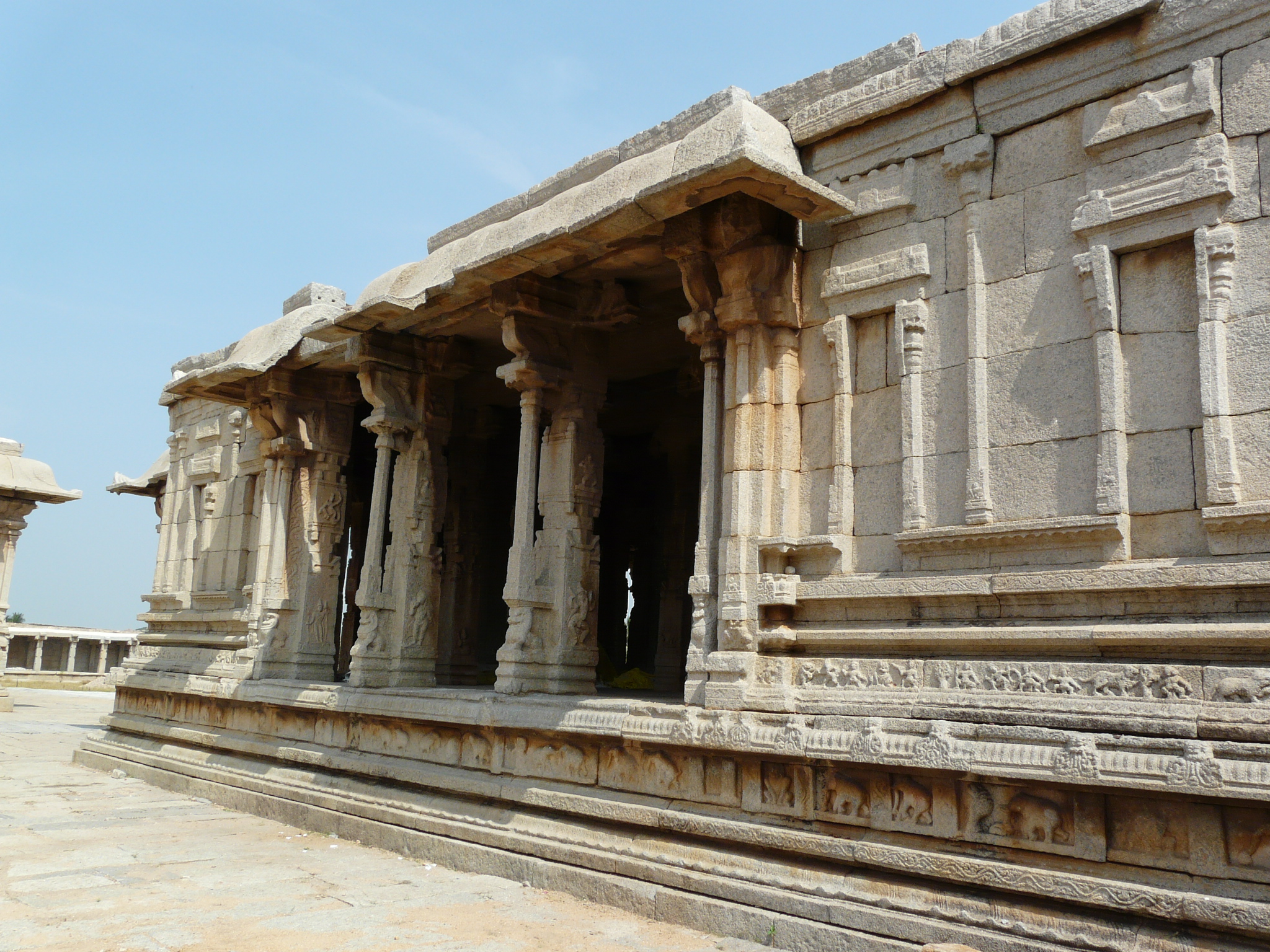 A little further east of Kamalapur is the large Pattabhirama Temple, probably from the 16th c. This temple is comparable in size to but less ornate than the Vitthala Temple. The plainness of its exterior allows us to easily see the basic layout of Vijaynagar-era temples, with their open columned mahamandaps, closed ardhmandaps with side entrance porches, and antaralay and shrine with enclosing circumambulatory passageway. Around the main temple structure the large bare courtyard allows us to easily mark out the main east gopuram, the colonnade running along the entire length of the perimeter wall interior, the Devi shrine to the north-west of the main shrine, and a mandap located along the south wall of the front (east) courtyard.