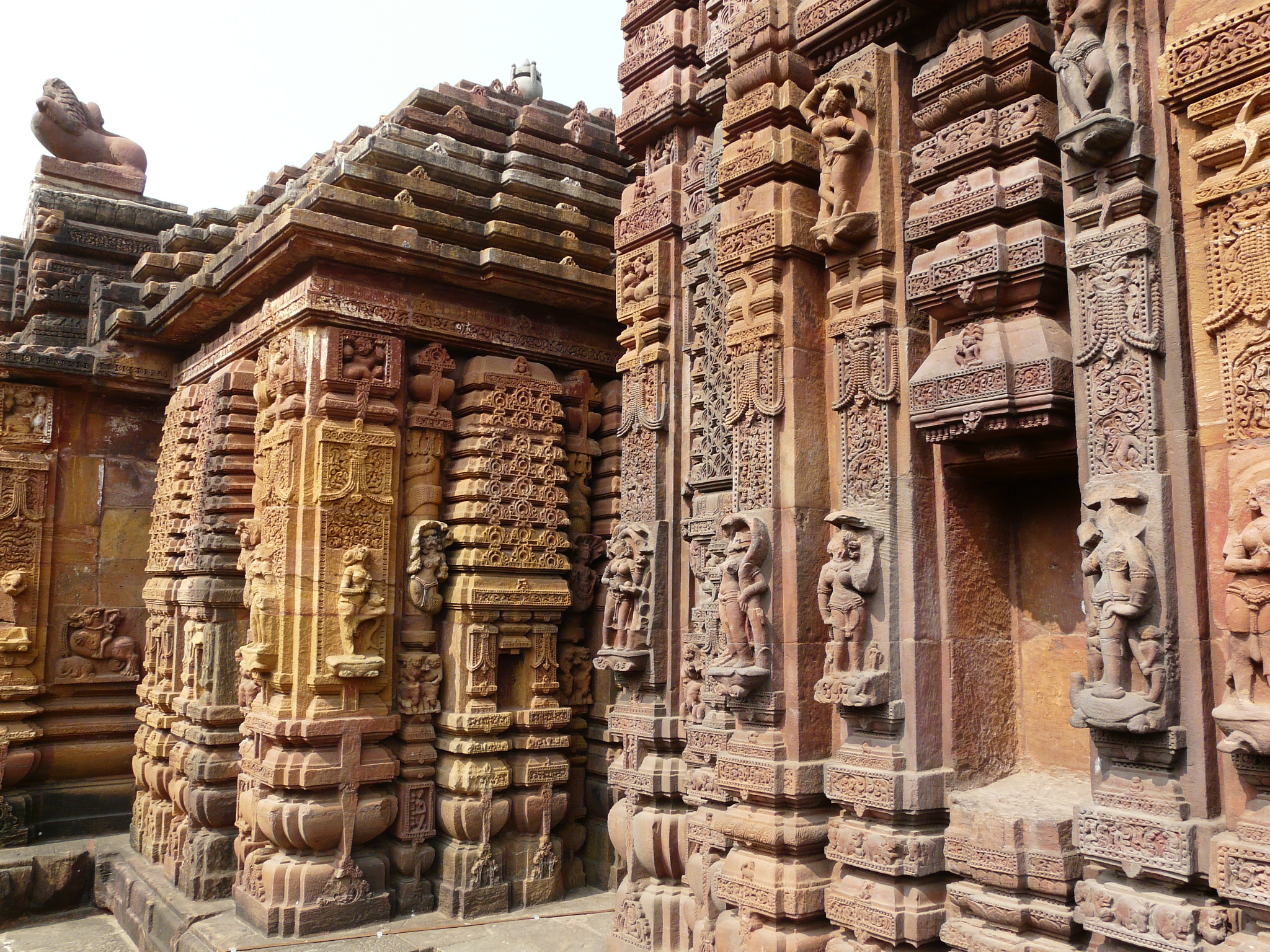 Mukteshwar, from the late-10th c, is the transitional example from the earlier style represented by the Parashurameshwar temple, and the later period of Odia temple architecture. The most obvious change is in the shape of the mandap, which for the first time gains the ‘Pidha Deul’ style, with a square base topped by a pyramidal roof which rises in a series of prominent horizontal layers/mouldings. Compare this to the rectangular mandap of earlier temples like Parashurameshwar.