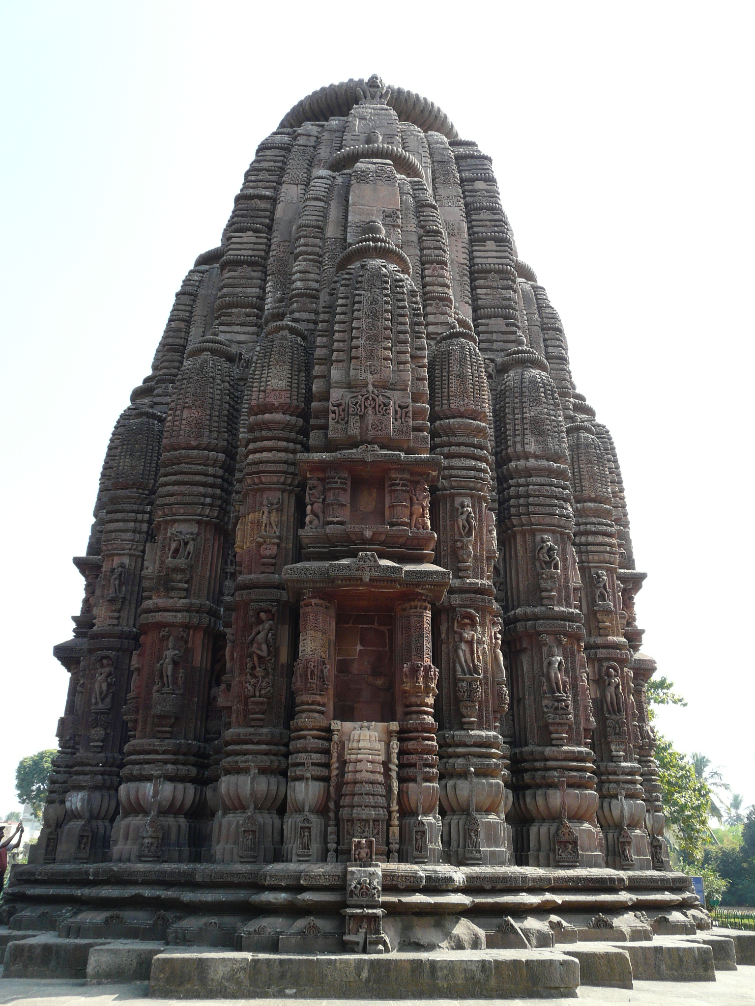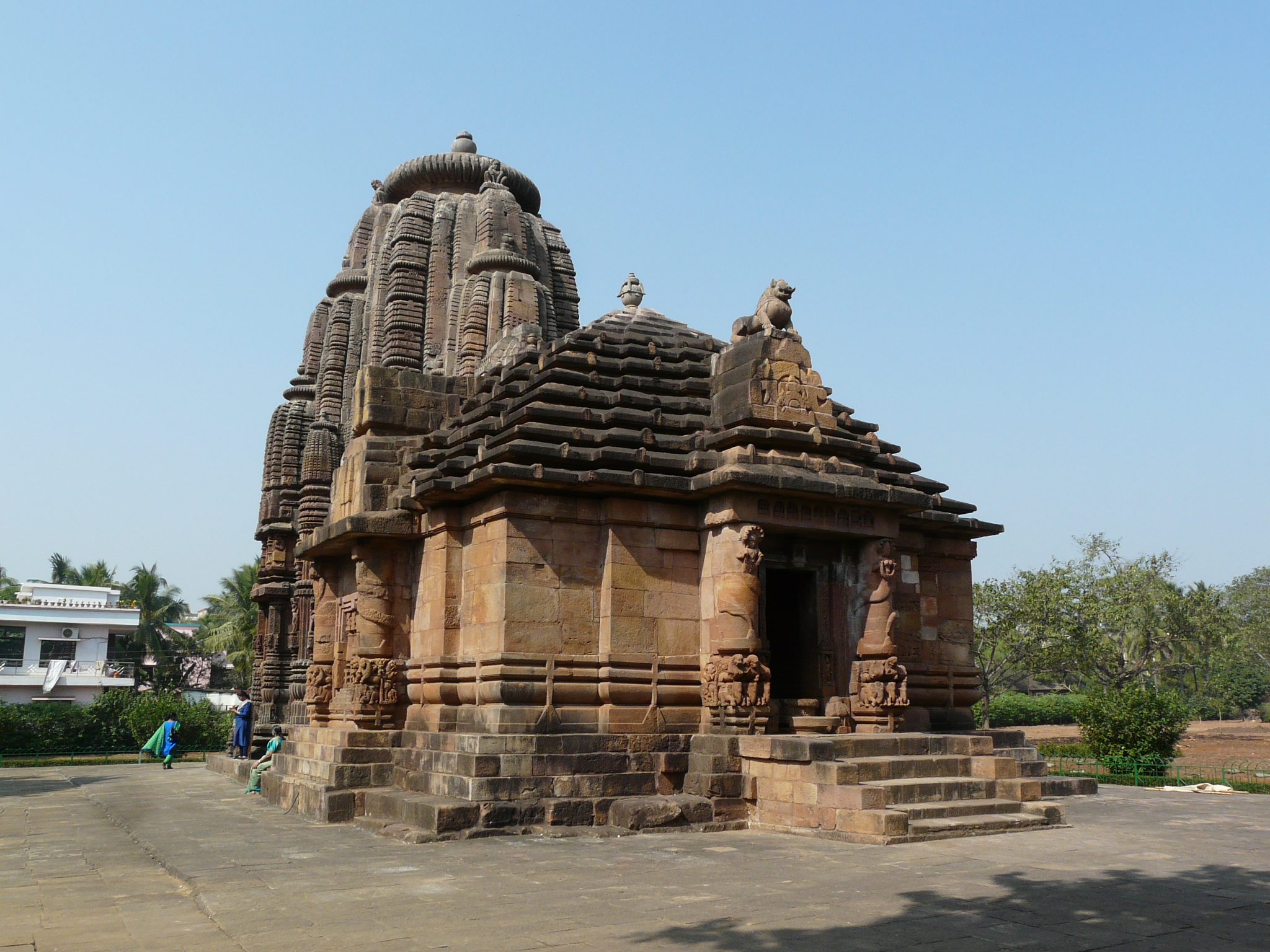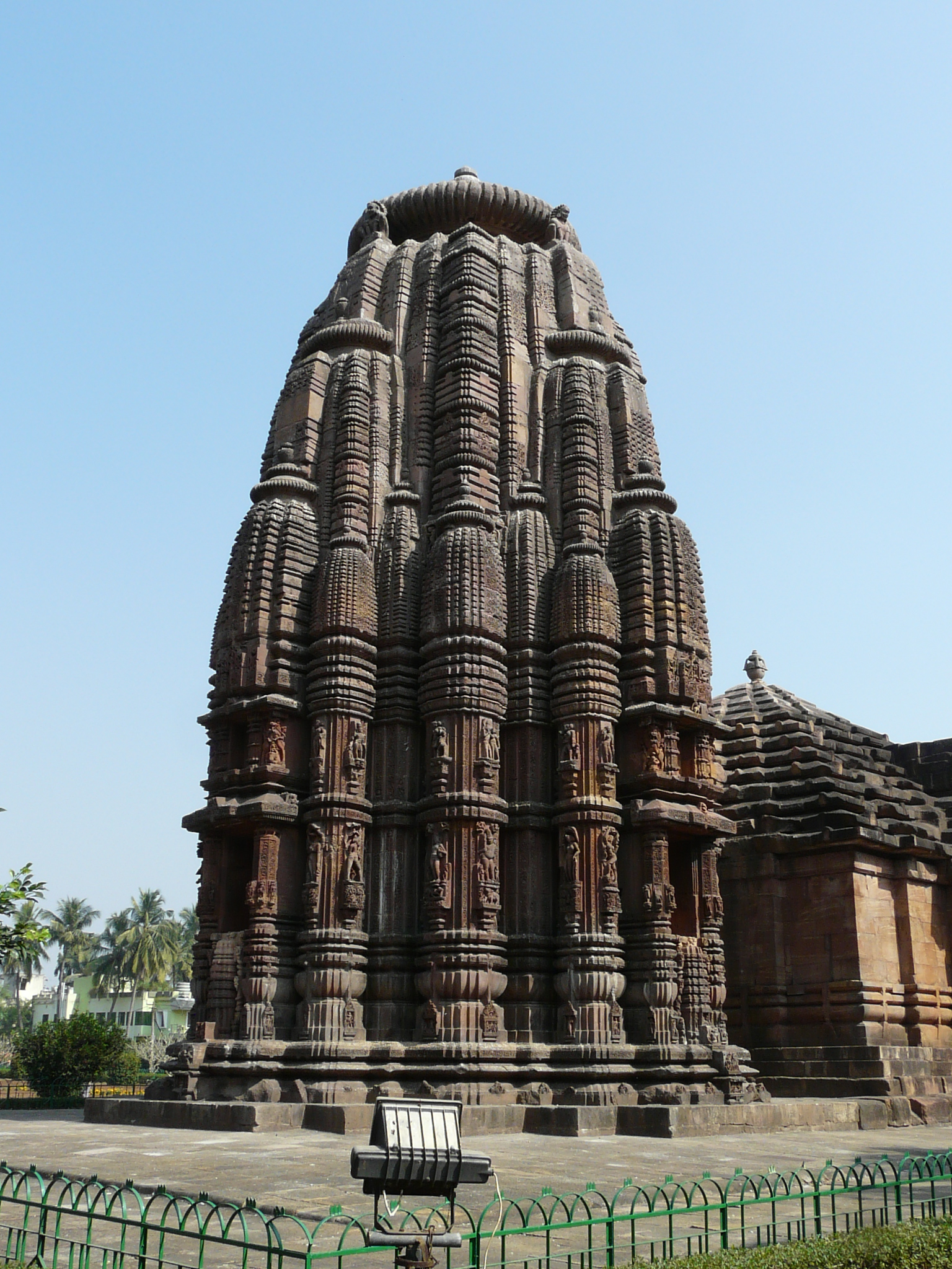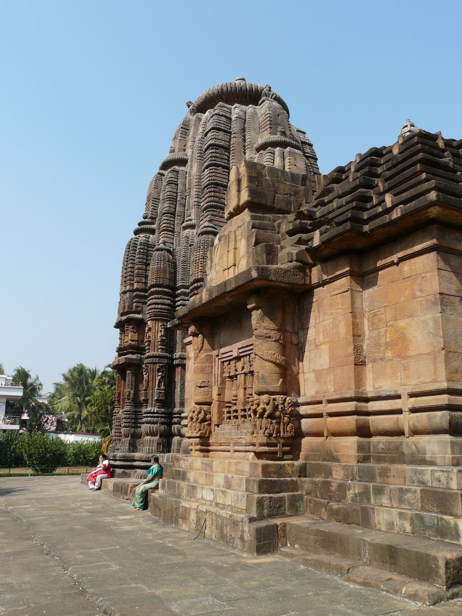 This temple from the early-11th c is contemporaneous with Siddheahwar, but the sanctuary exterior and tower (Rekha Deul) are much more profusely sculpted. The interior walls of the sanctum are not set in a simple rectangular plan like most other Odia temples, but instead have many offsets (exterior link). This is reflected in offsets in the exterior walls of the sanctum as well, giving the structure a star-like shape. On the tower above, these offsets rise to form half-tower imitations of the central tower design, and surround the central tower structure at diminishing heights. This makes for an overall tower design that is compound and complex, and in many ways resembles the towers of temples such as at Khajuraho.