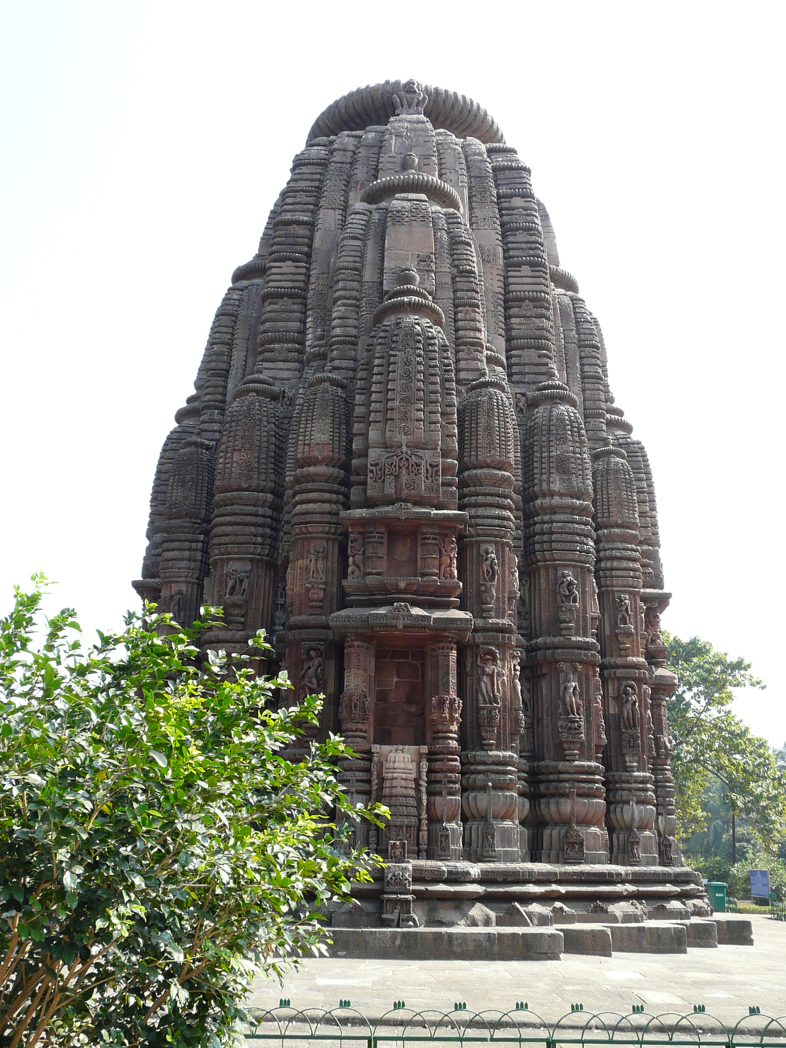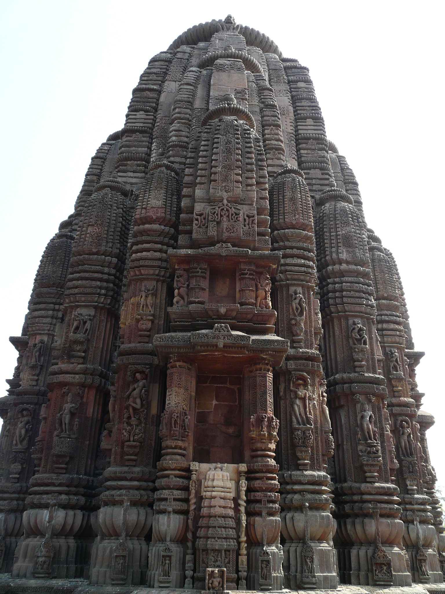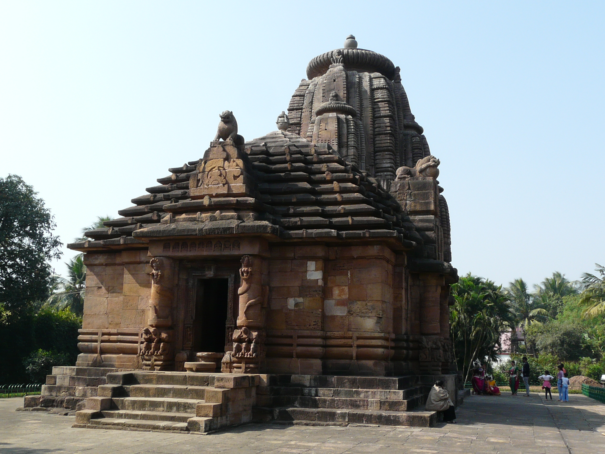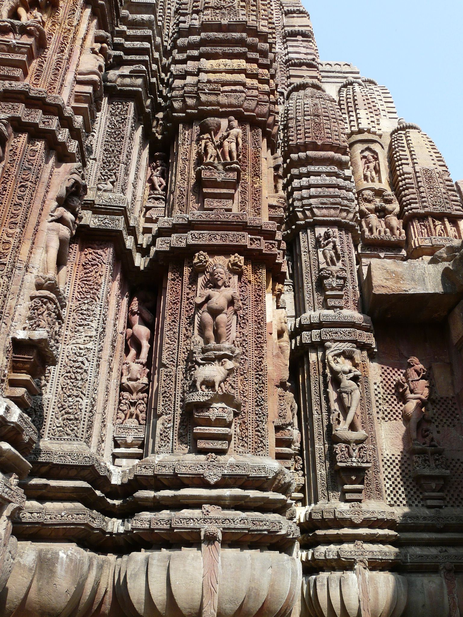 This temple from the early-11th c is contemporaneous with Siddheahwar, but the sanctuary exterior and tower (Rekha Deul) are much more profusely sculpted. The interior walls of the sanctum are not set in a simple rectangular plan like most other Odia temples, but instead have many offsets (exterior link). This is reflected in offsets in the exterior walls of the sanctum as well, giving the structure a star-like shape. On the tower above, these offsets rise to form half-tower imitations of the central tower design, and surround the central tower structure at diminishing heights. This makes for an overall tower design that is compound and complex, and in many ways resembles the towers of temples such as at Khajuraho.