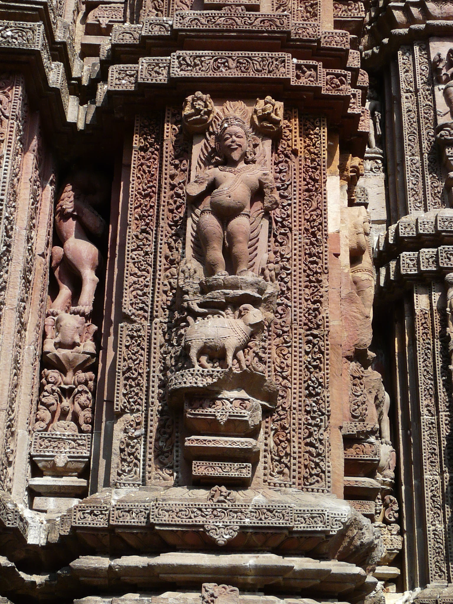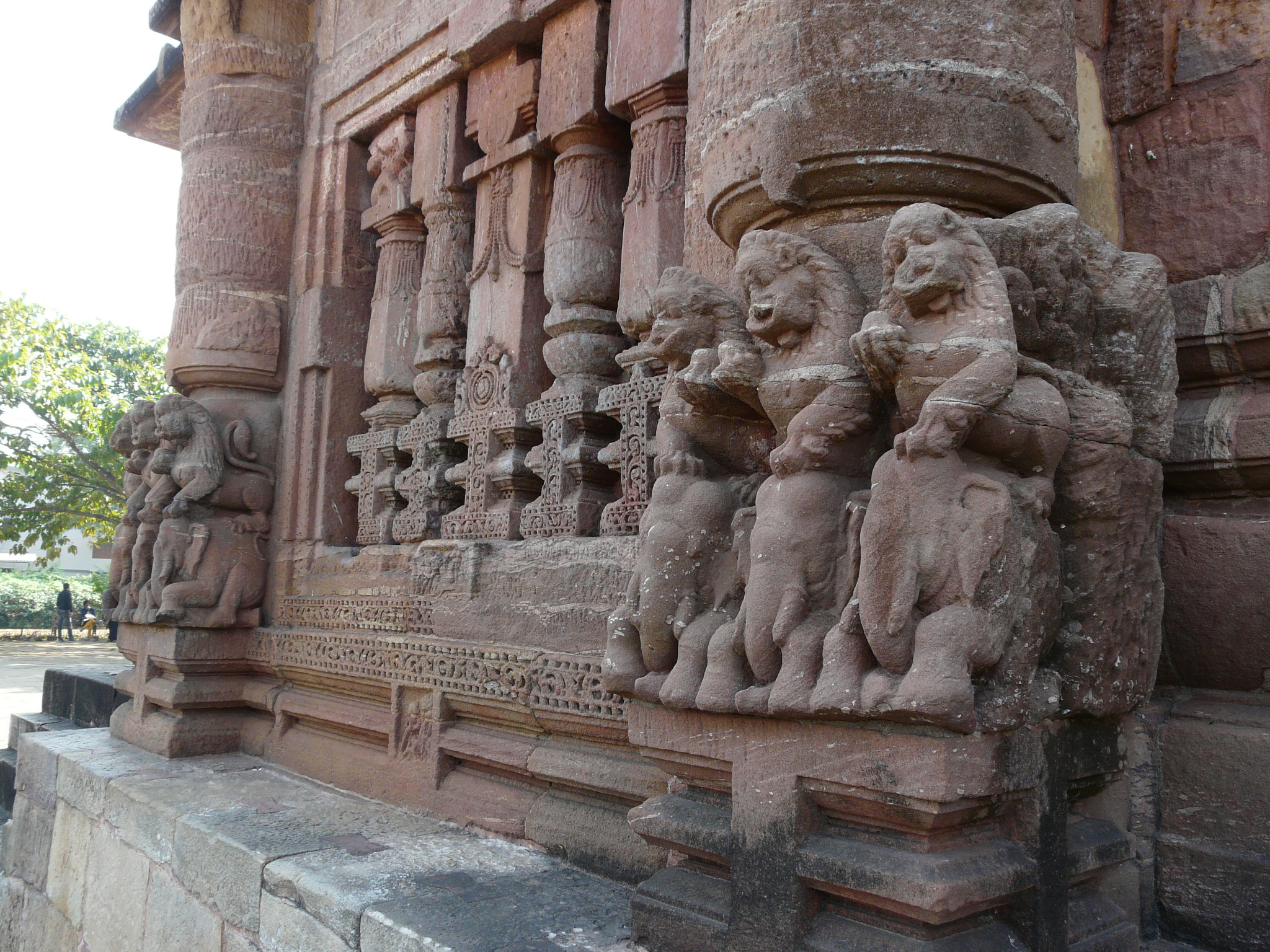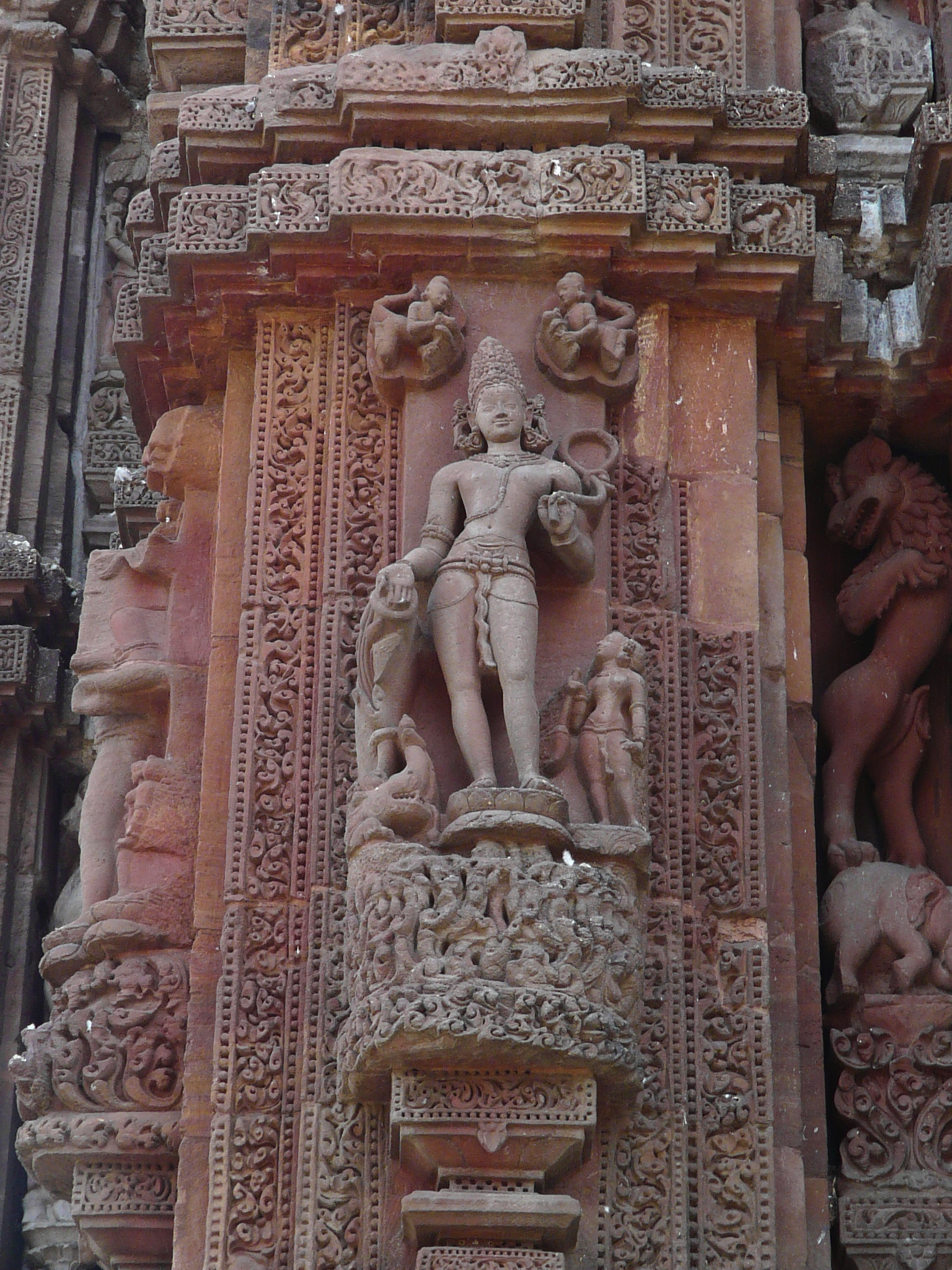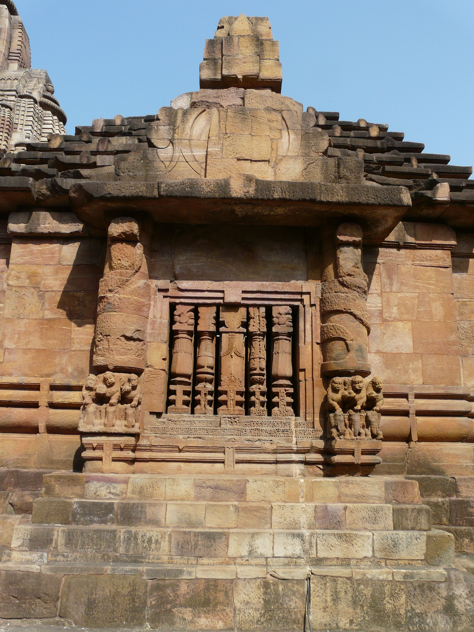 This temple from the early-11th c is contemporaneous with Siddheahwar, but the sanctuary exterior and tower (Rekha Deul) are much more profusely sculpted. The interior walls of the sanctum are not set in a simple rectangular plan like most other Odia temples, but instead have many offsets (exterior link). This is reflected in offsets in the exterior walls of the sanctum as well, giving the structure a star-like shape. On the tower above, these offsets rise to form half-tower imitations of the central tower design, and surround the central tower structure at diminishing heights. This makes for an overall tower design that is compound and complex, and in many ways resembles the towers of temples such as at Khajuraho.