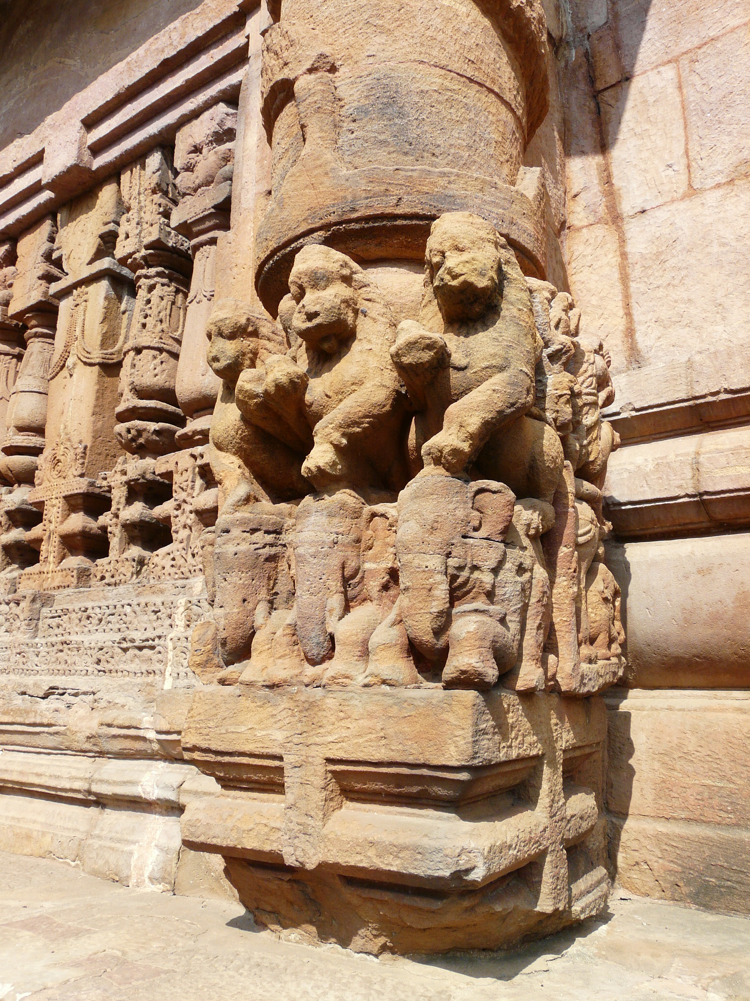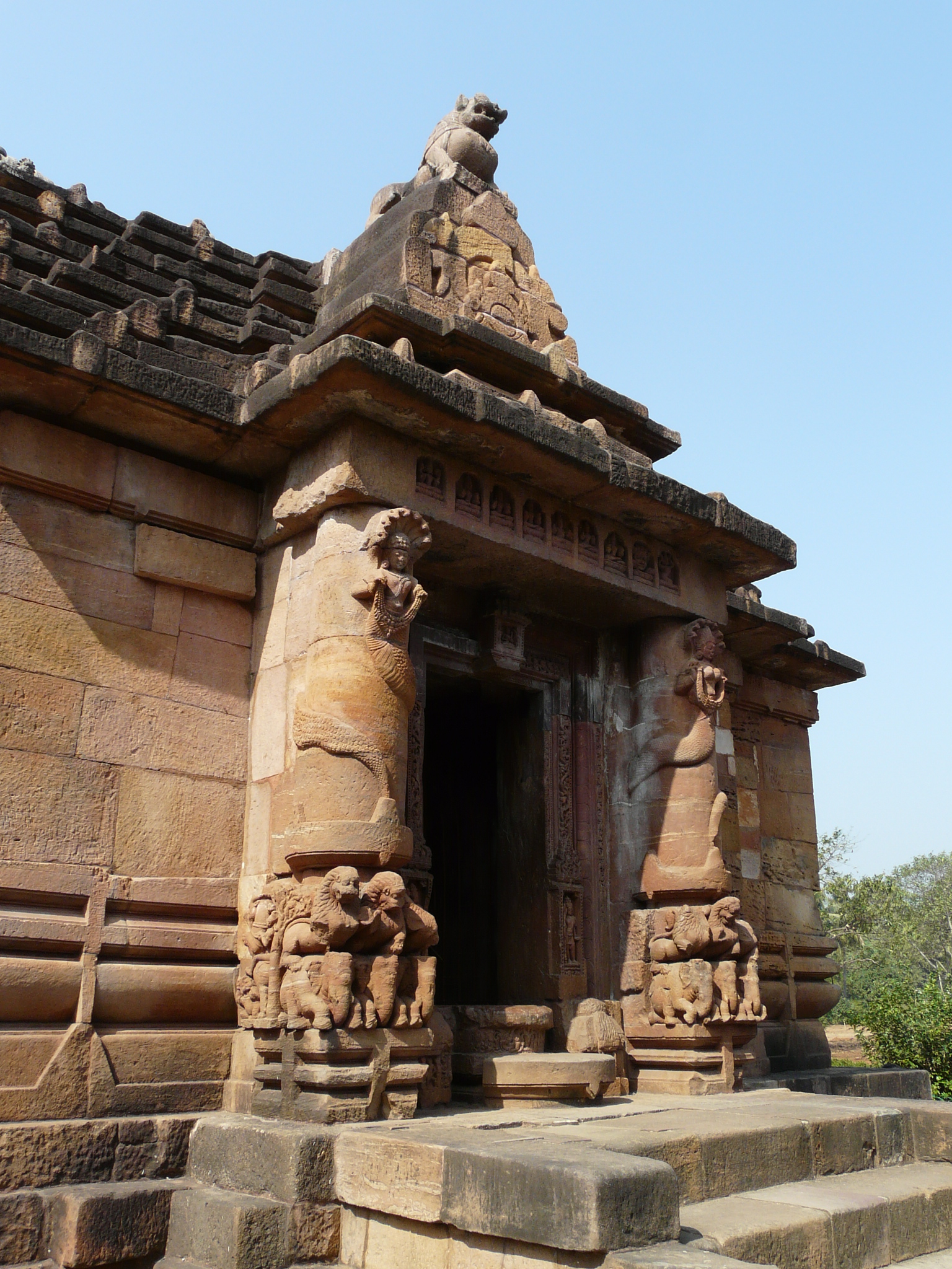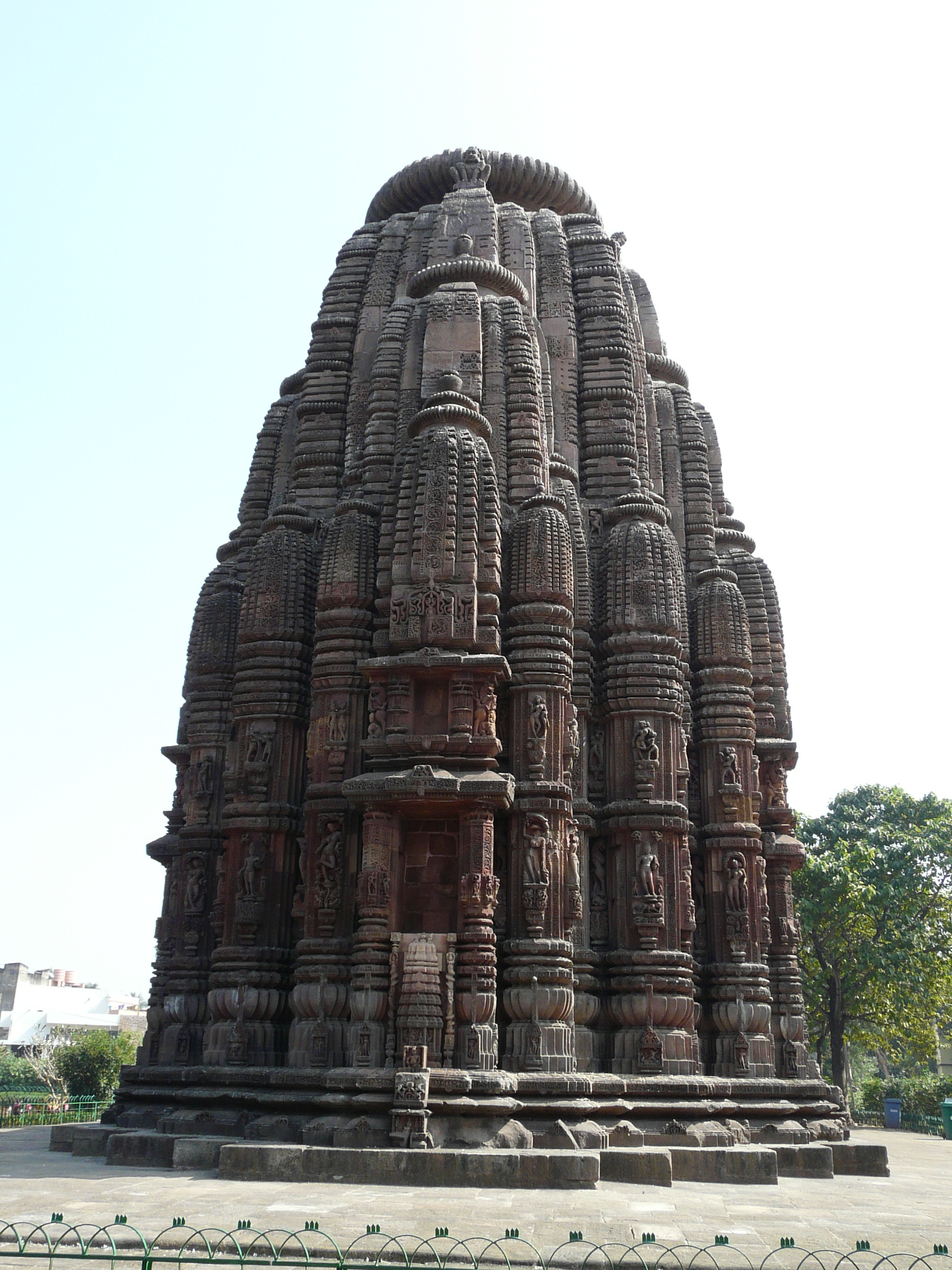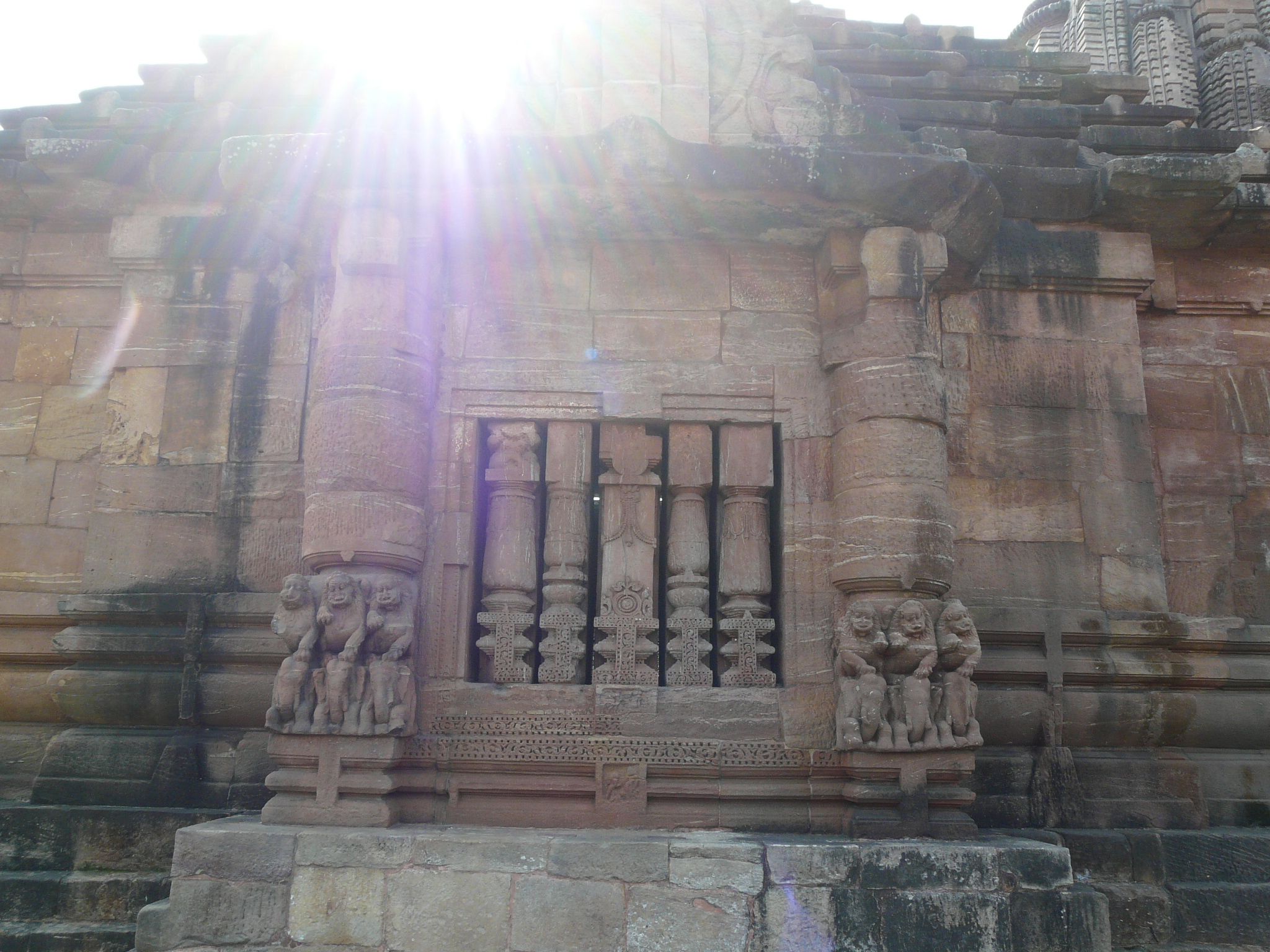 This temple from the early-11th c is contemporaneous with Siddheahwar, but the sanctuary exterior and tower (Rekha Deul) are much more profusely sculpted. The interior walls of the sanctum are not set in a simple rectangular plan like most other Odia temples, but instead have many offsets (exterior link). This is reflected in offsets in the exterior walls of the sanctum as well, giving the structure a star-like shape. On the tower above, these offsets rise to form half-tower imitations of the central tower design, and surround the central tower structure at diminishing heights. This makes for an overall tower design that is compound and complex, and in many ways resembles the towers of temples such as at Khajuraho.