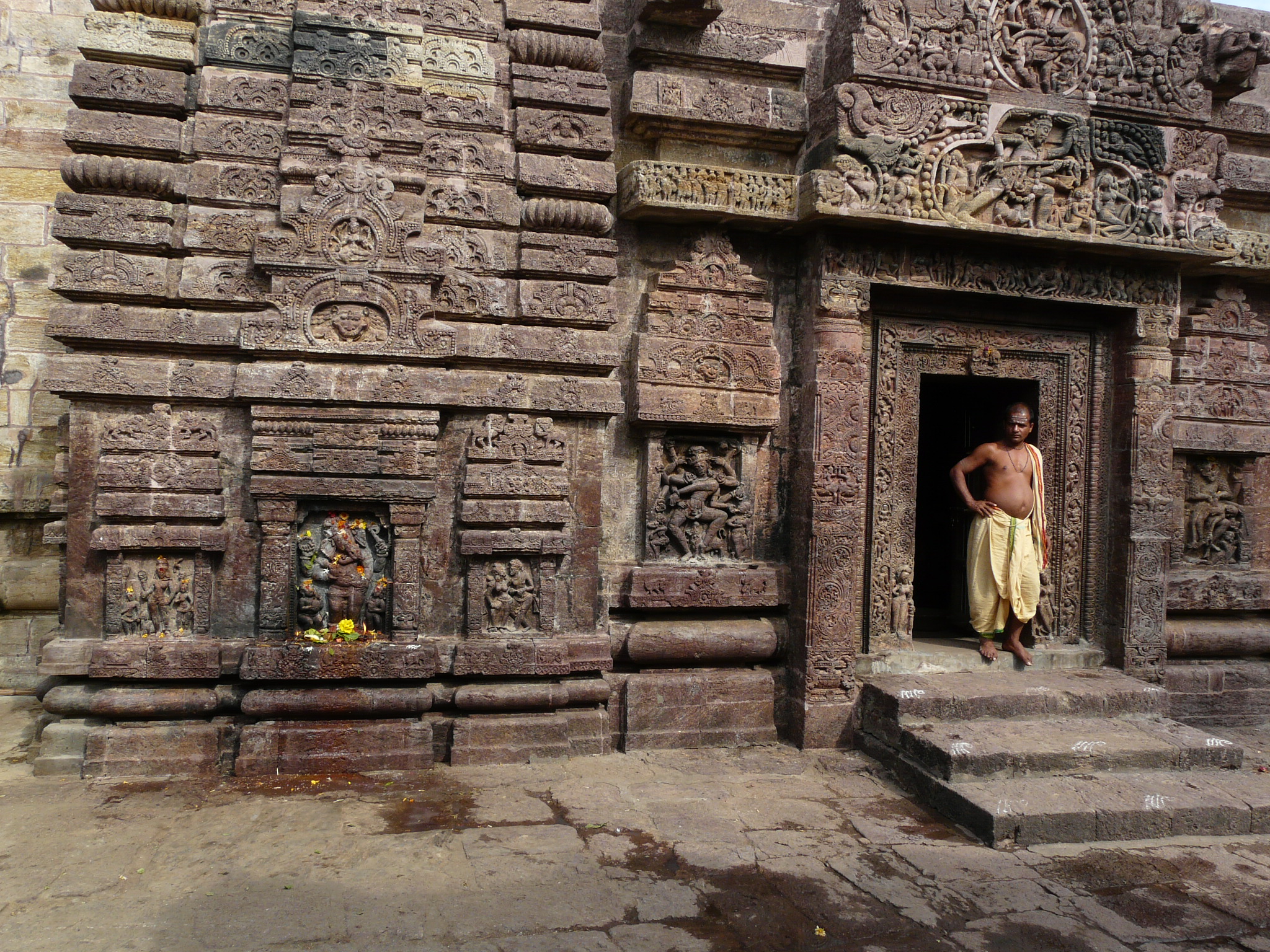 While the mandap’s outer walls are covered with sculpture, the main sanctum tower is relatively plain and bare. The difference in the treatment of the mandap and sanctum exterior is so stark that I’m tempted to think that the sanctum as it exists is a later addition, and that there was once an original sanctum that corresponded more to the sanctum structure of the Vaital Deul temple. Also, in the Madhukeshwar temple, the first entry gateway to the compound, the main doorway of the mandap, as well as shrines located along the enclosure walls are all topped with three small amalakas, just like the rectangular sanctum tower of Vaital Deul. So I really wonder if Madhukeshwar once had a rectangular sanctum and Khakhara Deul style tower, similar to Vaital Deul, instead of the plain tower it has now! Of course this is pure speculation, and I haven’t gone deep enough into the study of these temples to do anything other than speculate, but I find it an interesting stylistic issue.