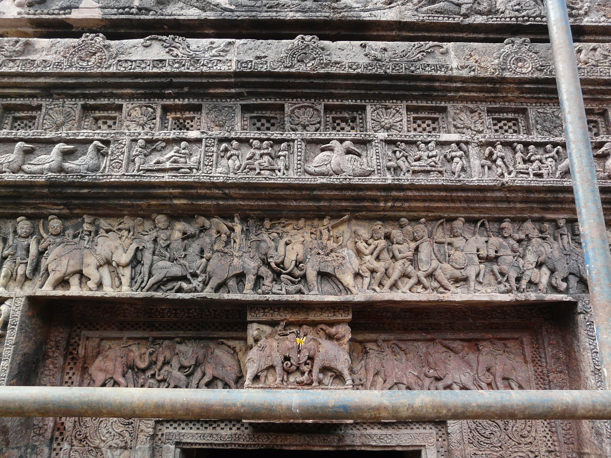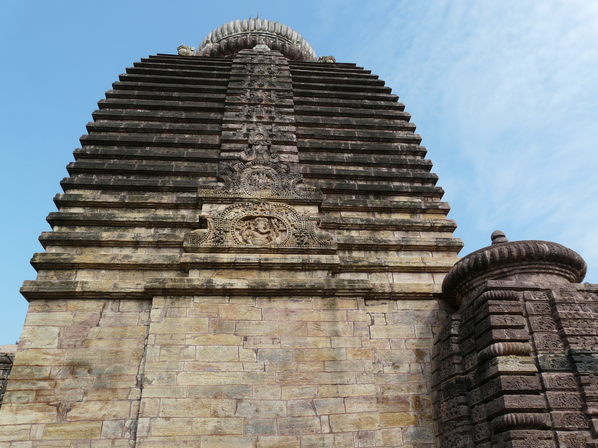 The contrast between the treatment of the mandap and sanctum/tower exterior is stark