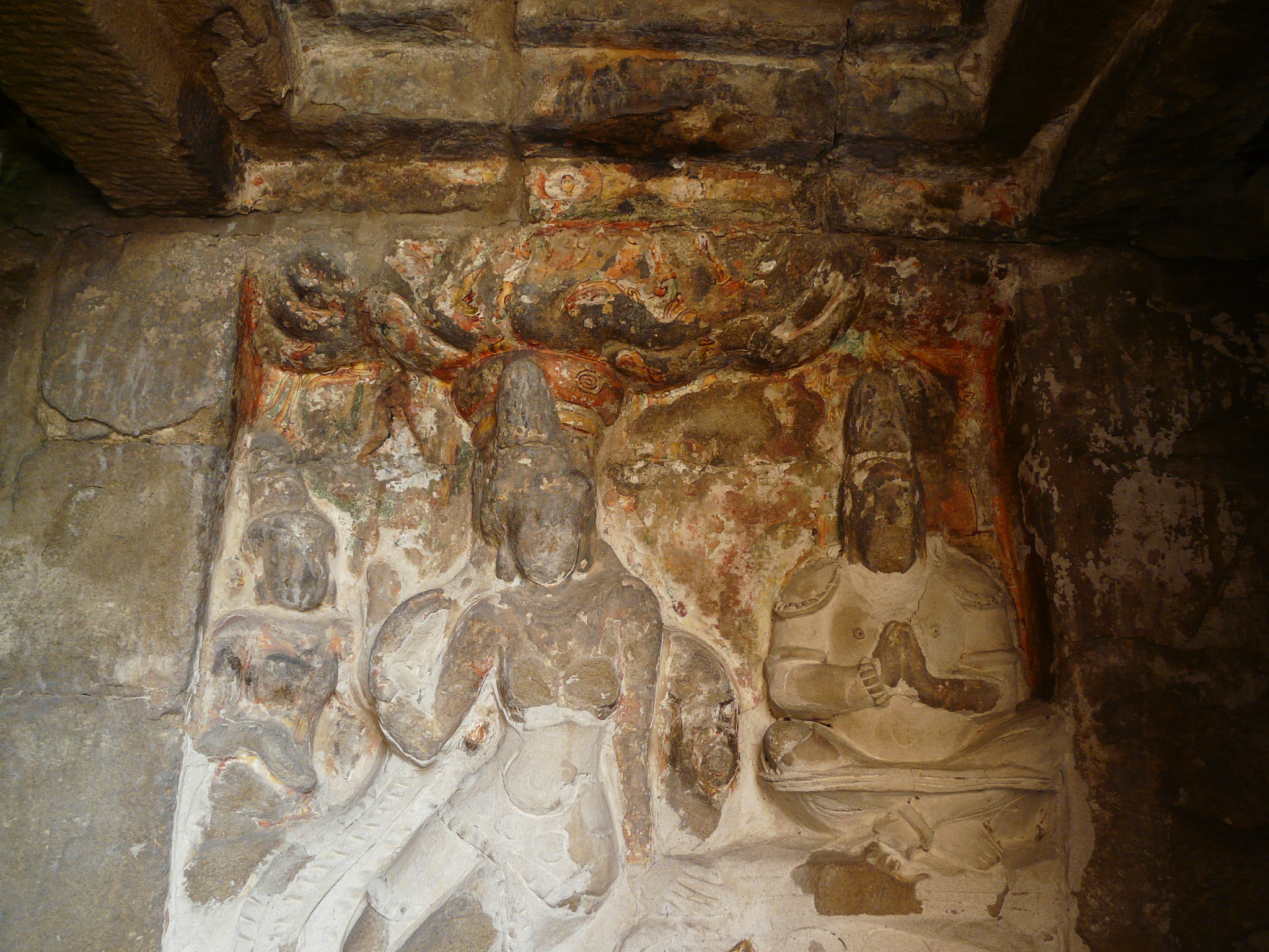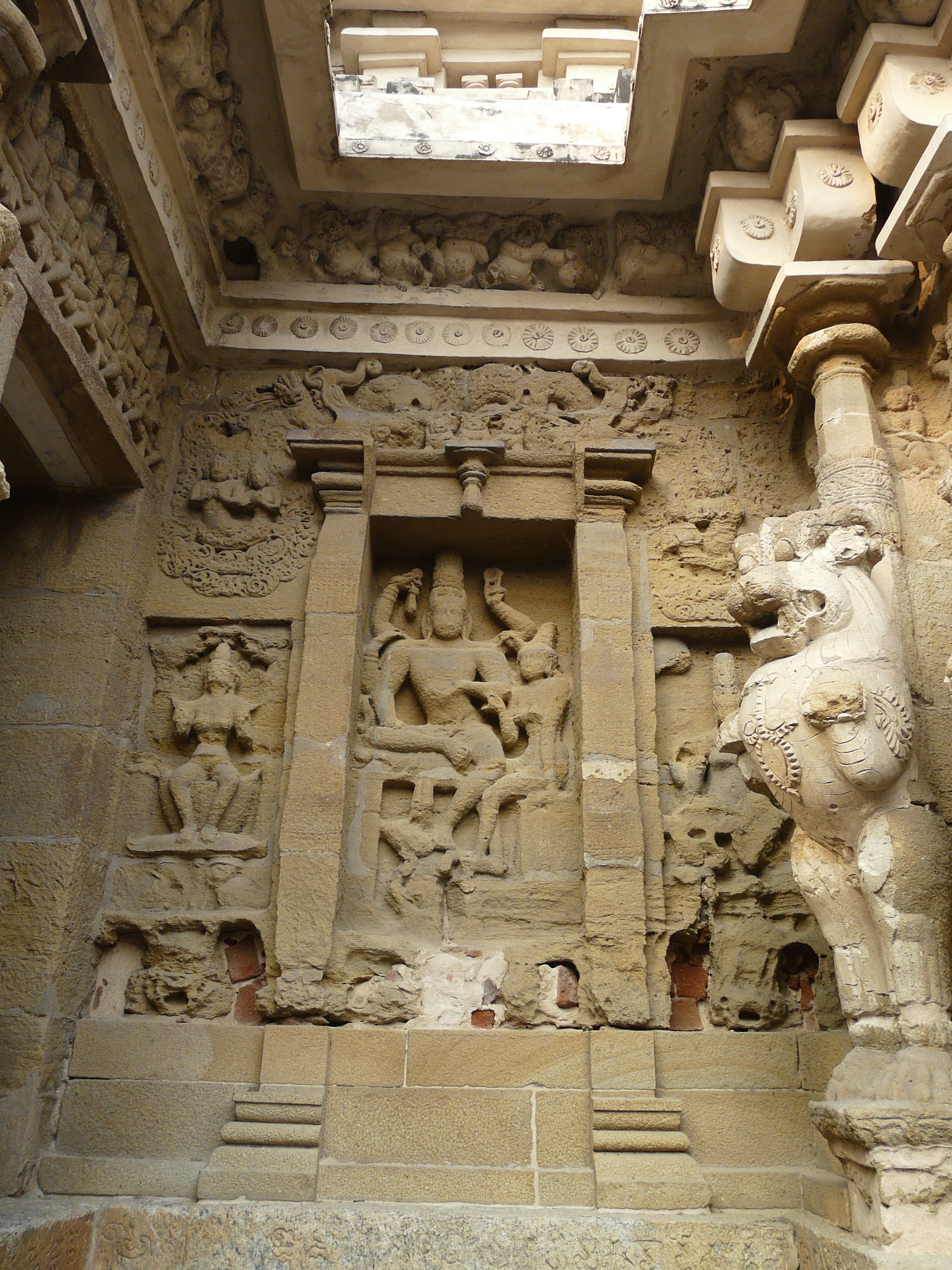 The mandapa (with sculpted walls covered in white plaster) was originally detached from the main temple sanctum (with pyramidal tower). The intermediate structure is a later addition and stylistically different