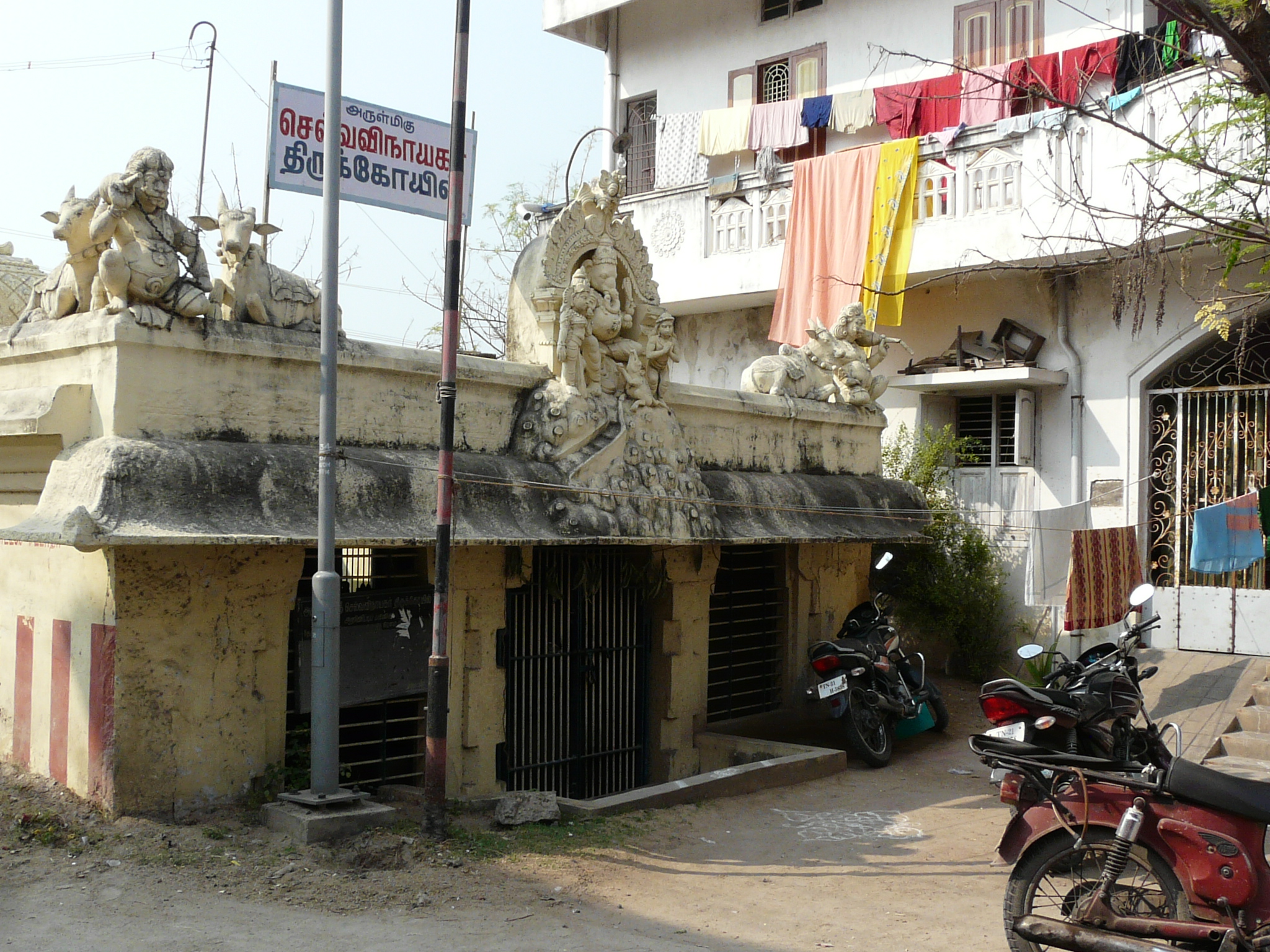 The road leading up to the western gopuram of the Vardaraja temple is lined with a fascinating array of colonial-style (and more traditional) residences, many with large Vaishnavite caste-marks on the buildings themselves. It seems like some of these buildings are being used as shrines.